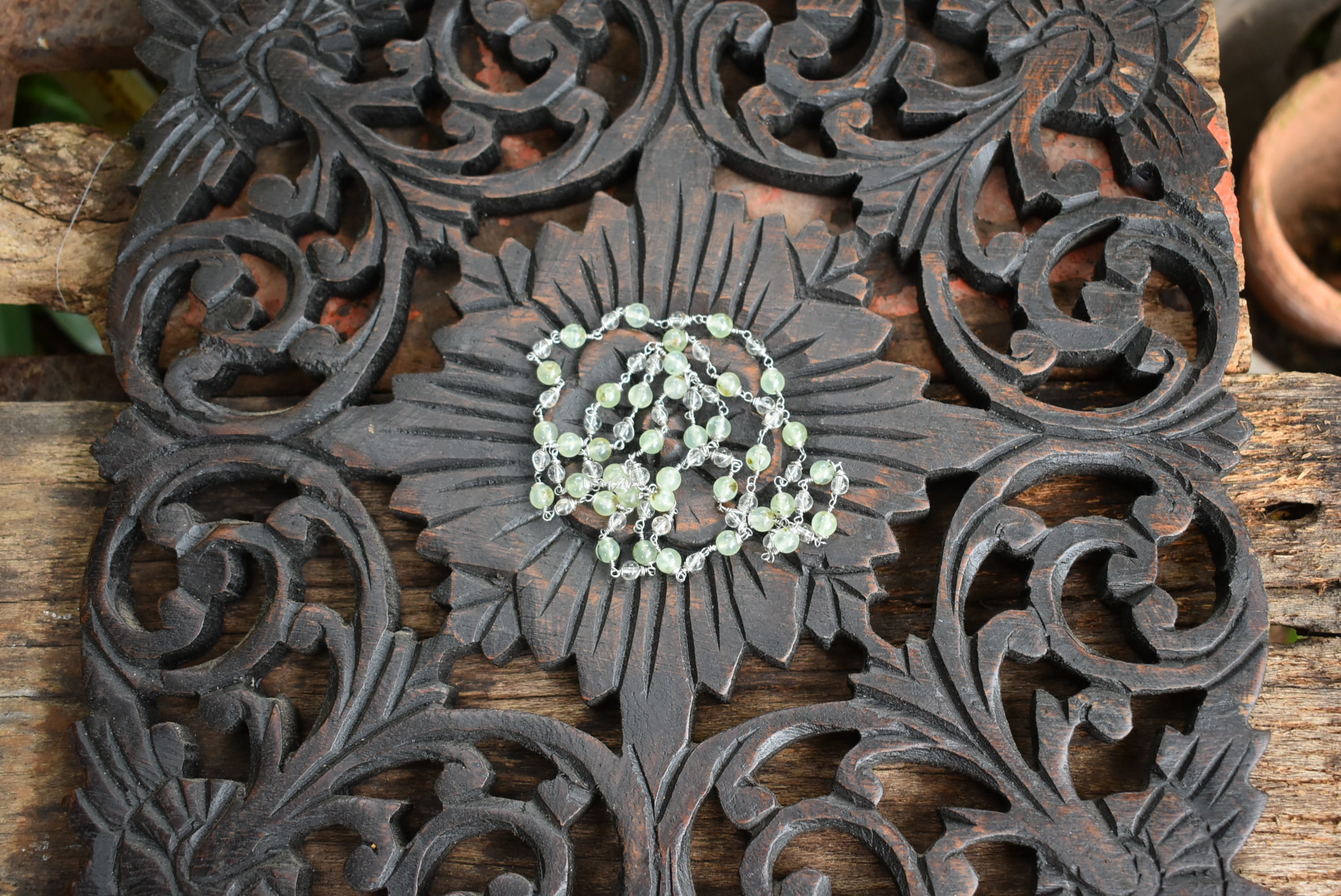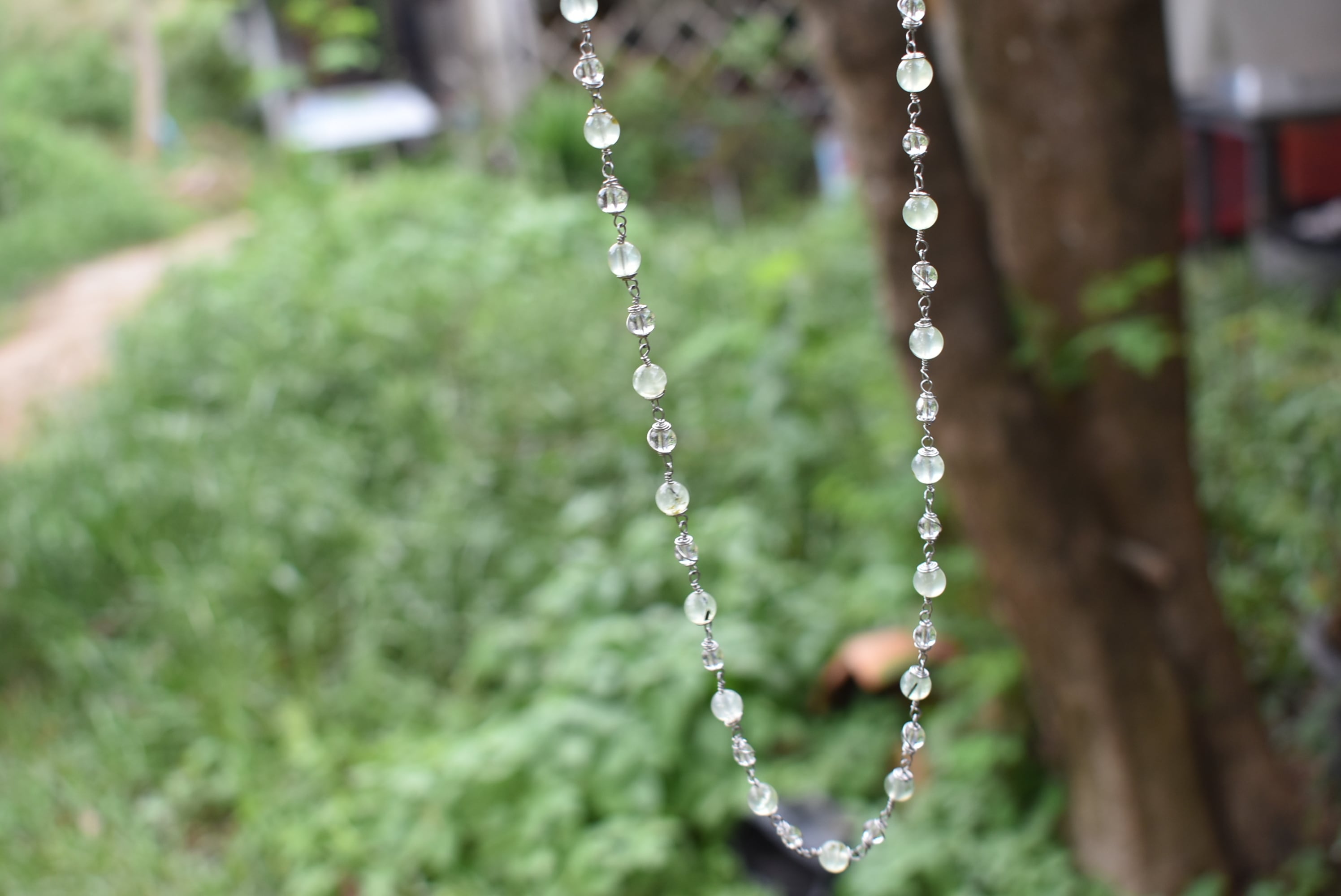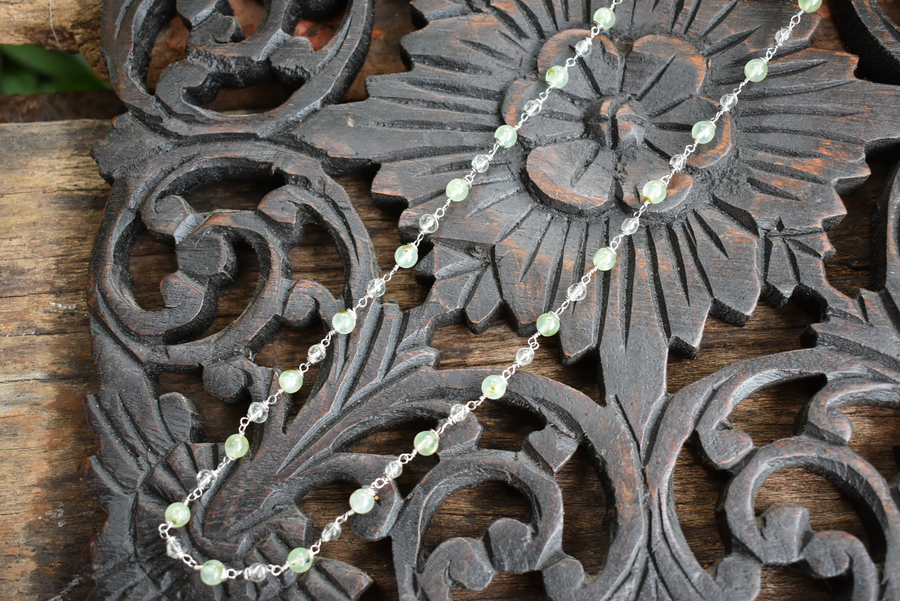 グリーンが優しいプレナイトビーズと透き通る水晶ビーズをひとつひとつ結び合わせて制作したワイヤービーズネックレス。