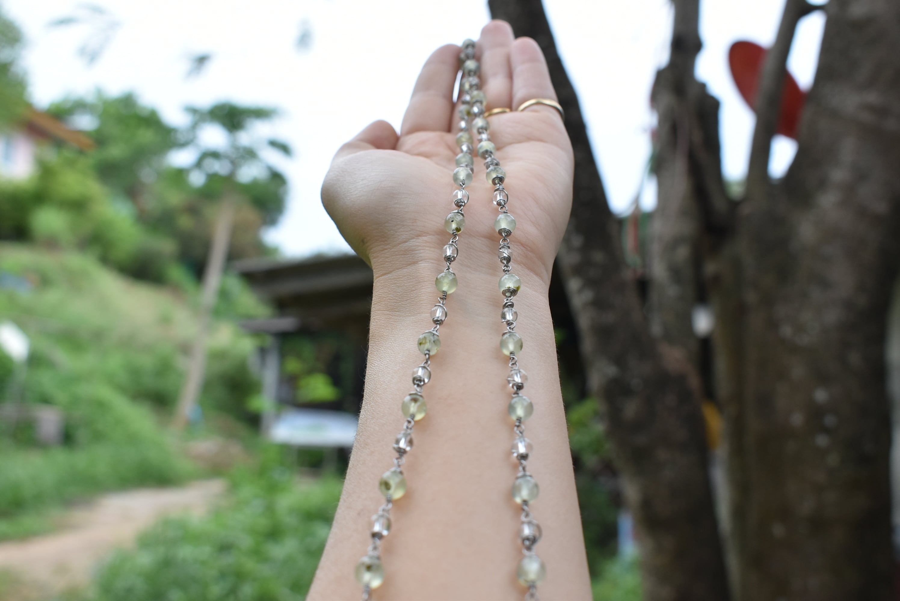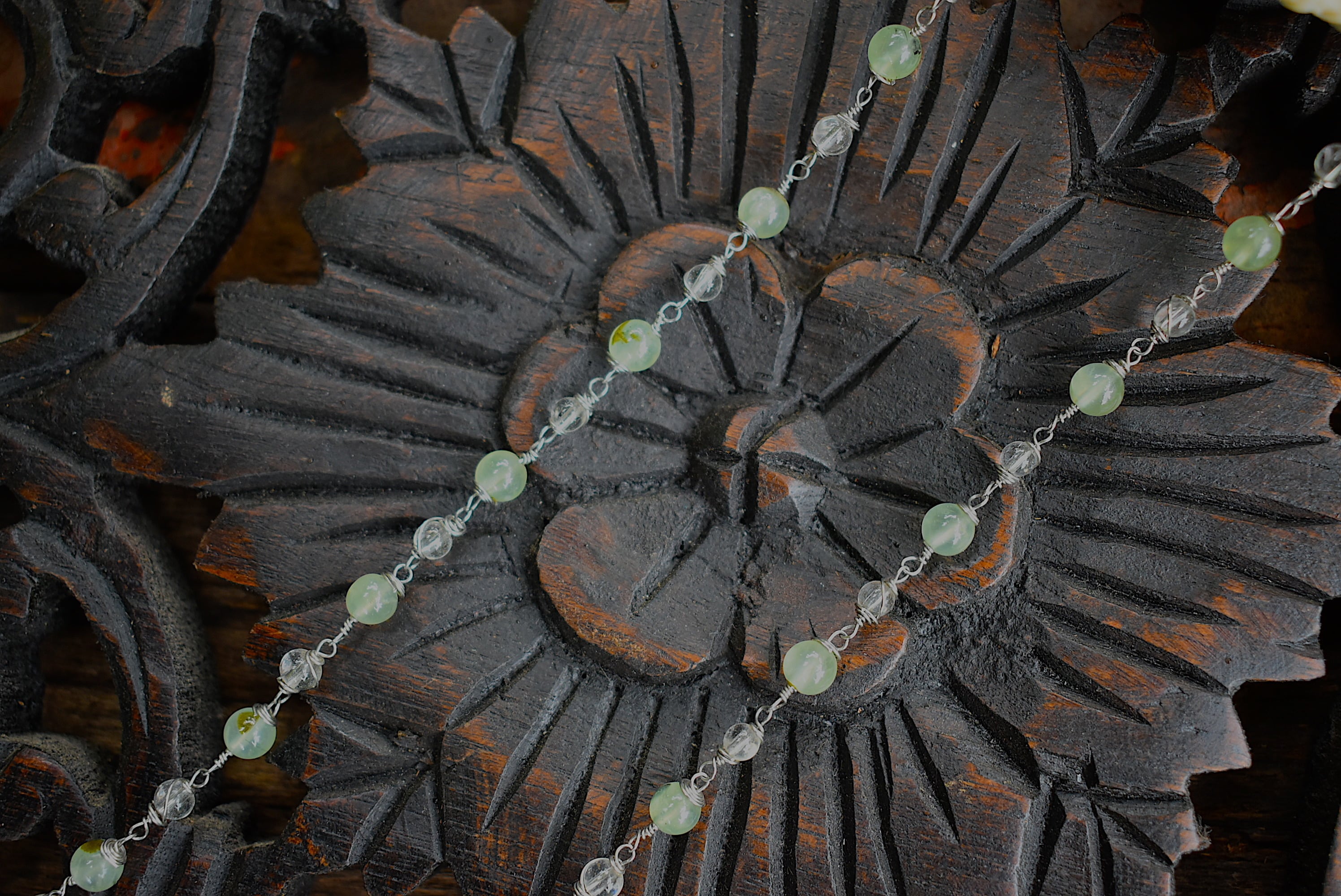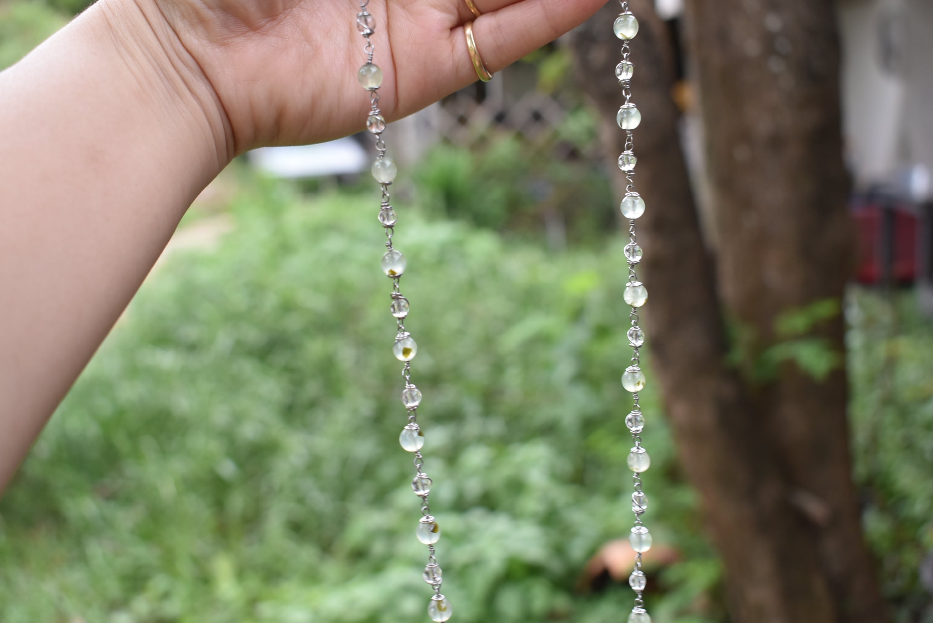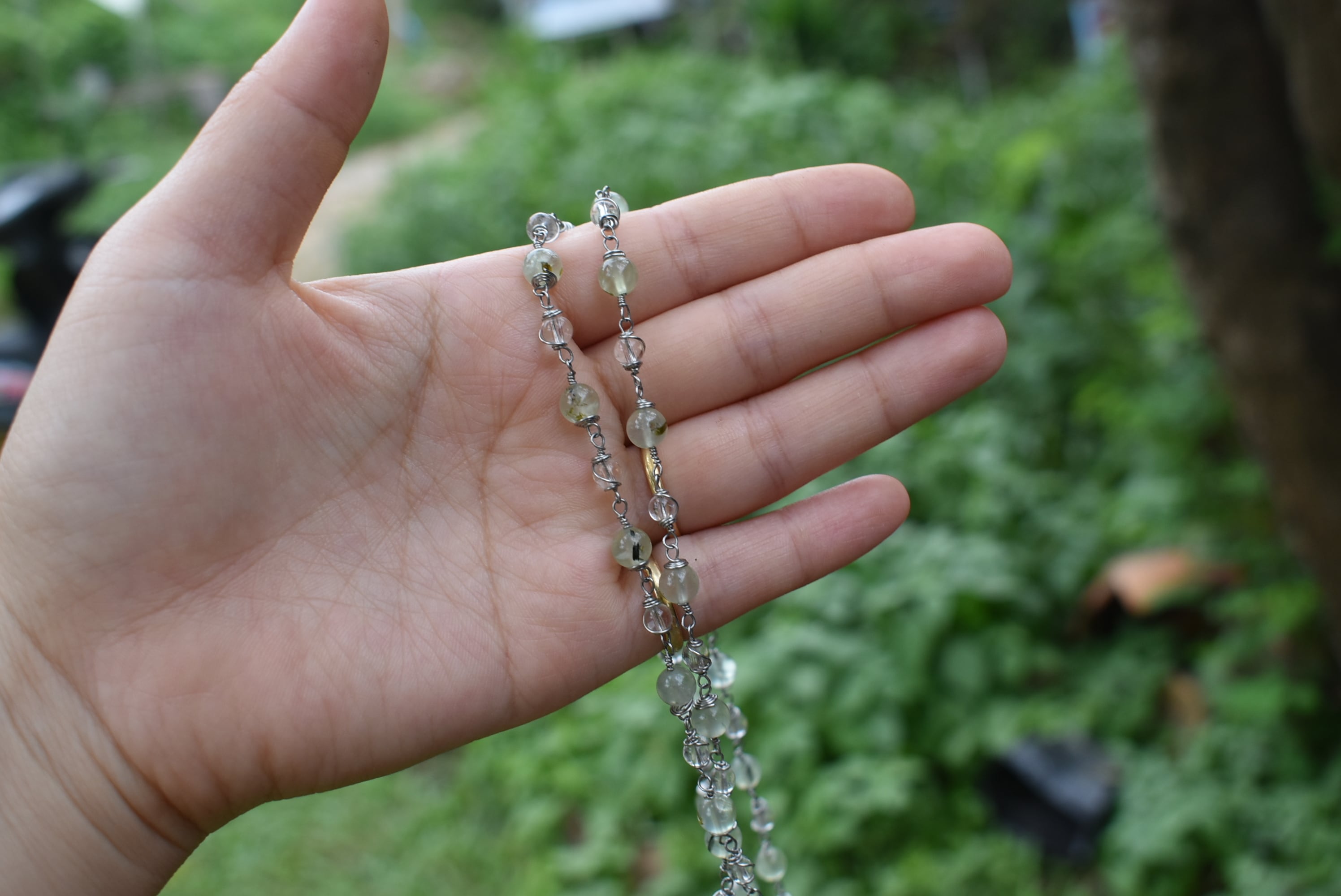 グリーンが優しいプレナイトビーズと透き通る水晶ビーズをひとつひとつ結び合わせて制作したワイヤービーズネックレス。