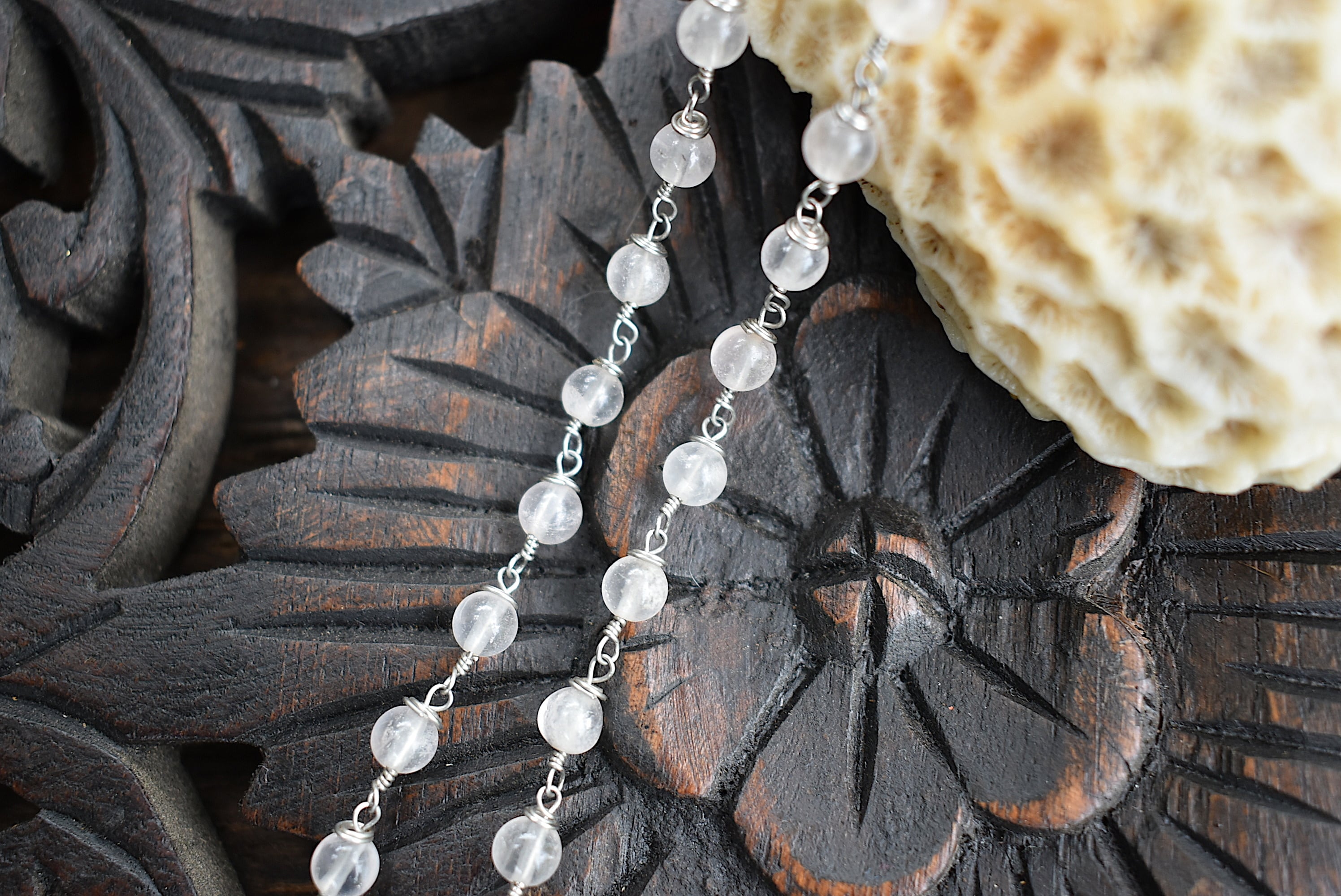 優しい色合いが特徴のミルキークォーツビーズを使用してひとつひとつを結び、