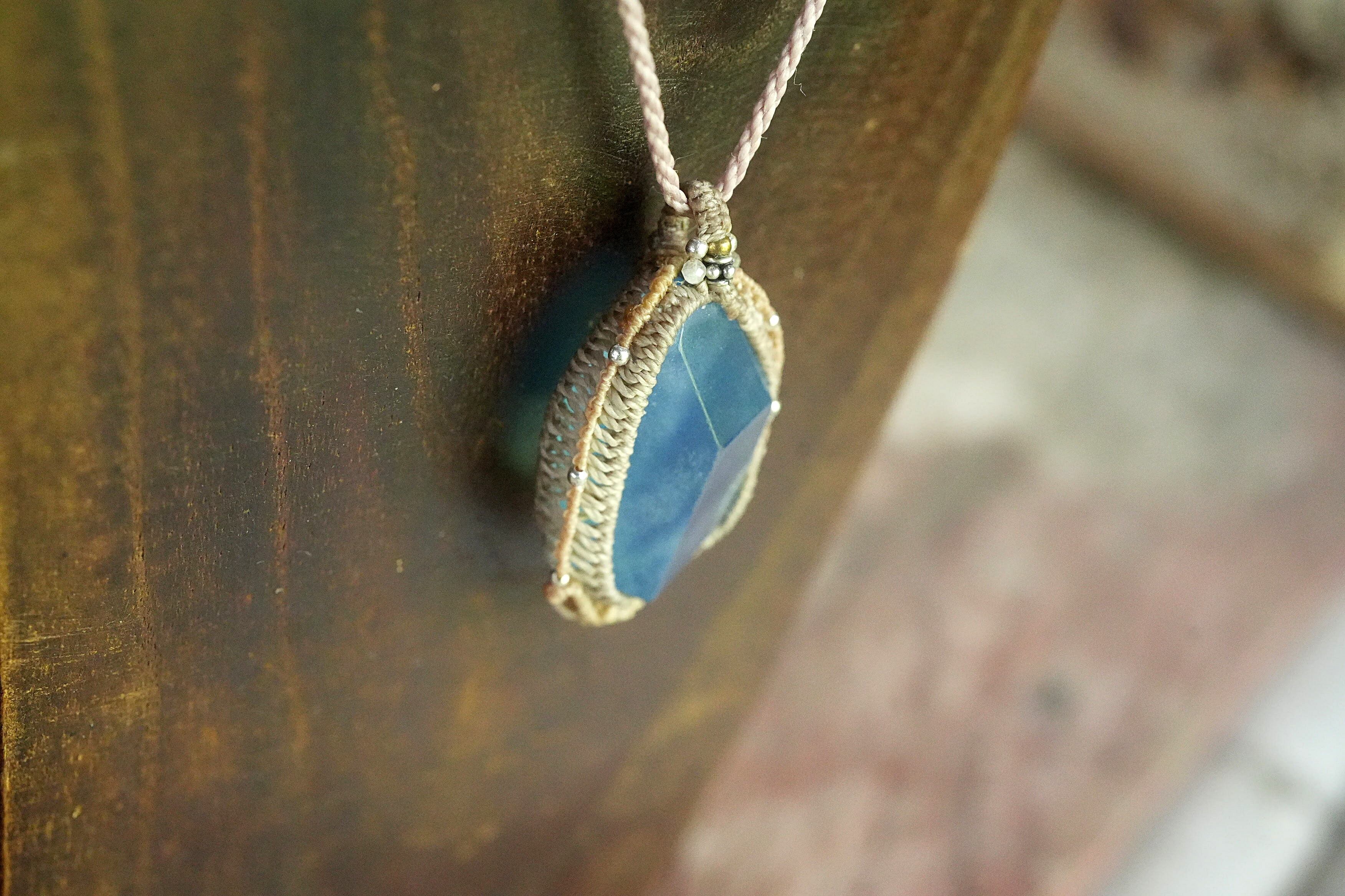 ◆このたびはキャラメル、キナリ色の蝋引き糸を使用しマクラメ編み装飾を施しました。