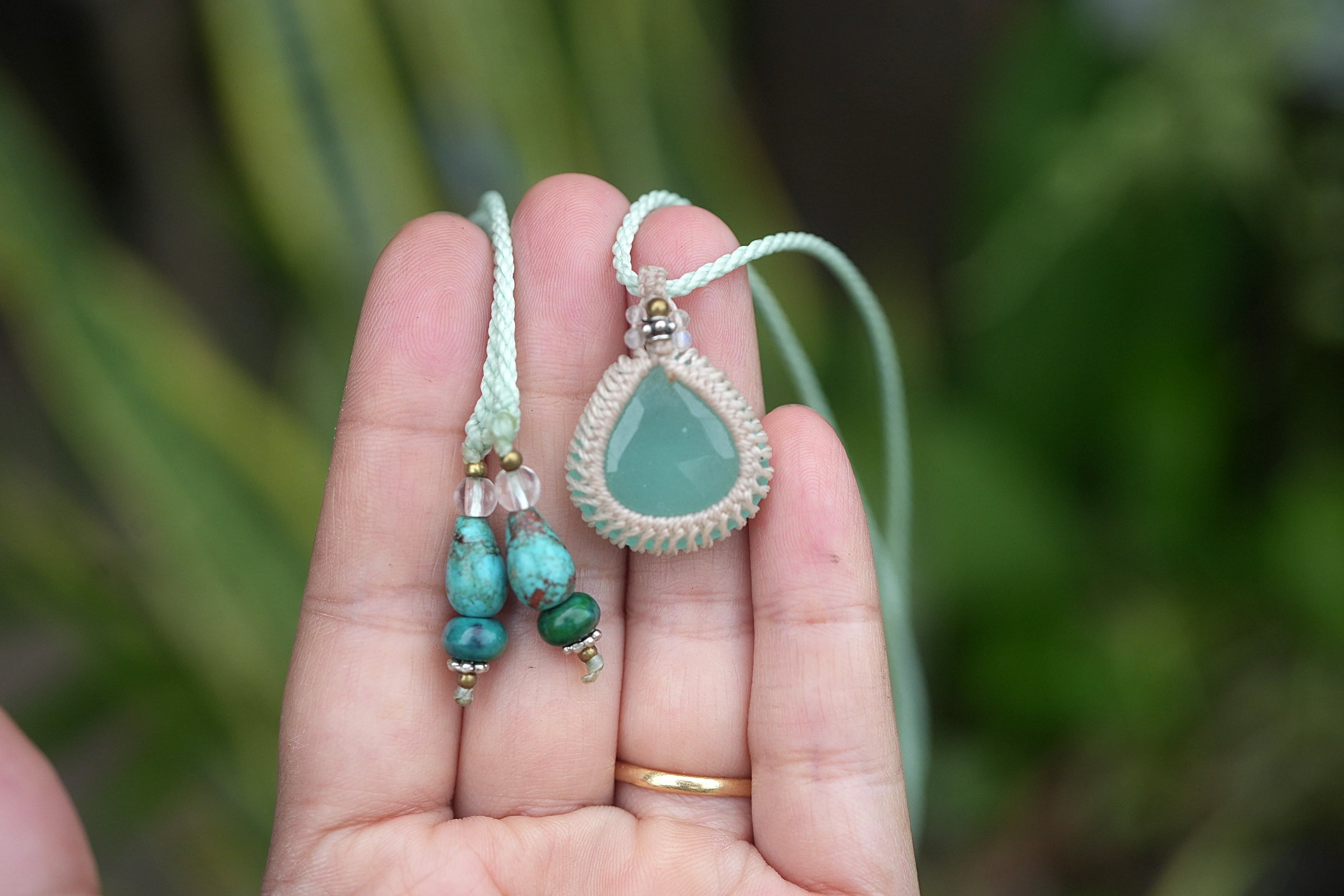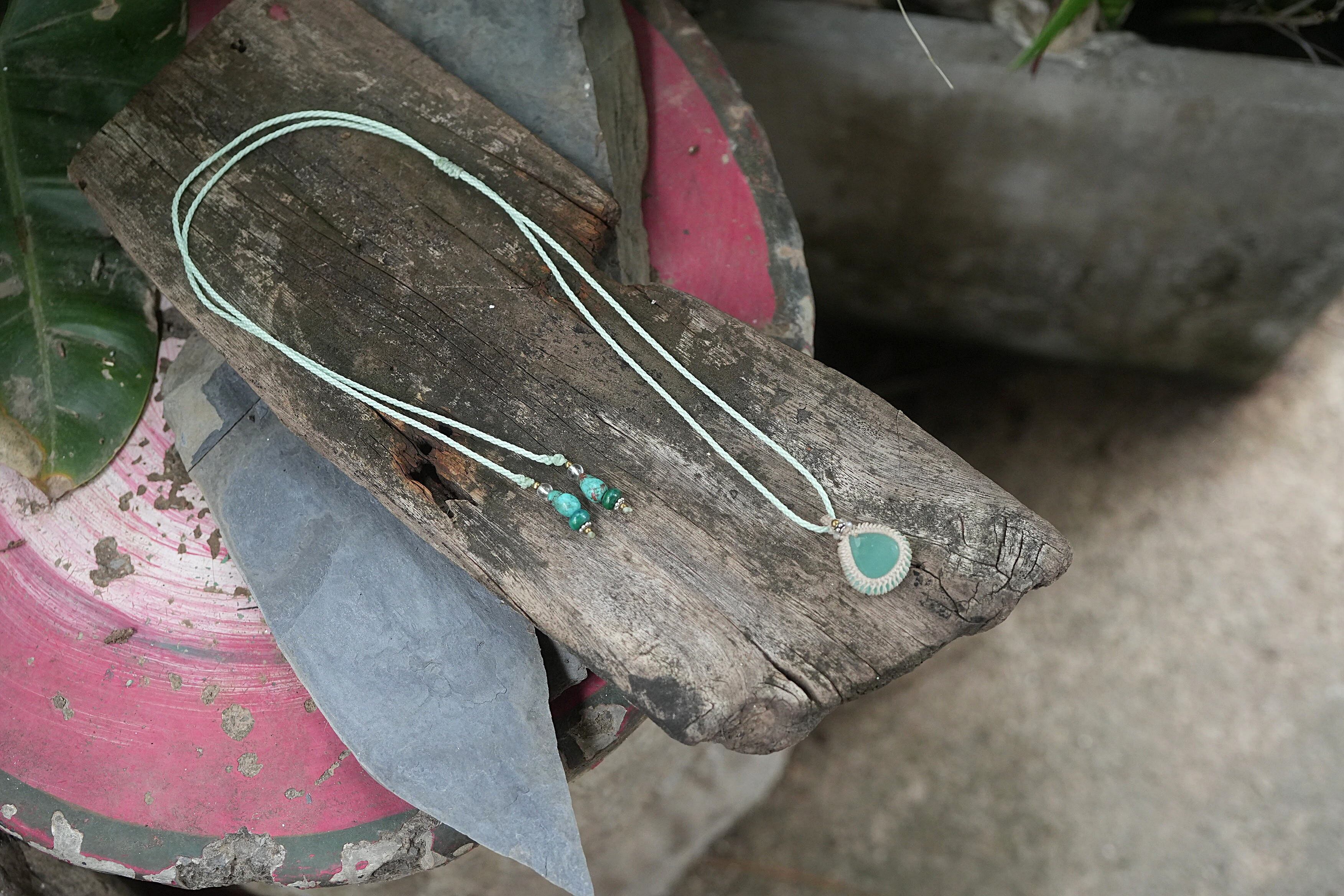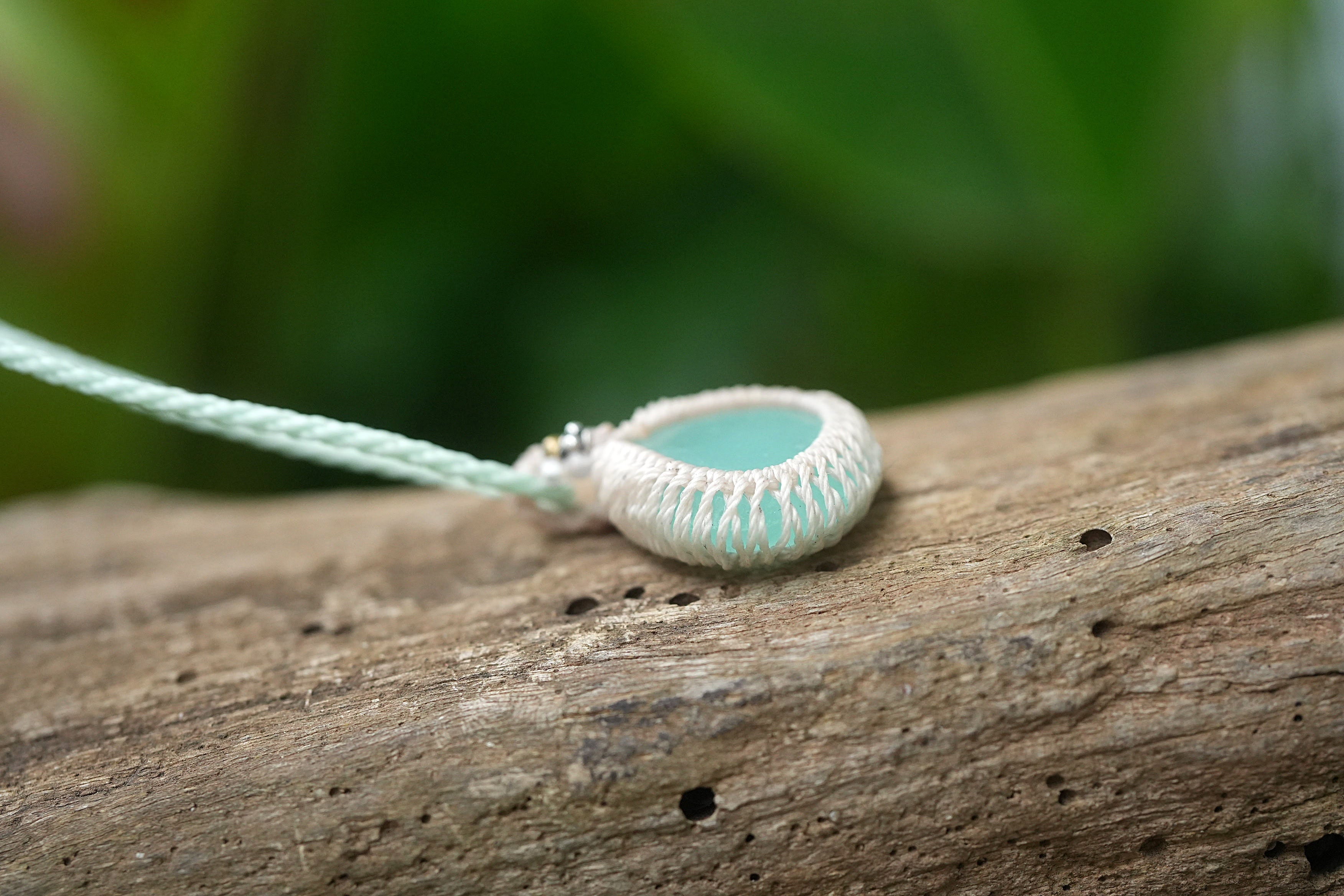 ◆このたびはナチュラルホワイト、ミント色の蝋引き糸を使用しマクラメ編み装飾を施しました。