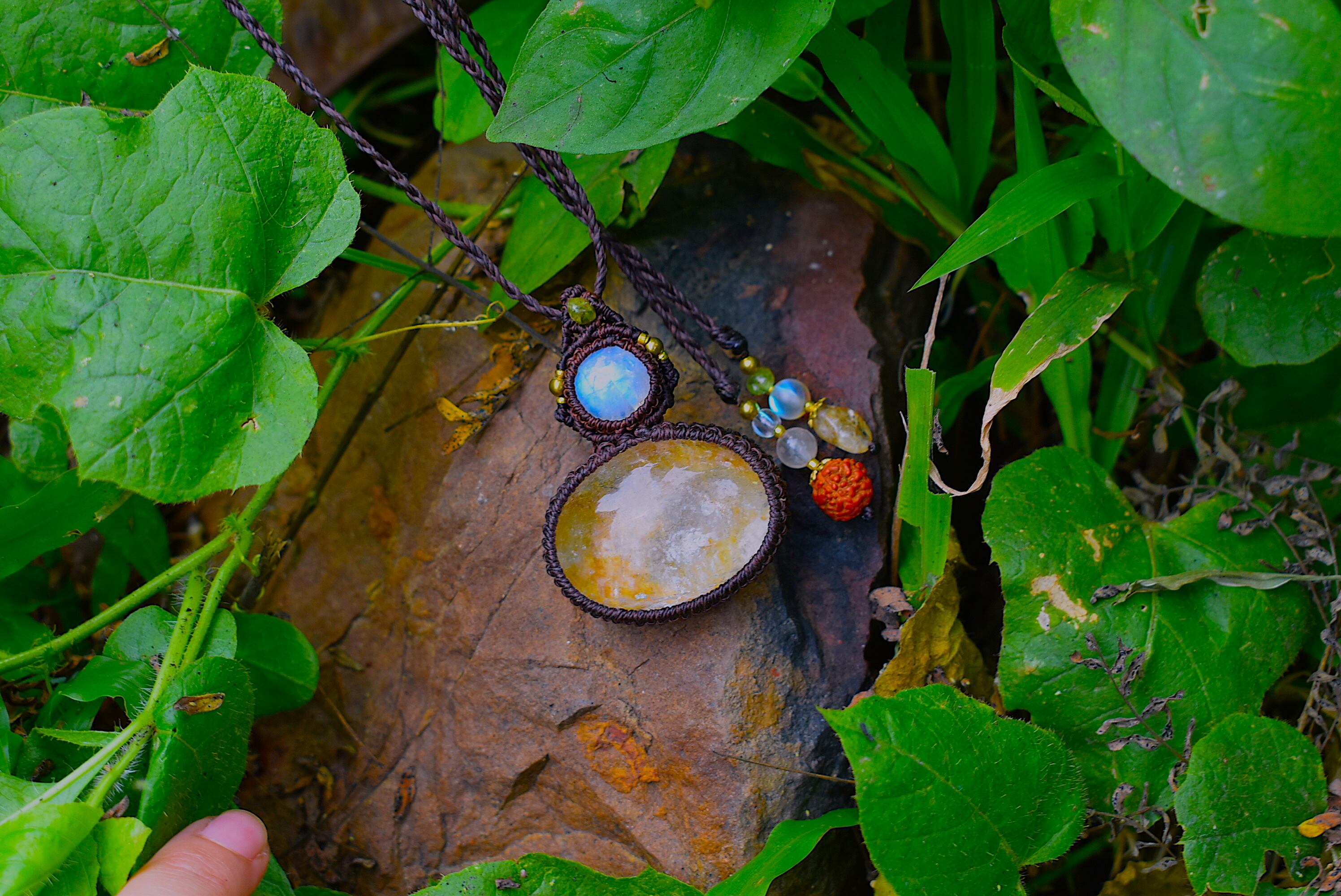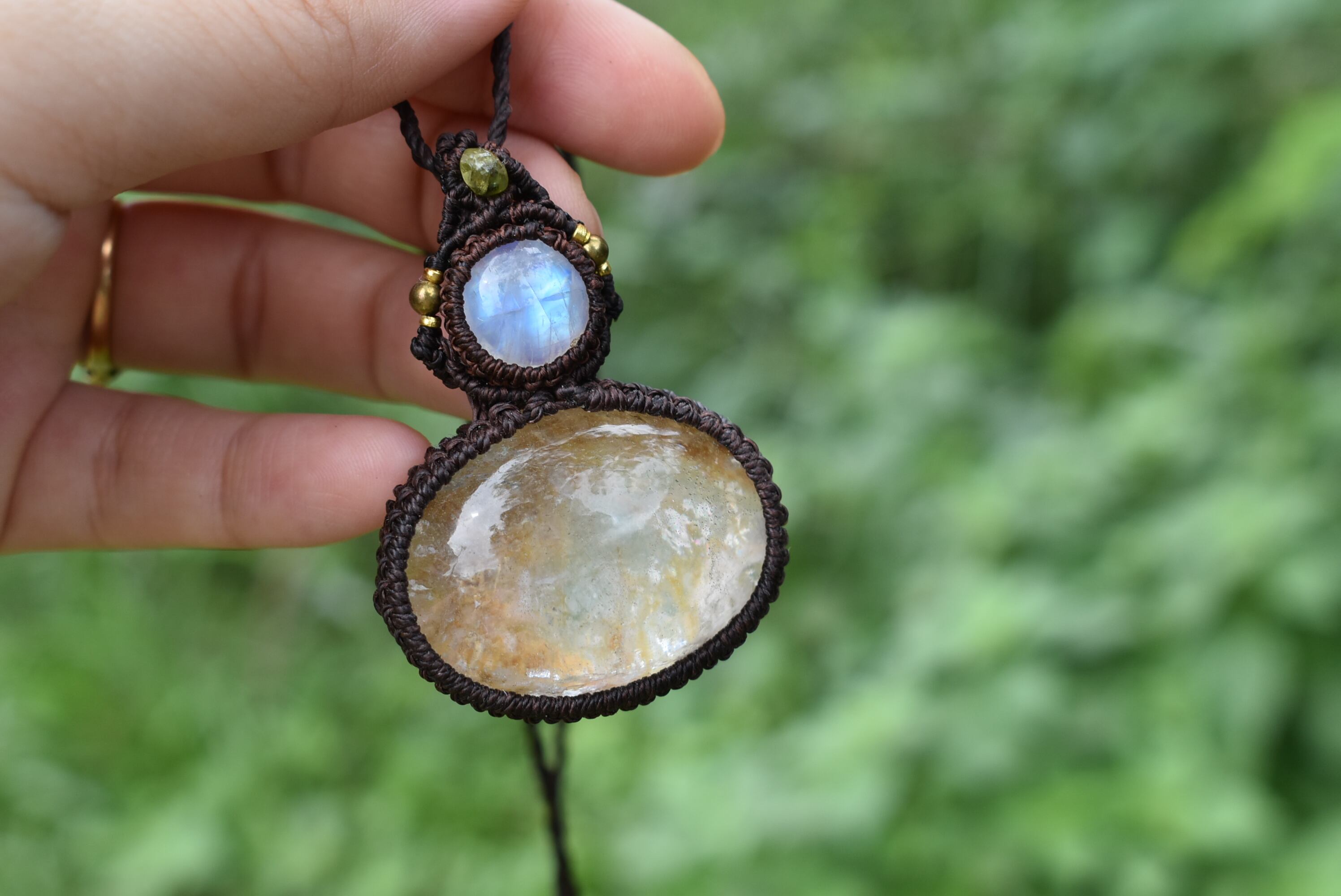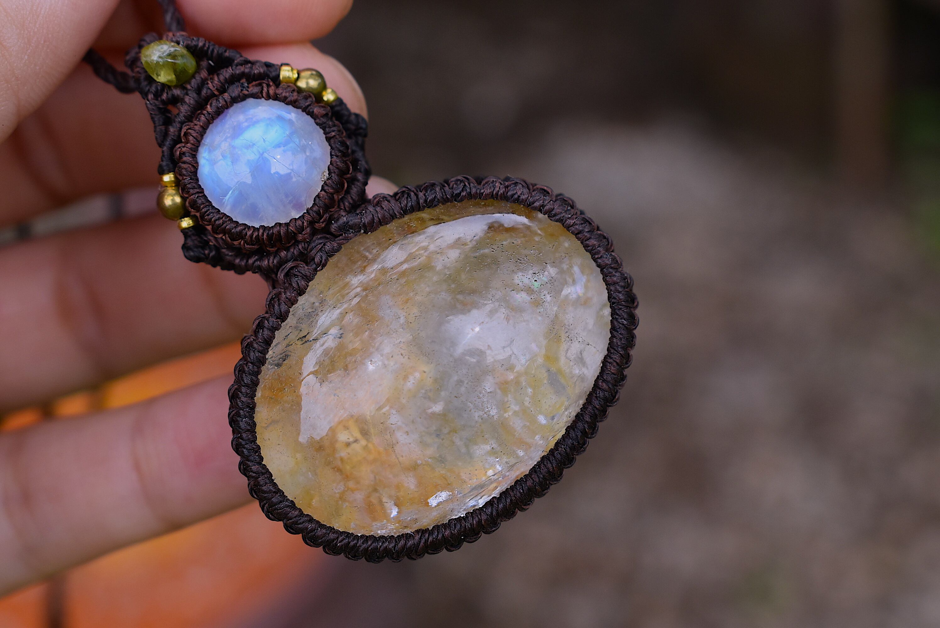輝くブルーシラー★ムーンストーンと黄金ガーデンクォーツ マクラメペンダント