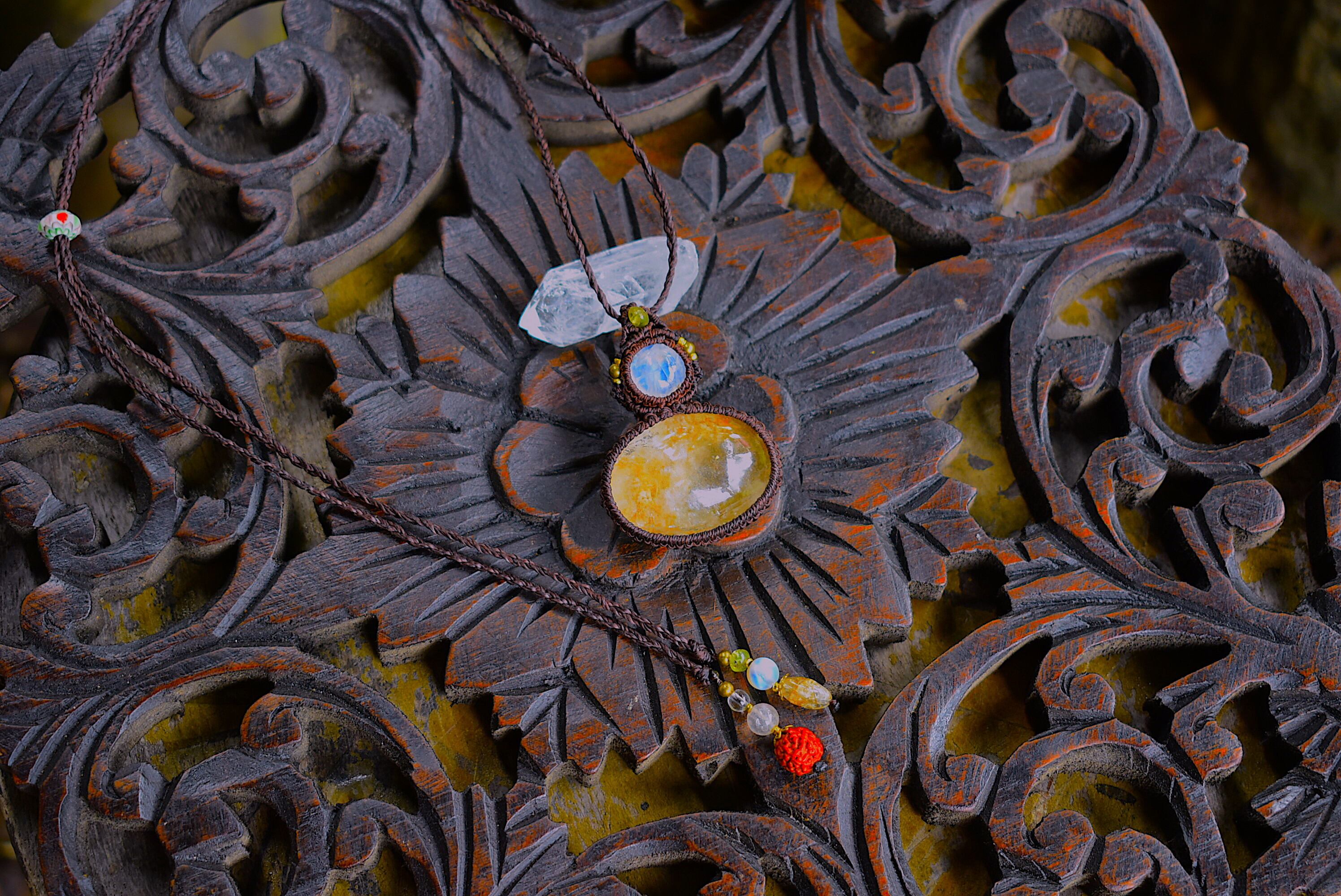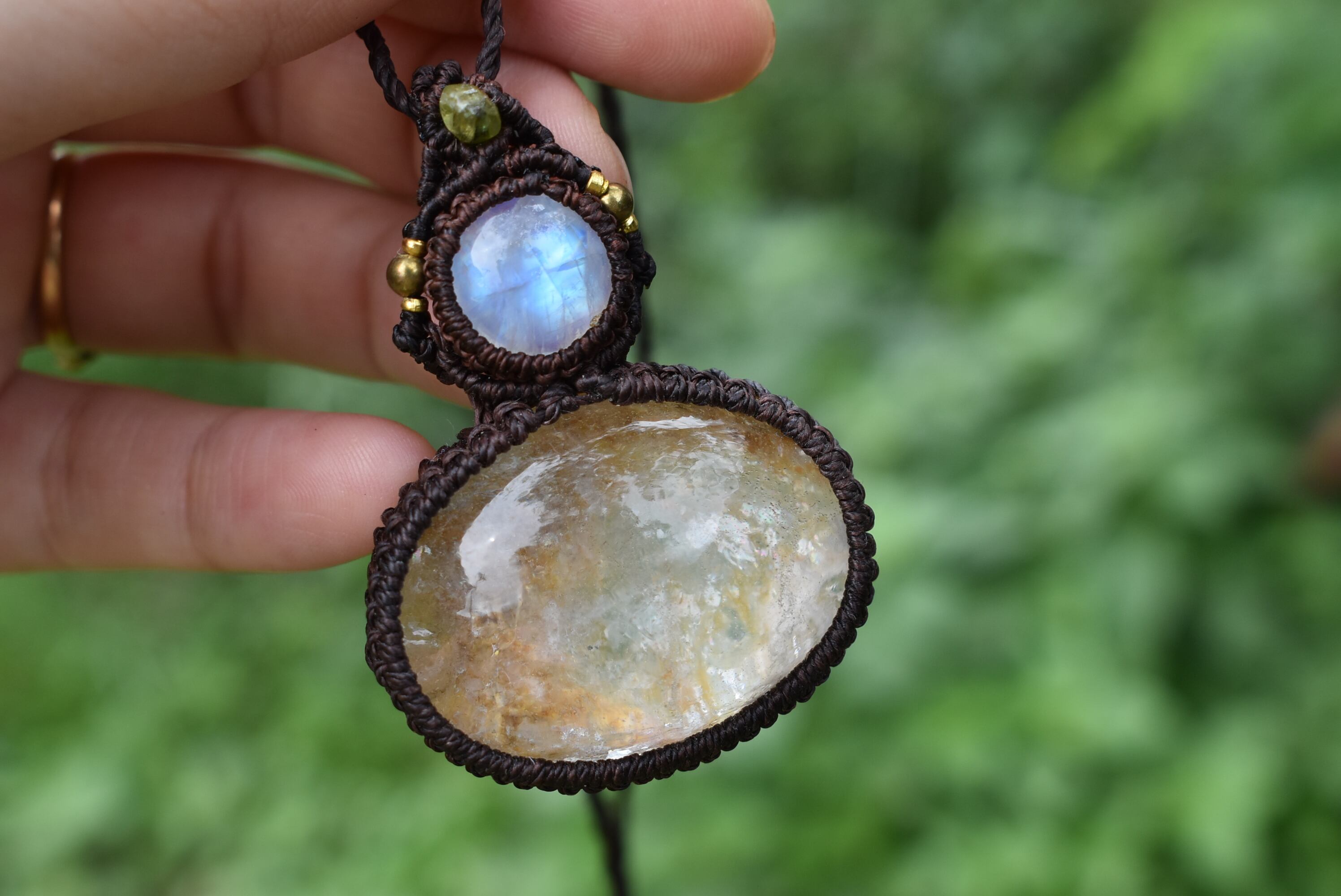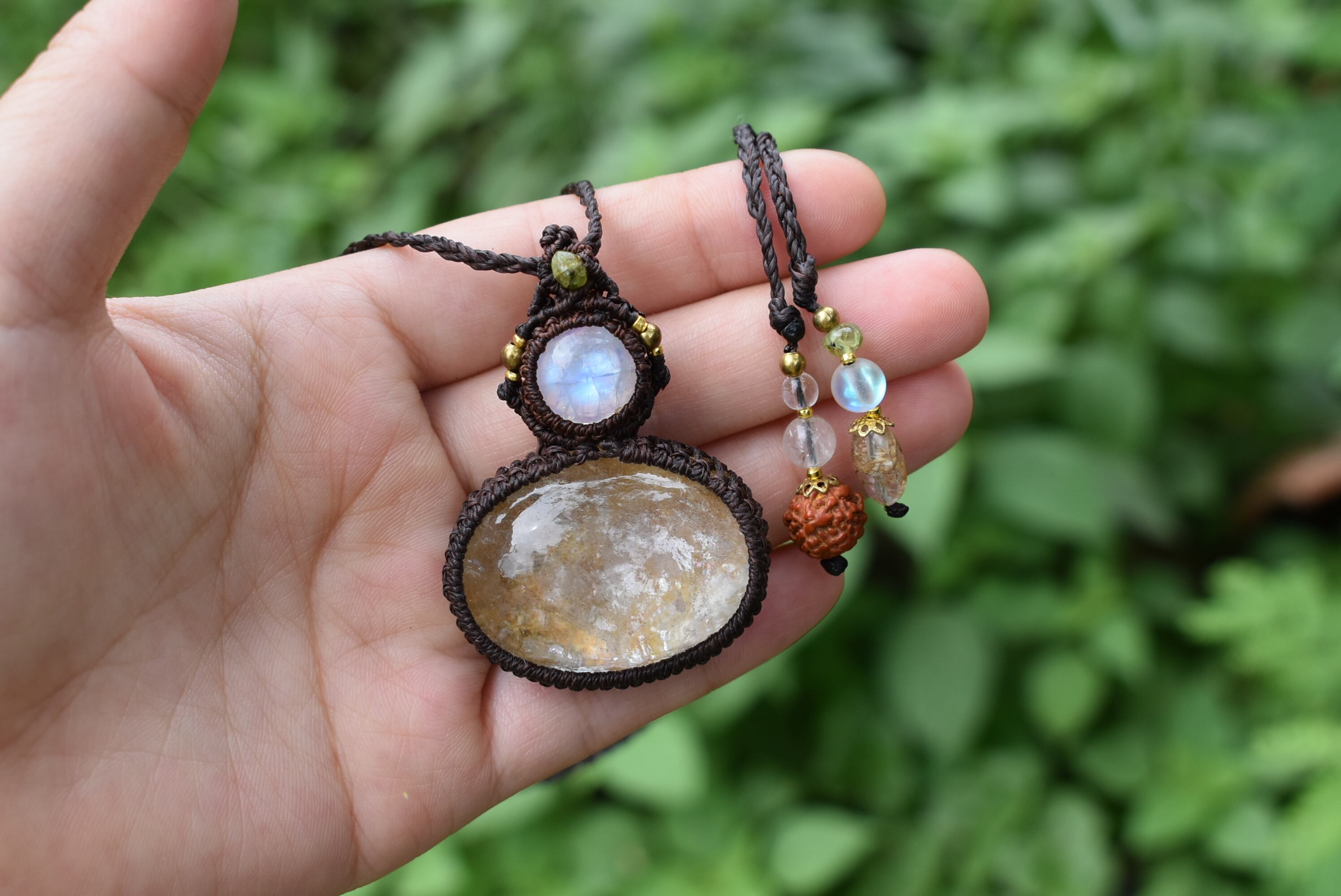 輝くブルーシラー★ムーンストーンと黄金ガーデンクォーツ マクラメペンダント
