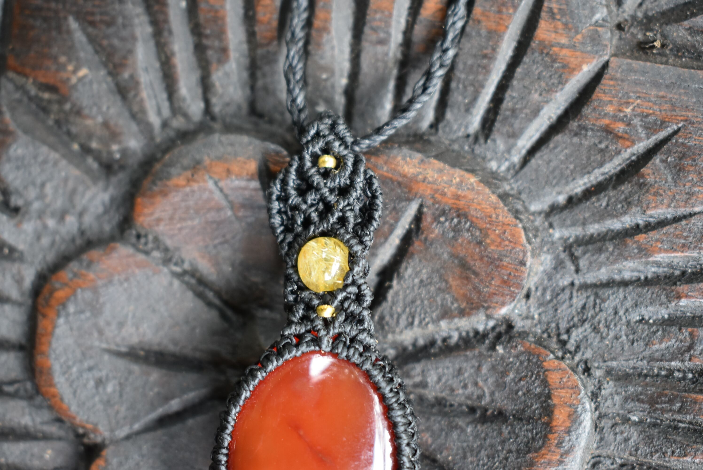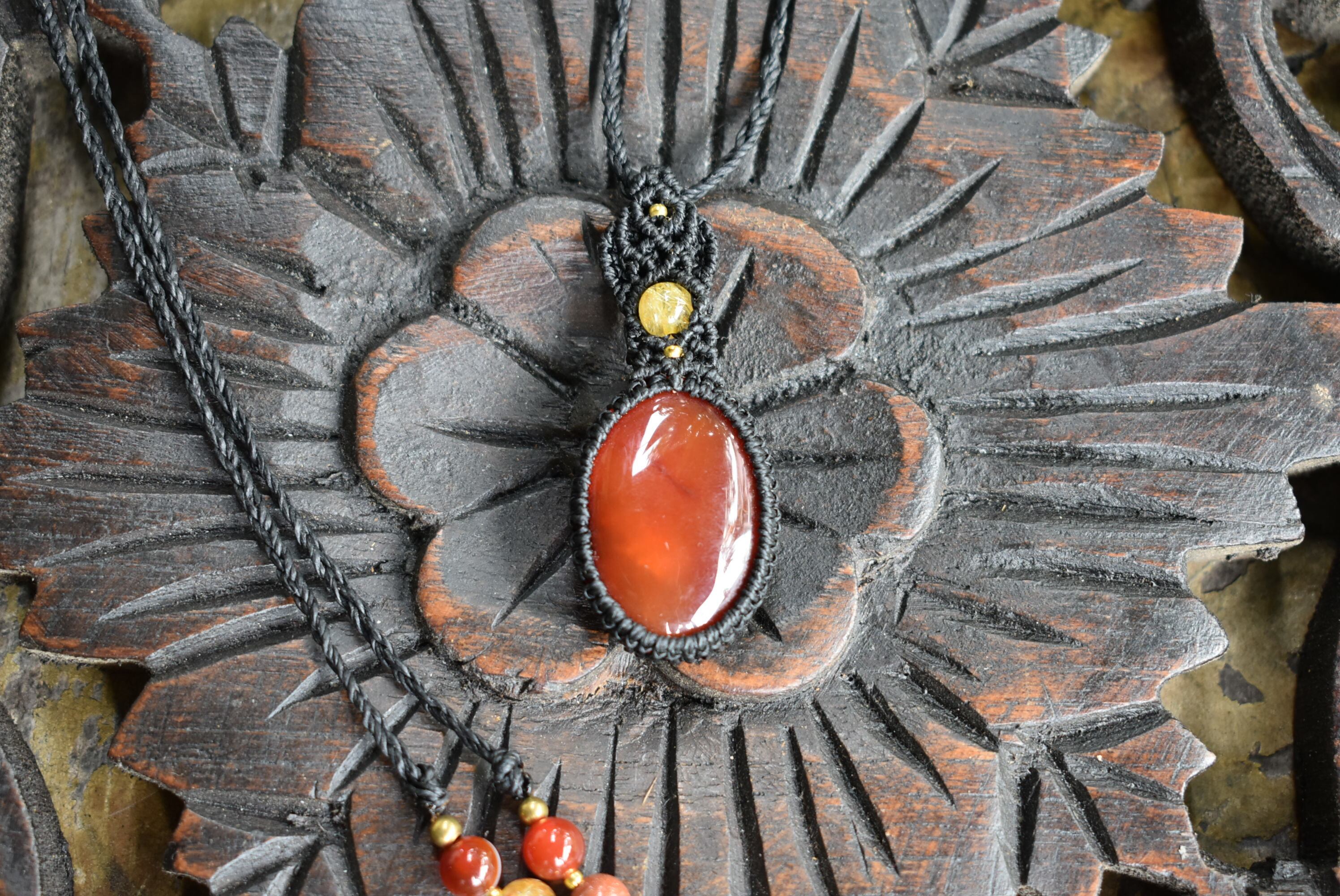 ドキドキさせられるような素晴らしい紅色の中によく見ると薄っすらとハードな爪痕が刻まれているかのようなカーネリアンを使用し、石を尊重できるように、紋章をイメージして、かつシンプルにマクラメ編み装飾を施しました。
