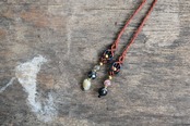 ツヤ感あるこの石のルースストーンの力強さに負けない色味の蝋引き糸を使用して