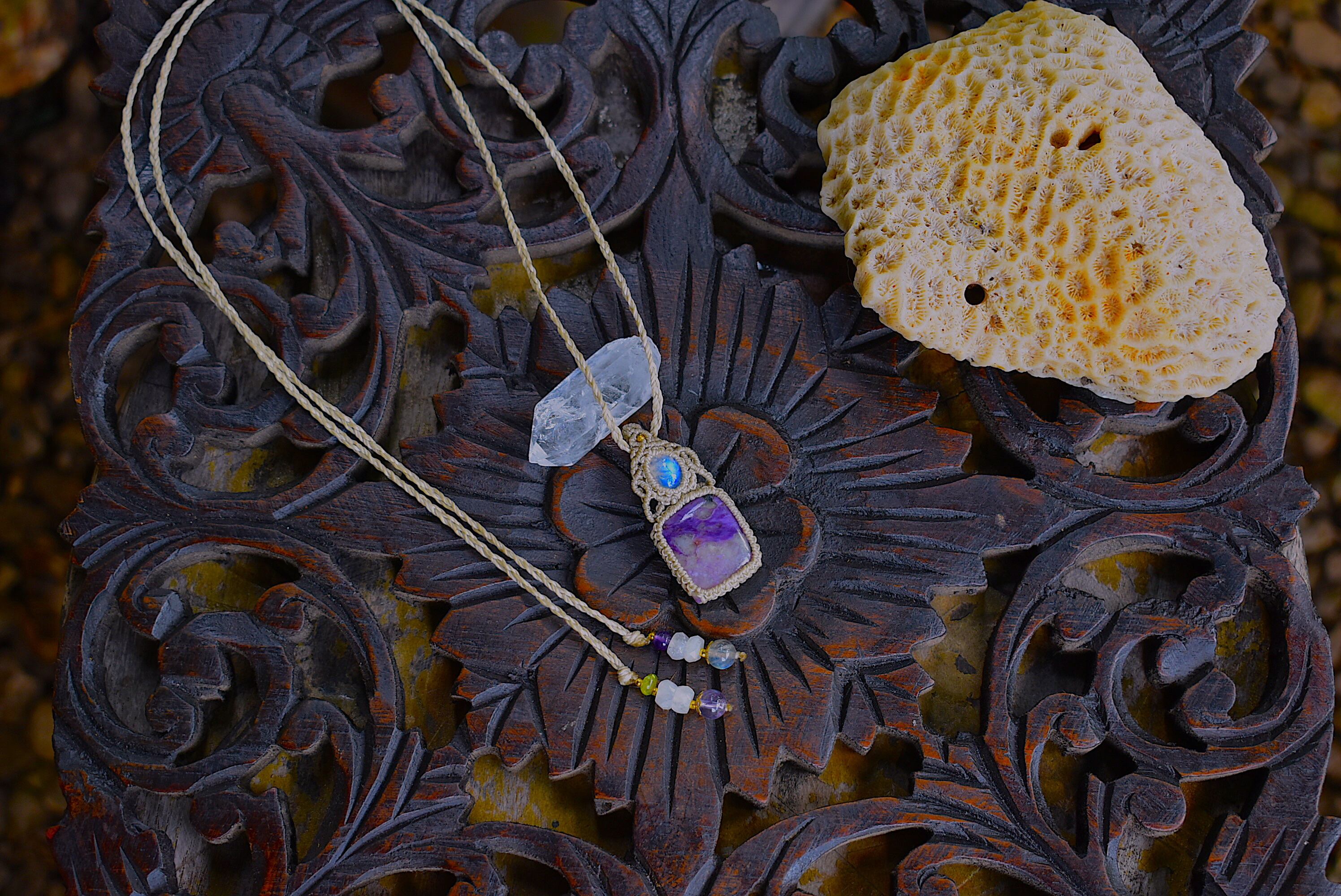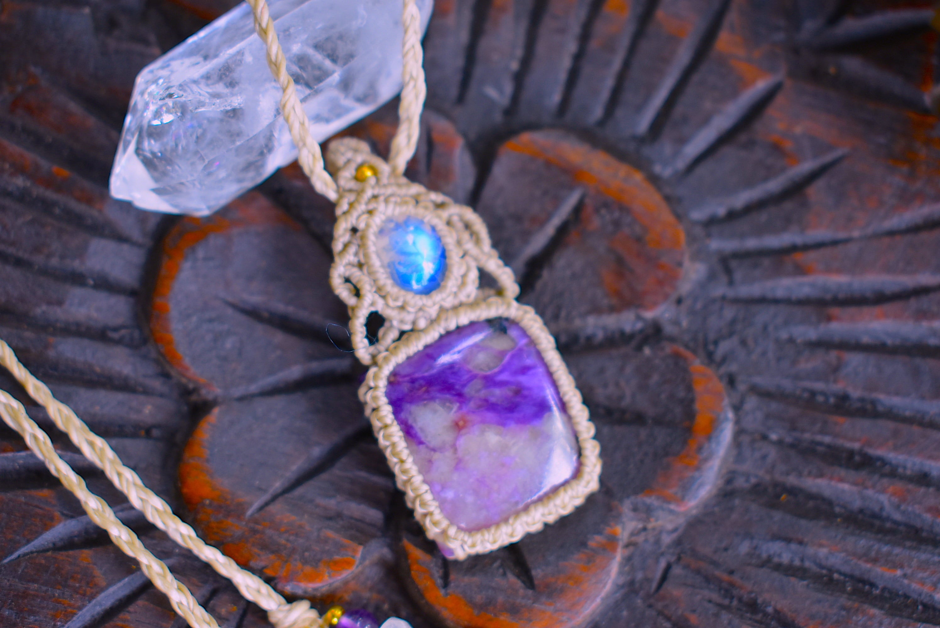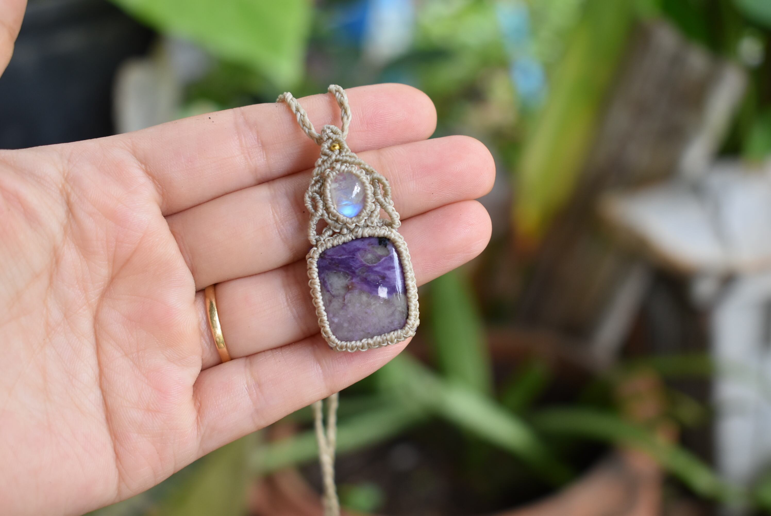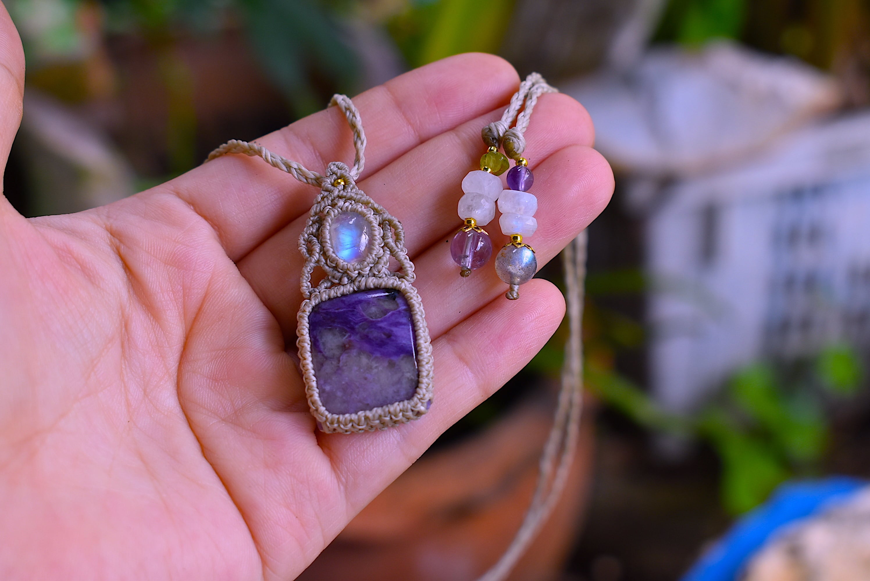 妖しく美しく輝きを放つブルームーンストーンと共にアートな紫模様を彩ったチャロアイトをひとつに結びあわせて、マクラメ編み装飾を施し、ペンンダントに仕上げました。繊細なブルームーンストーンの輝きと混ぜかけの色味のようなチャロアイトのマーブル模様がどことなく存在感を示しているかのようなふたつをひとつにまとめて、装飾しました。