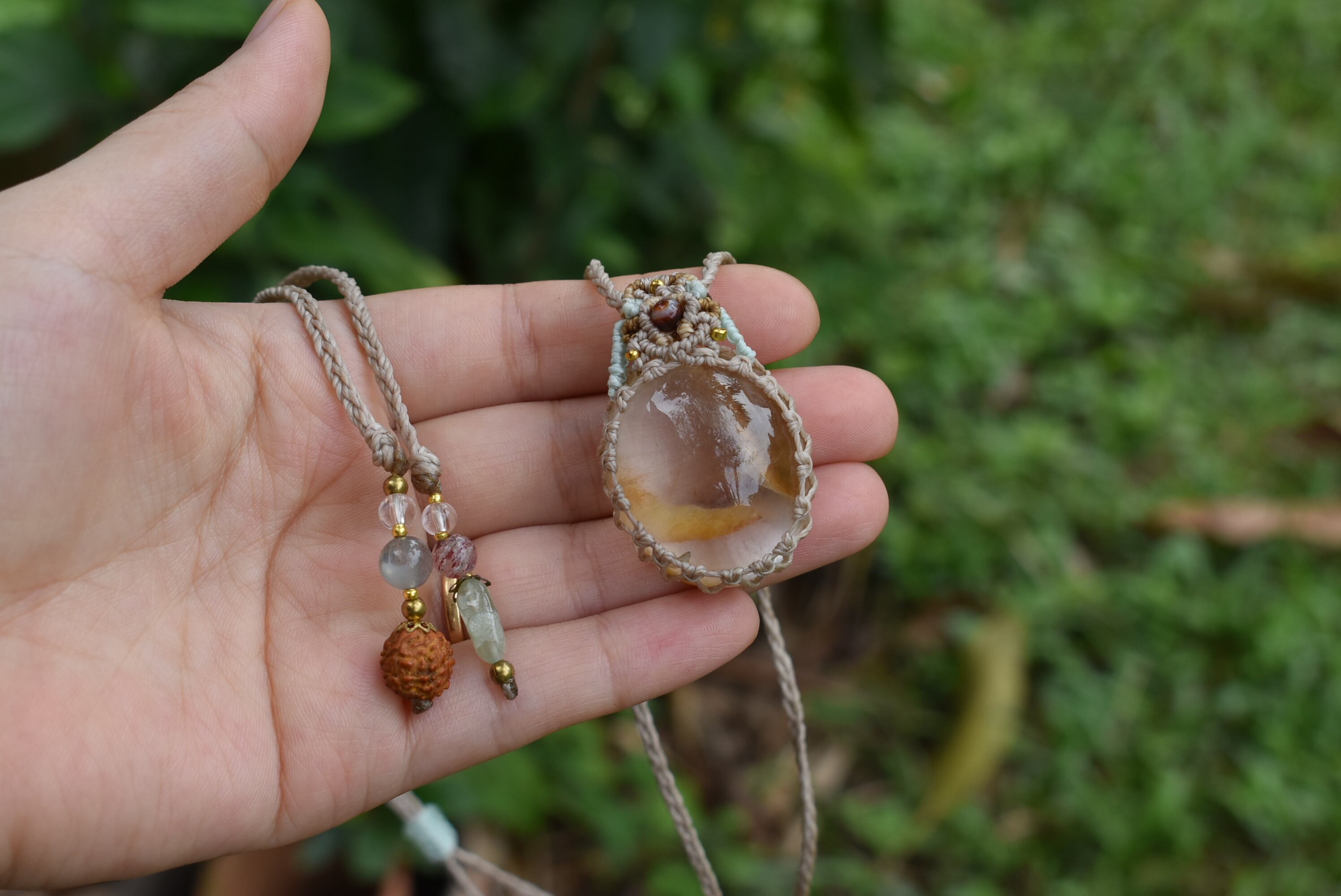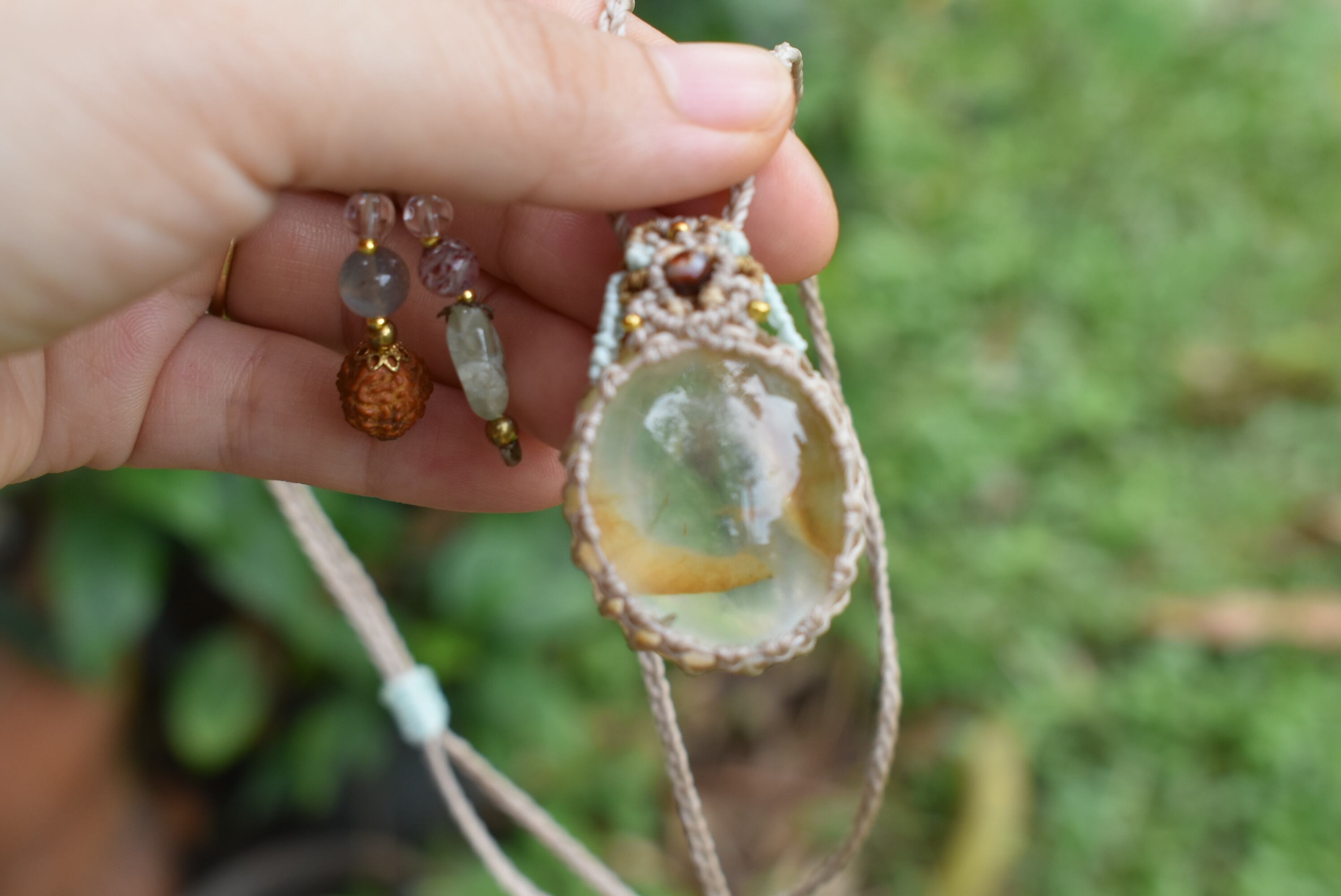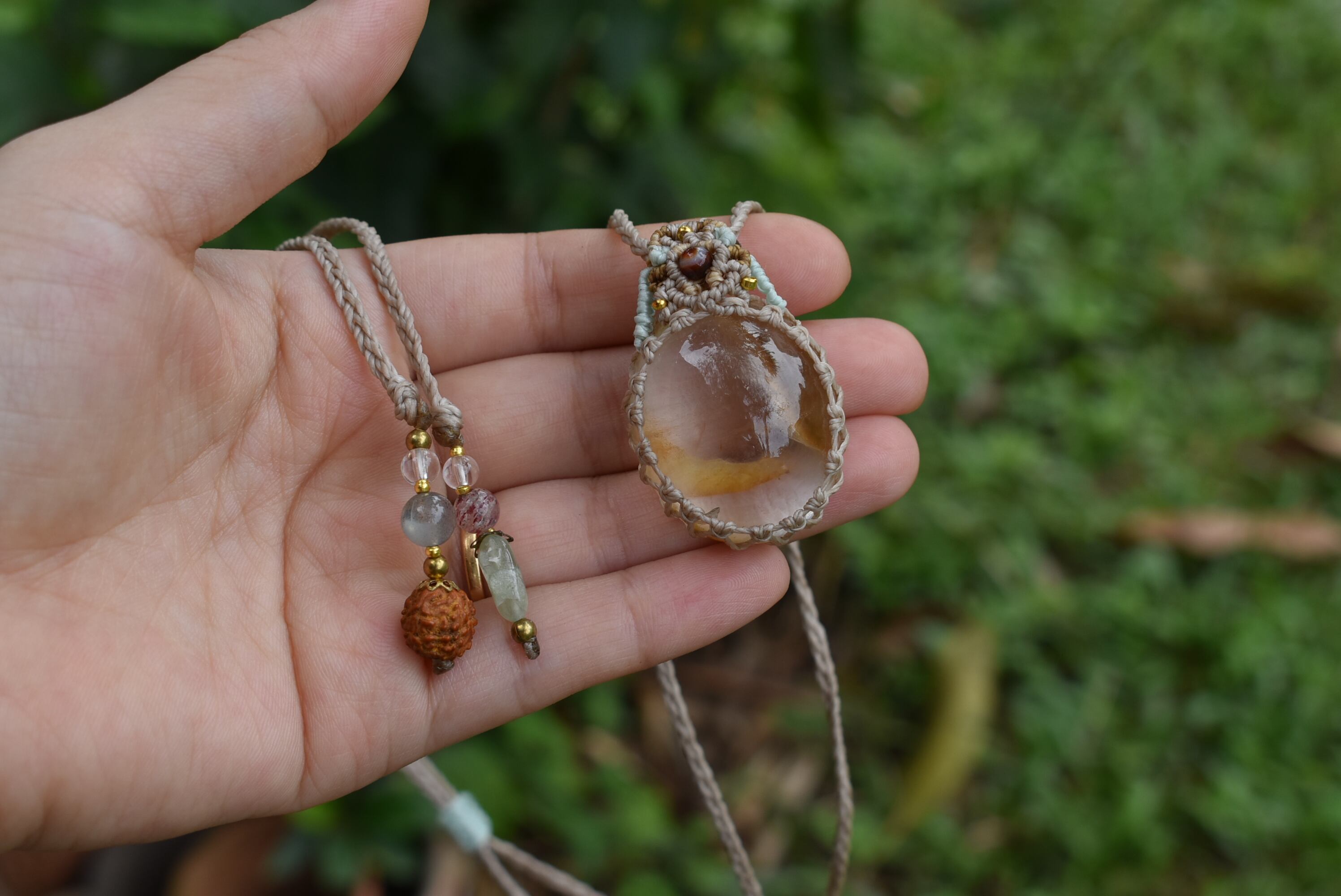 このたびのガーデンクォーツ は非常に美しく、ボリュームある水晶の中にイエローカラーのレース模様がカーテンのように横切っている..そんなガーデンクォーツ ルース全体を楽しめるようにマクラメ編み装飾を施し、トップにアゲートビーズをあしらい、仕上げました。