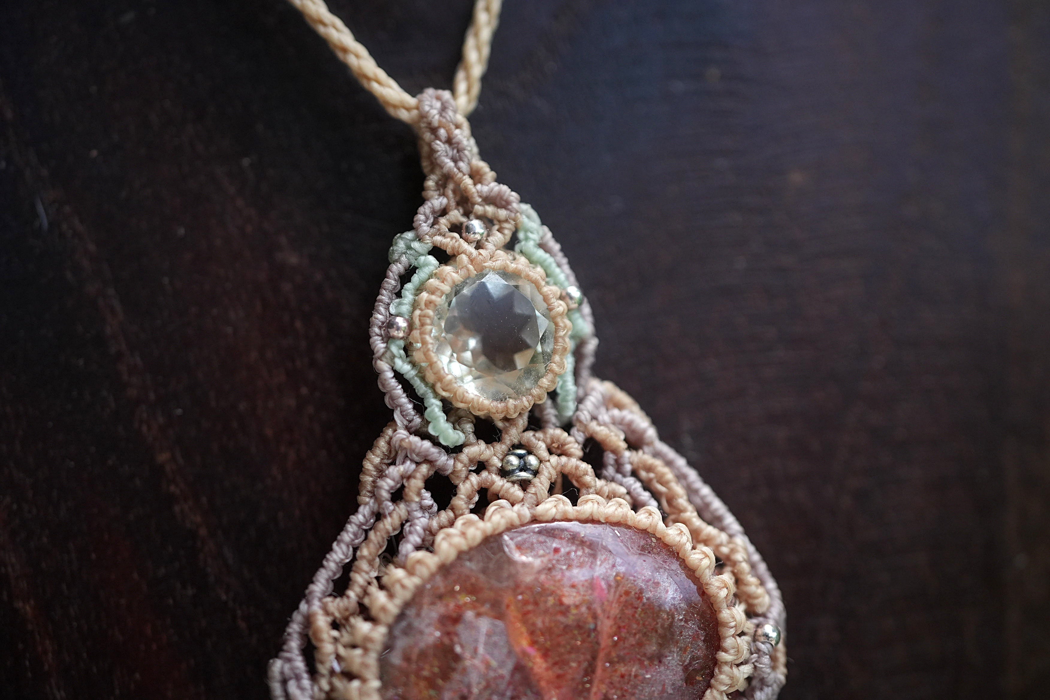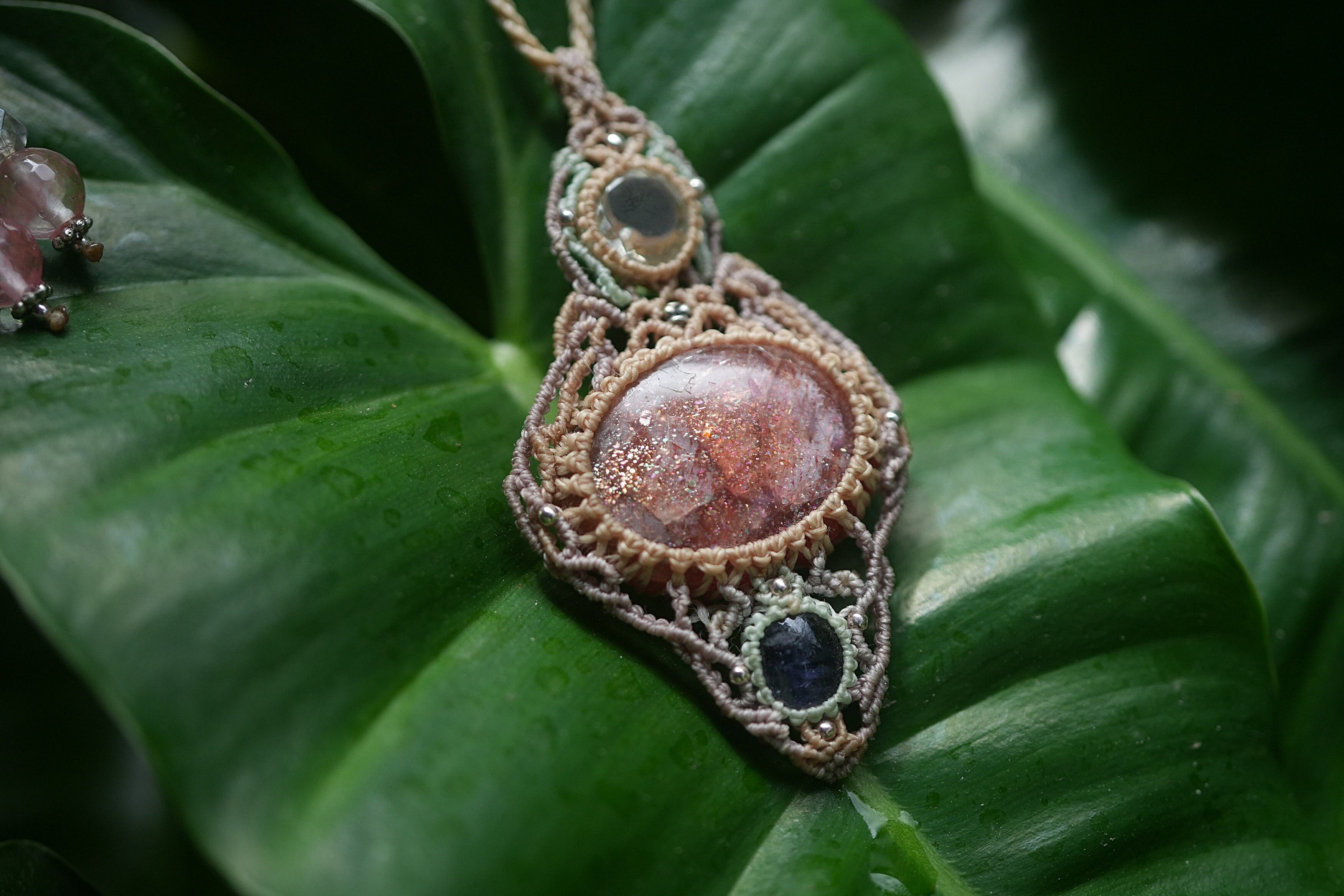 3石をマクラメ編み装飾して結んだ不思議な組み合わせ。