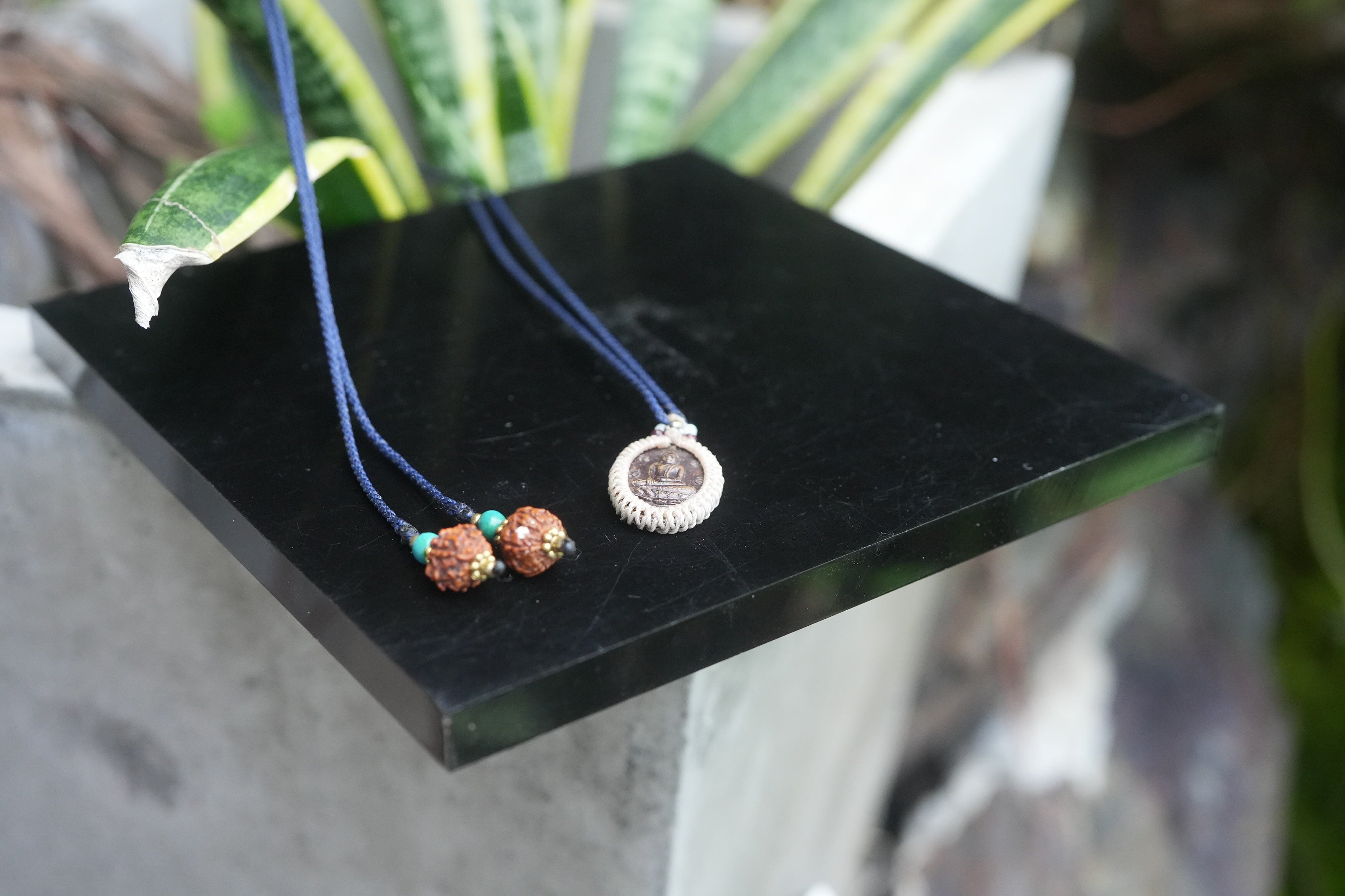 ◆このたびはキナリ・ピーコックブルー色の蝋引き糸を使用しマクラメ編み装飾を施しました。