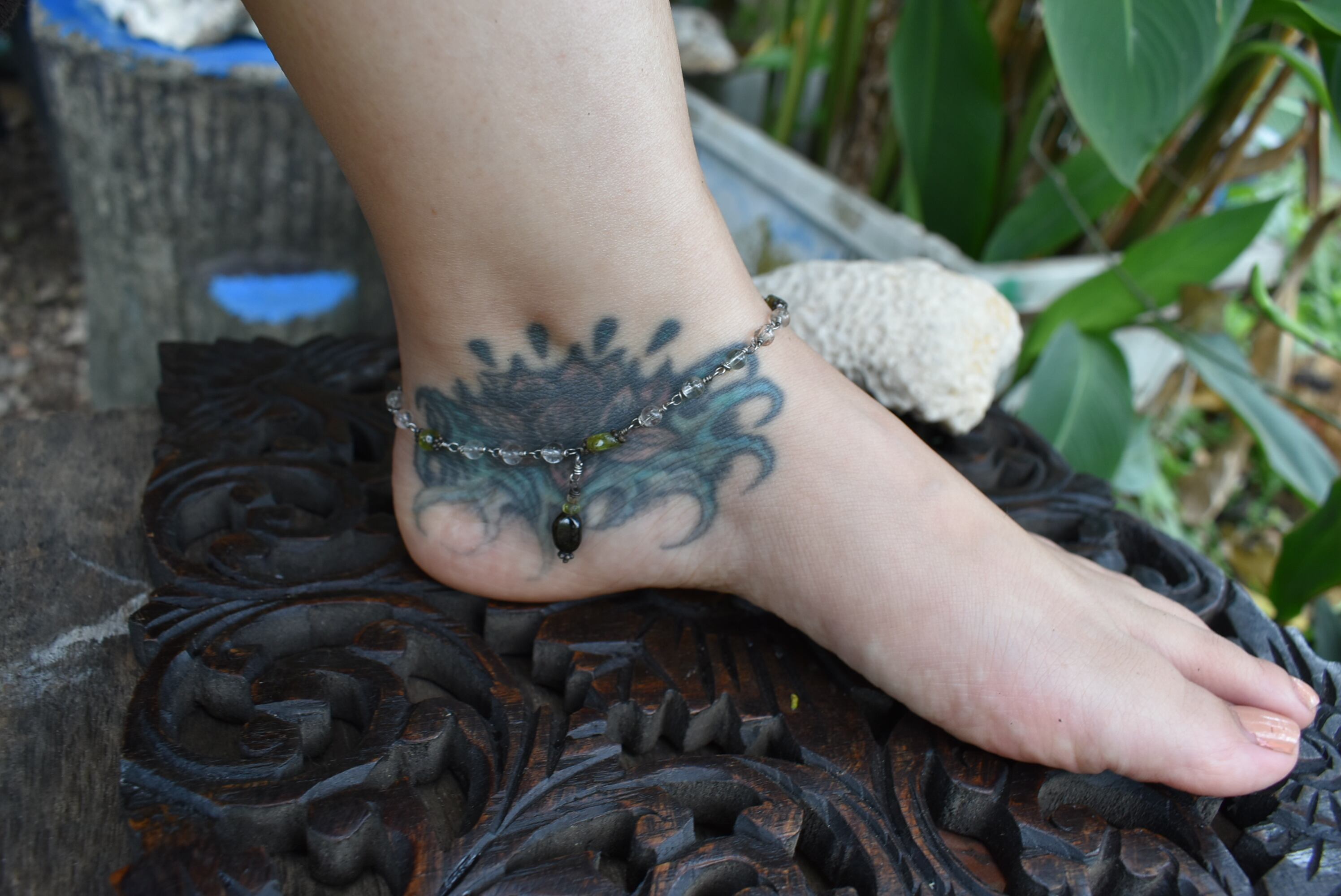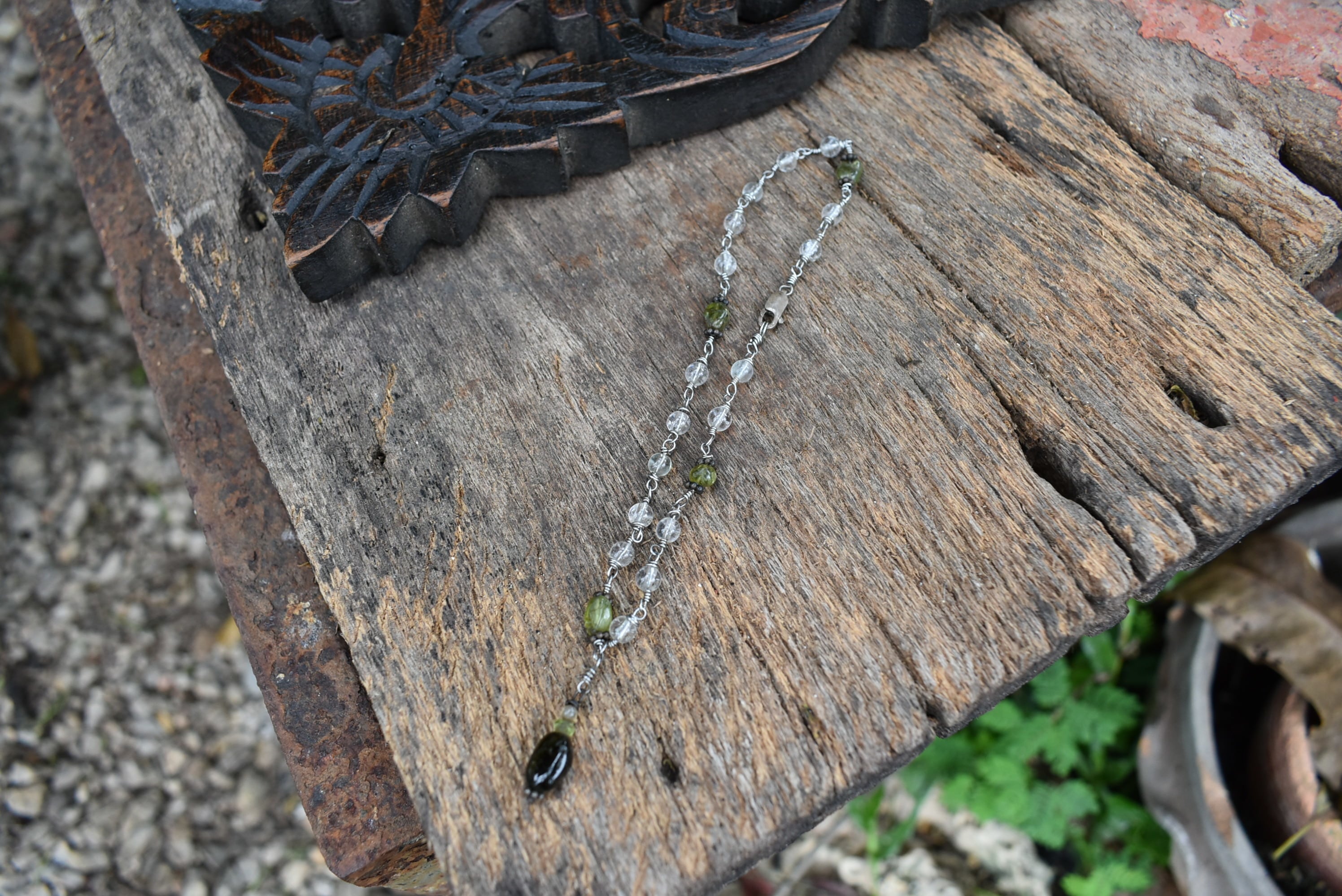 トルマリンビーズトップをポイントに爽やかな色合いを持ち合わせたペリドットビーズを組み合わせました。天然石ビーズとシルバー92.5フック、チップなどを組み合わせ、味わいあるアンクレットを制作しました。