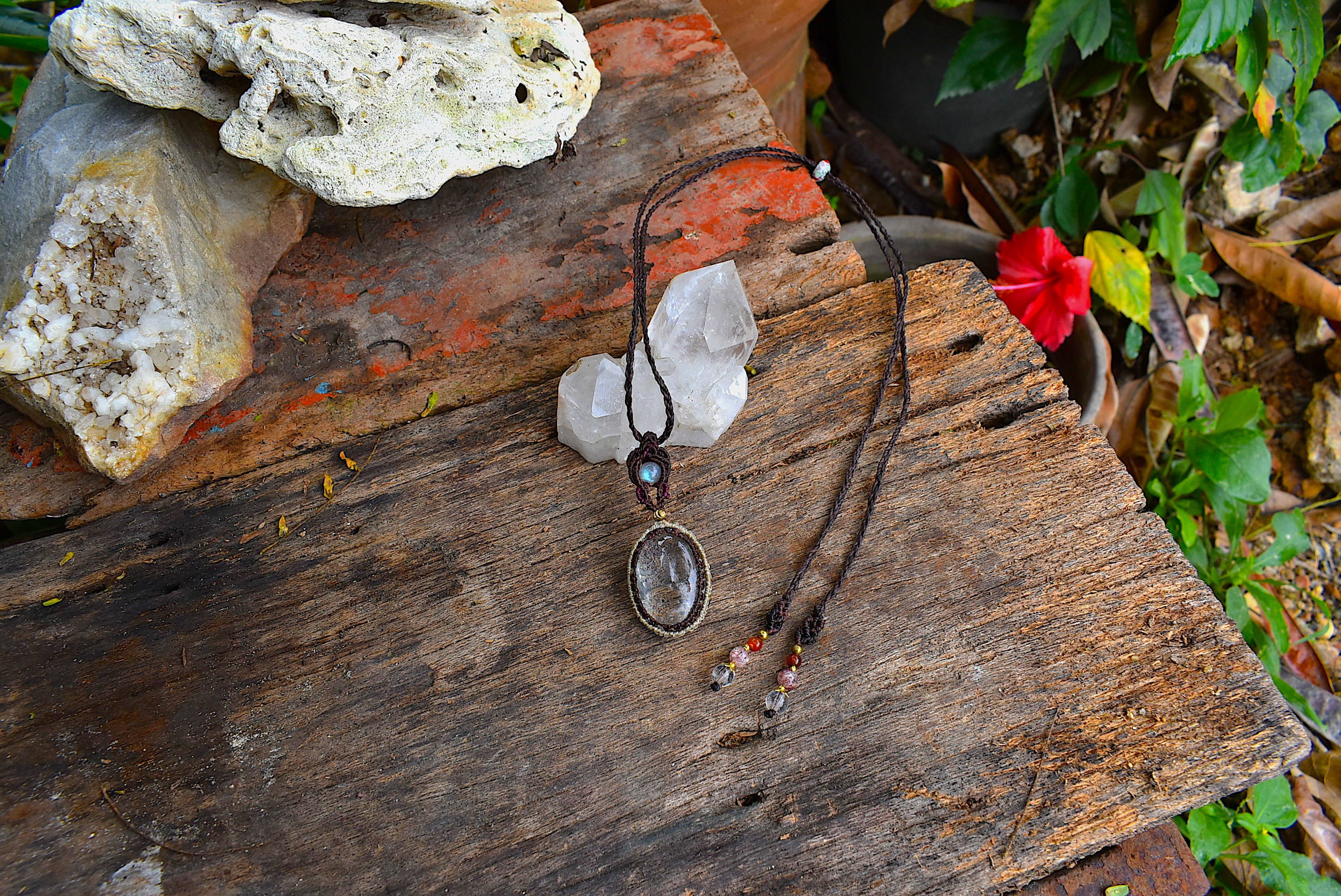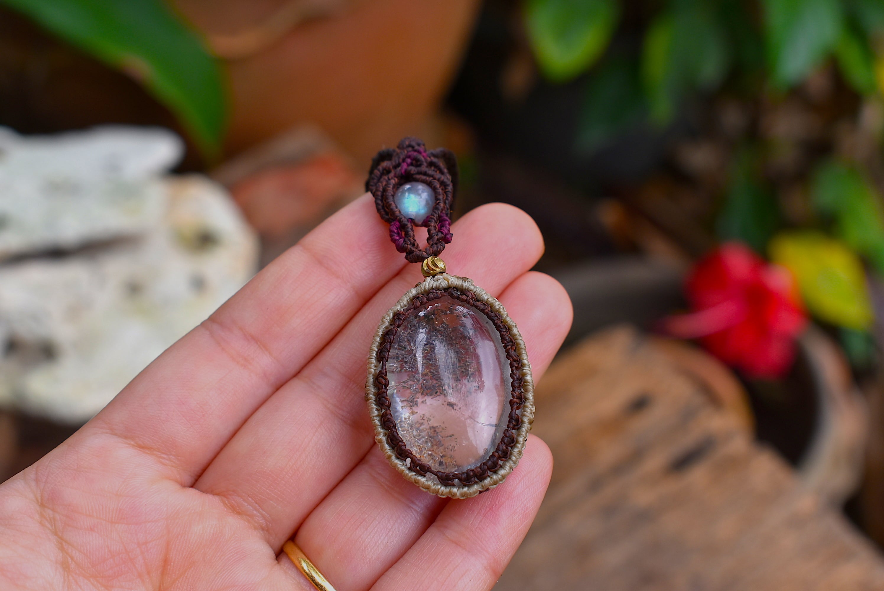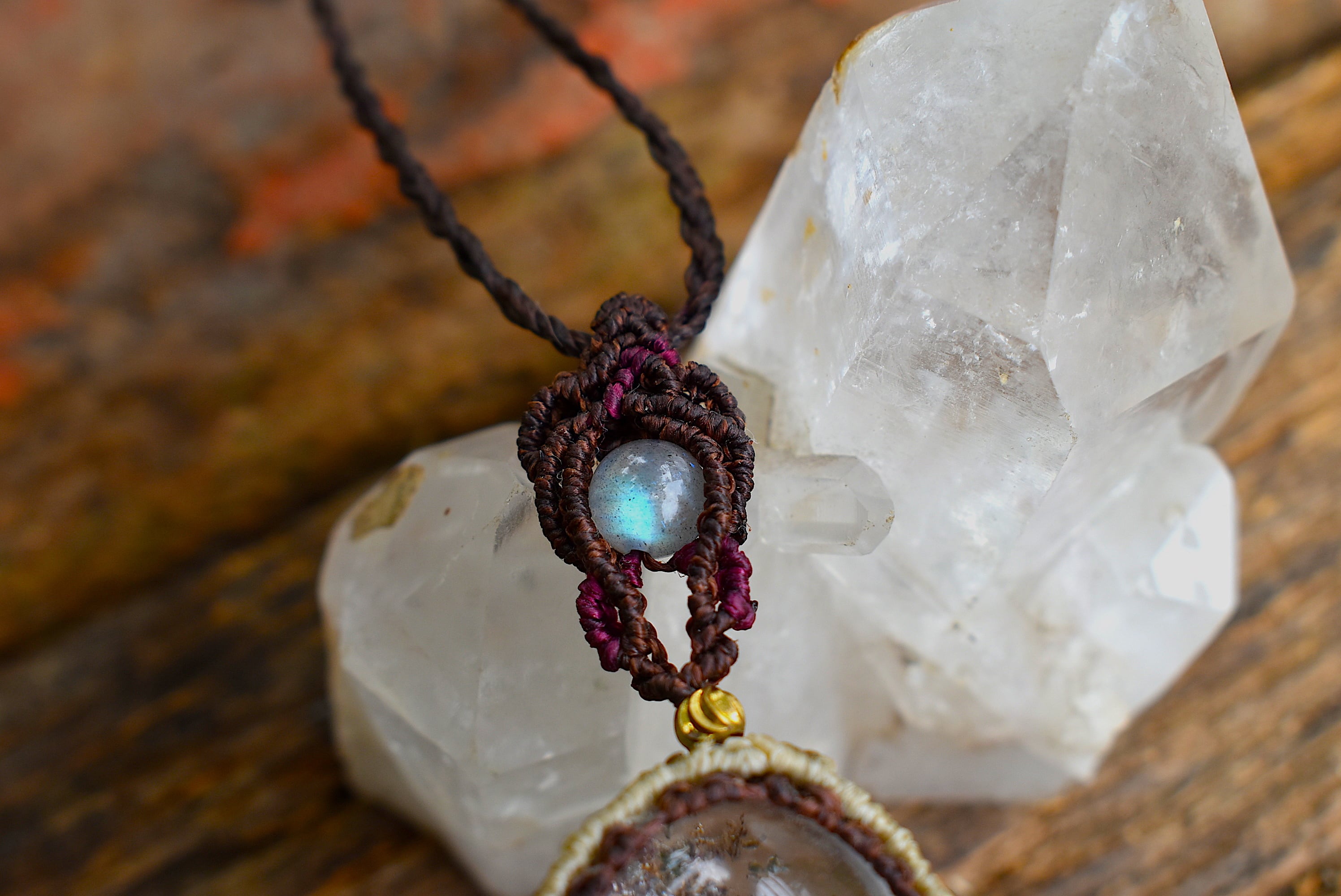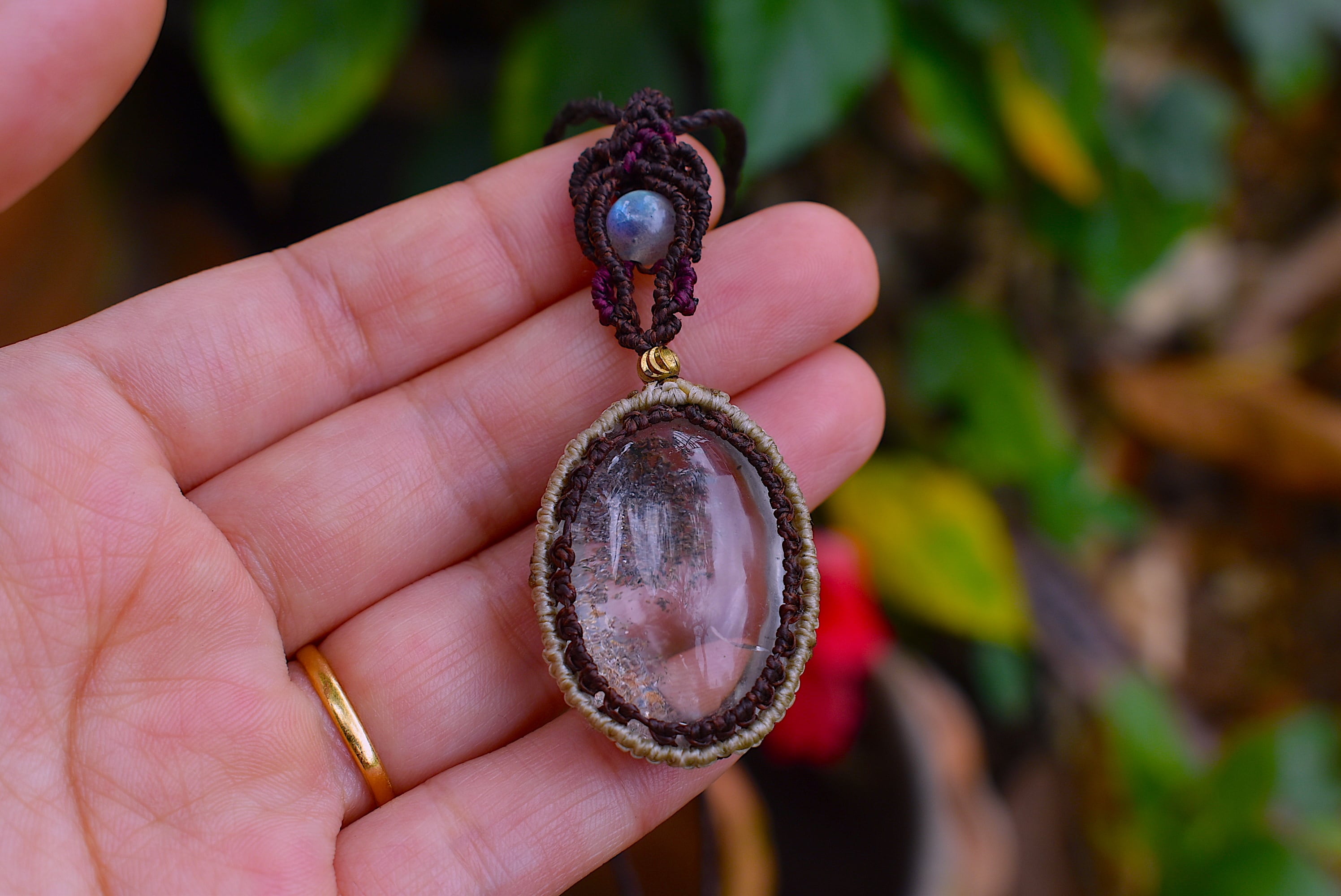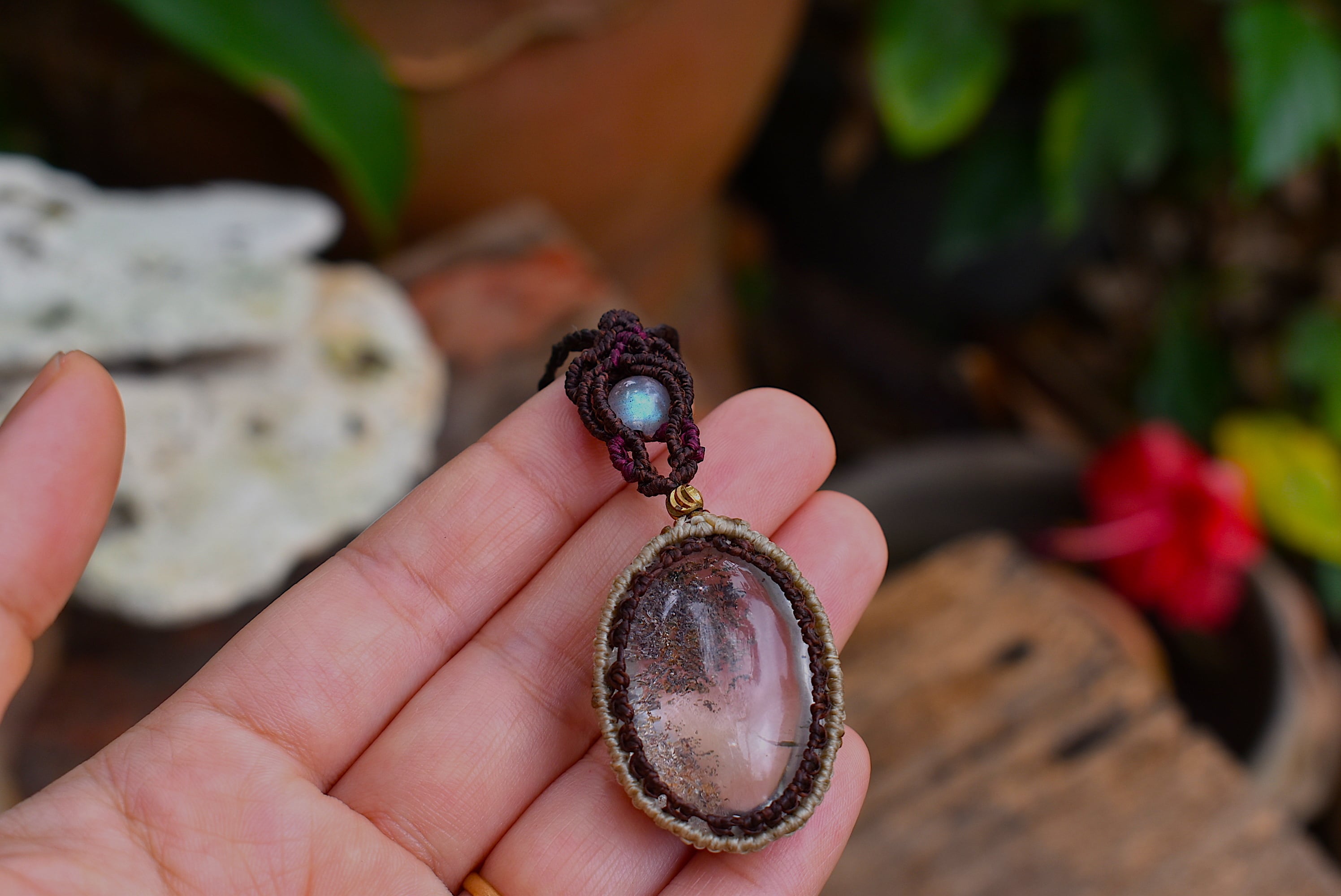 まんまるい水晶の中に吹雪のように散りばめられた庭模様。水晶が透明感あるだけに、石の高貴な雰囲気がいっそう引き立ちます。ペンダントトップとペンダント部分を引き離してマクラメ編み装飾することによってトップのラブラドライトビーズの蒼が引き立ちます。