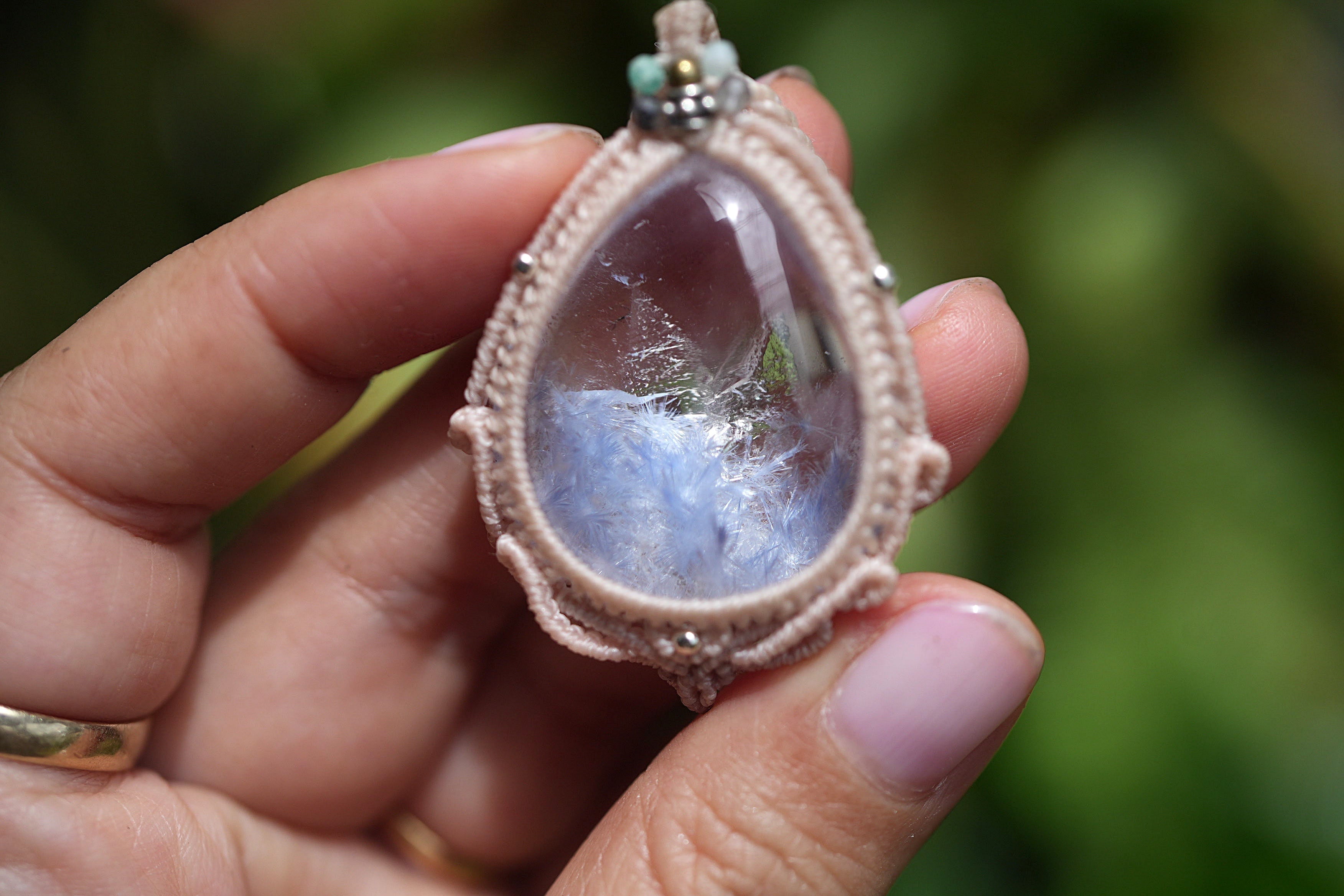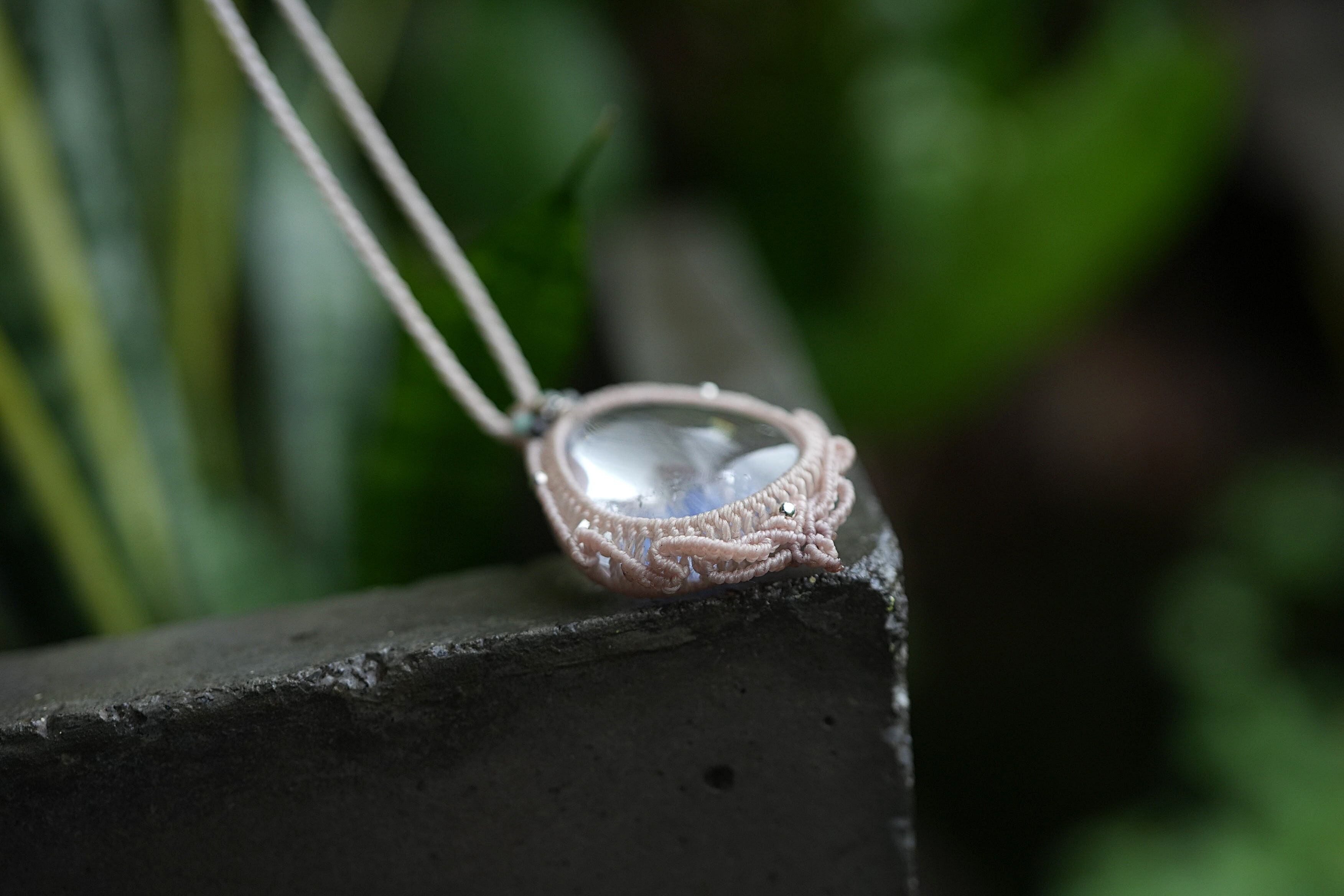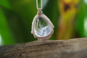 石の周りを立体的にゆらめく波のようにマクラメ編み装飾。