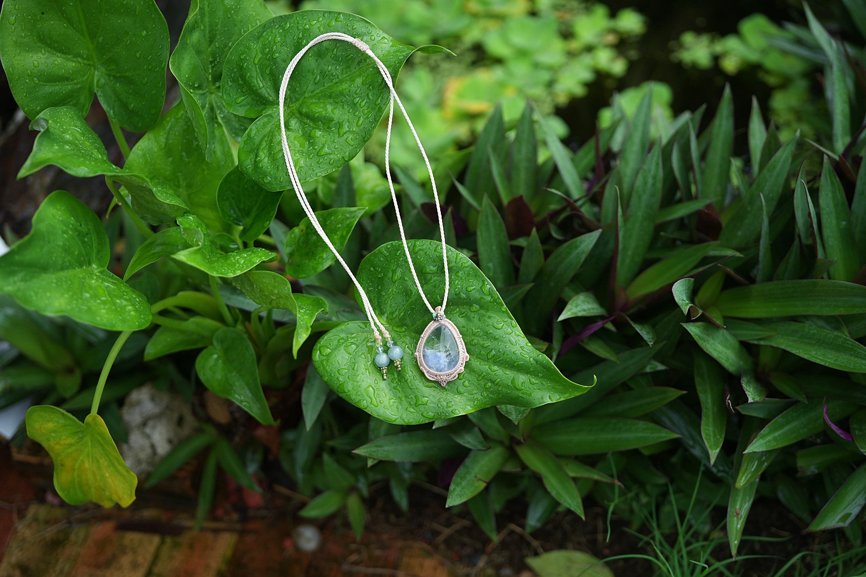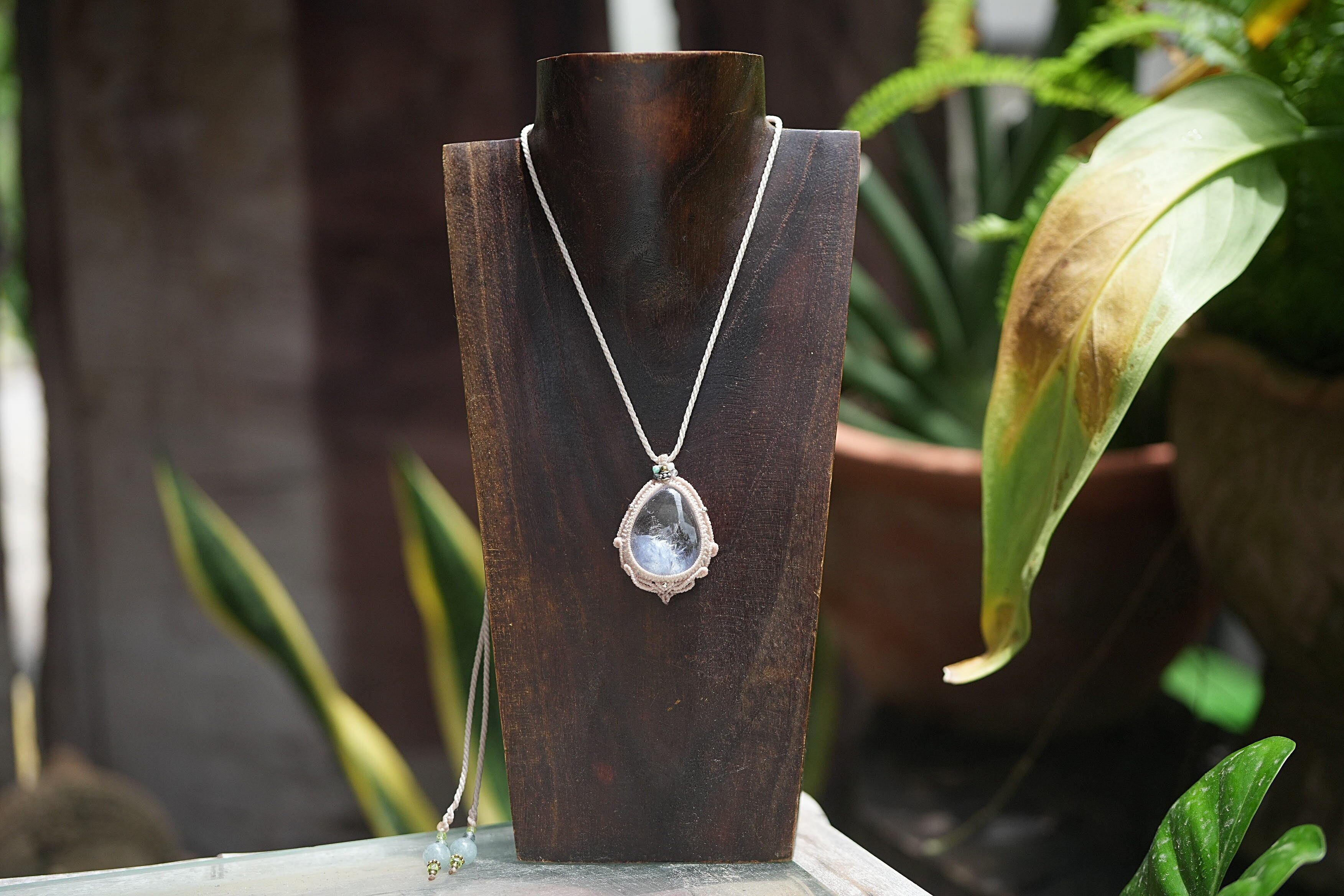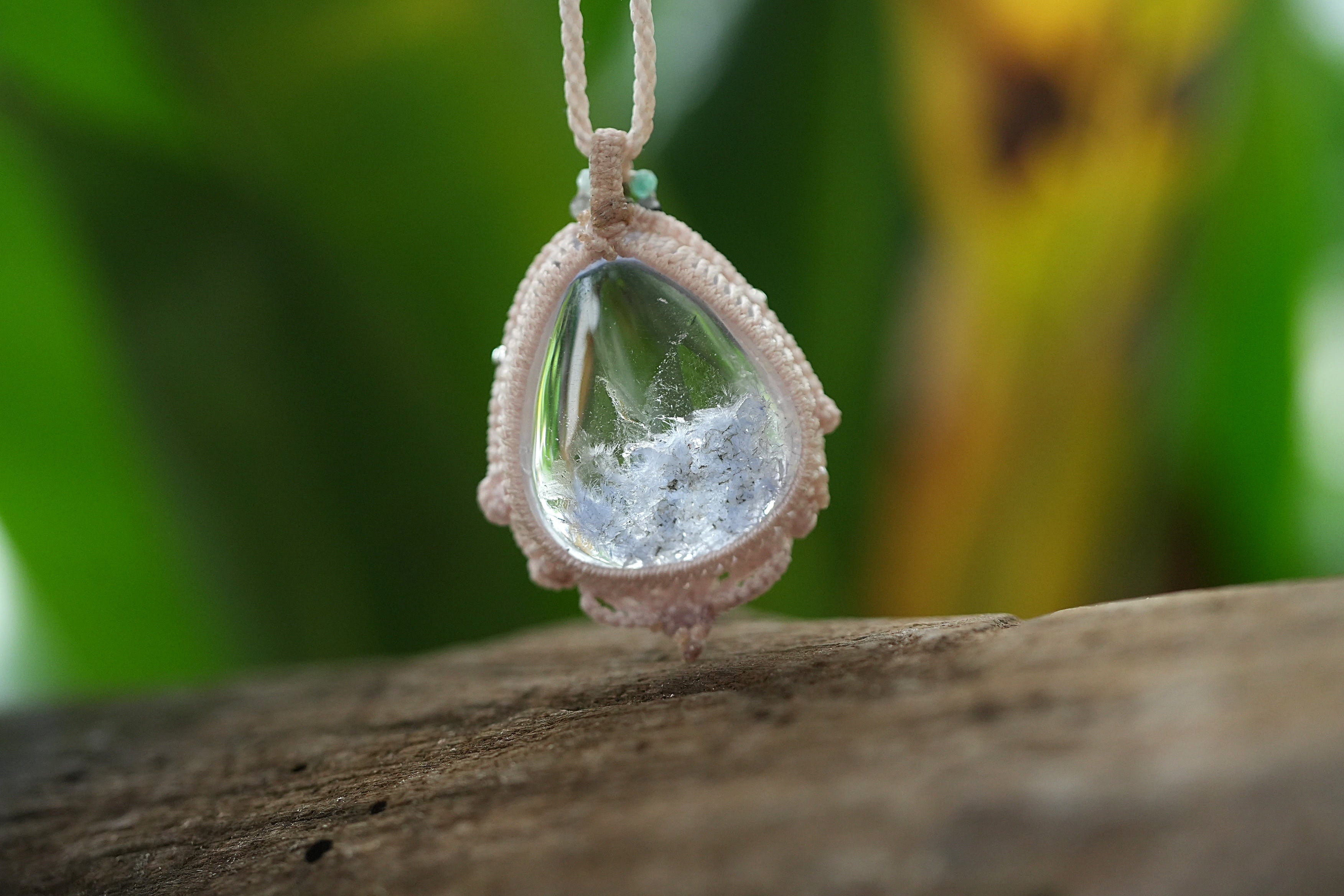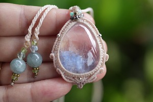 ◆このたびはナチュラルホワイト色の蝋引き糸を使用しマクラメ編み装飾を施しました。