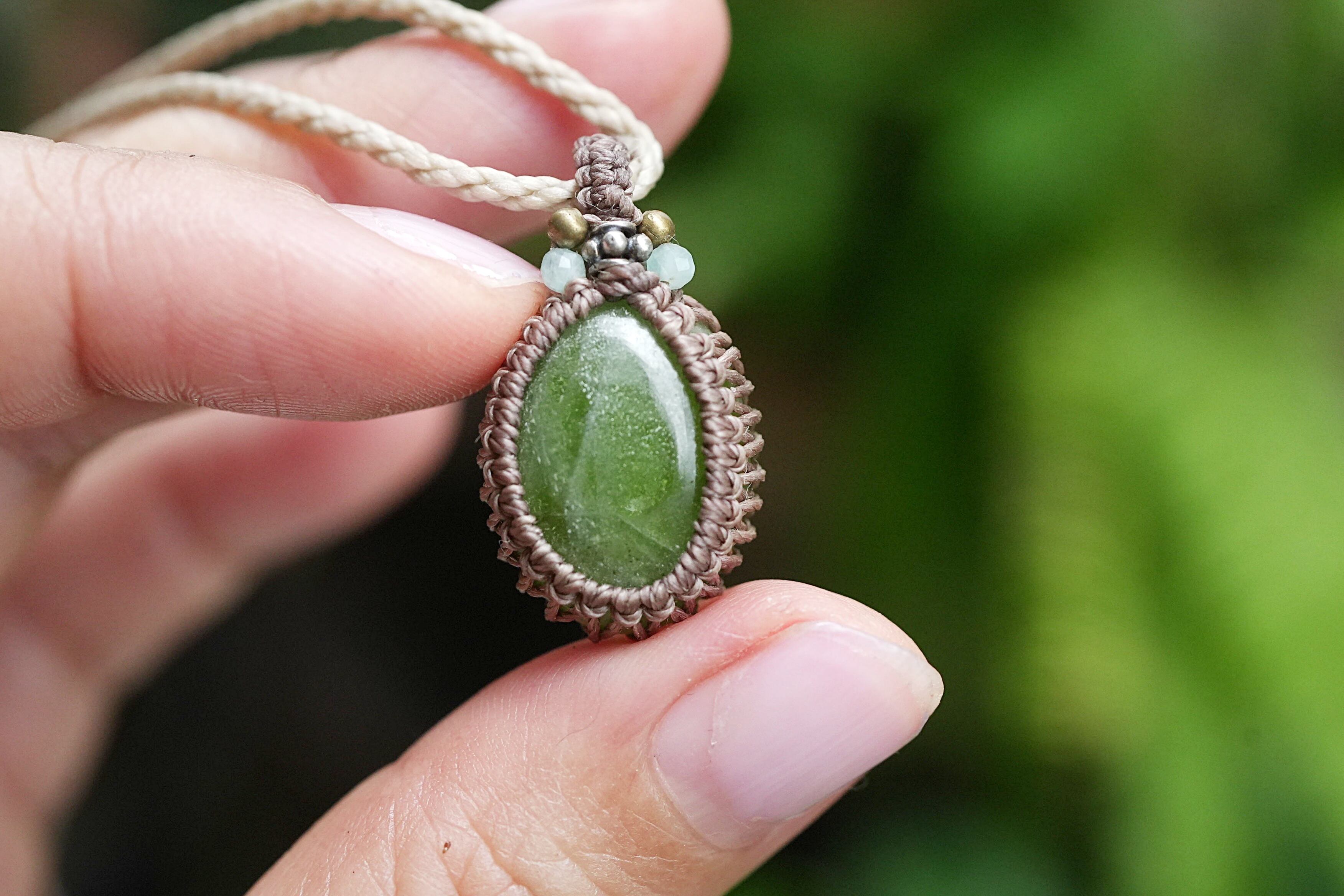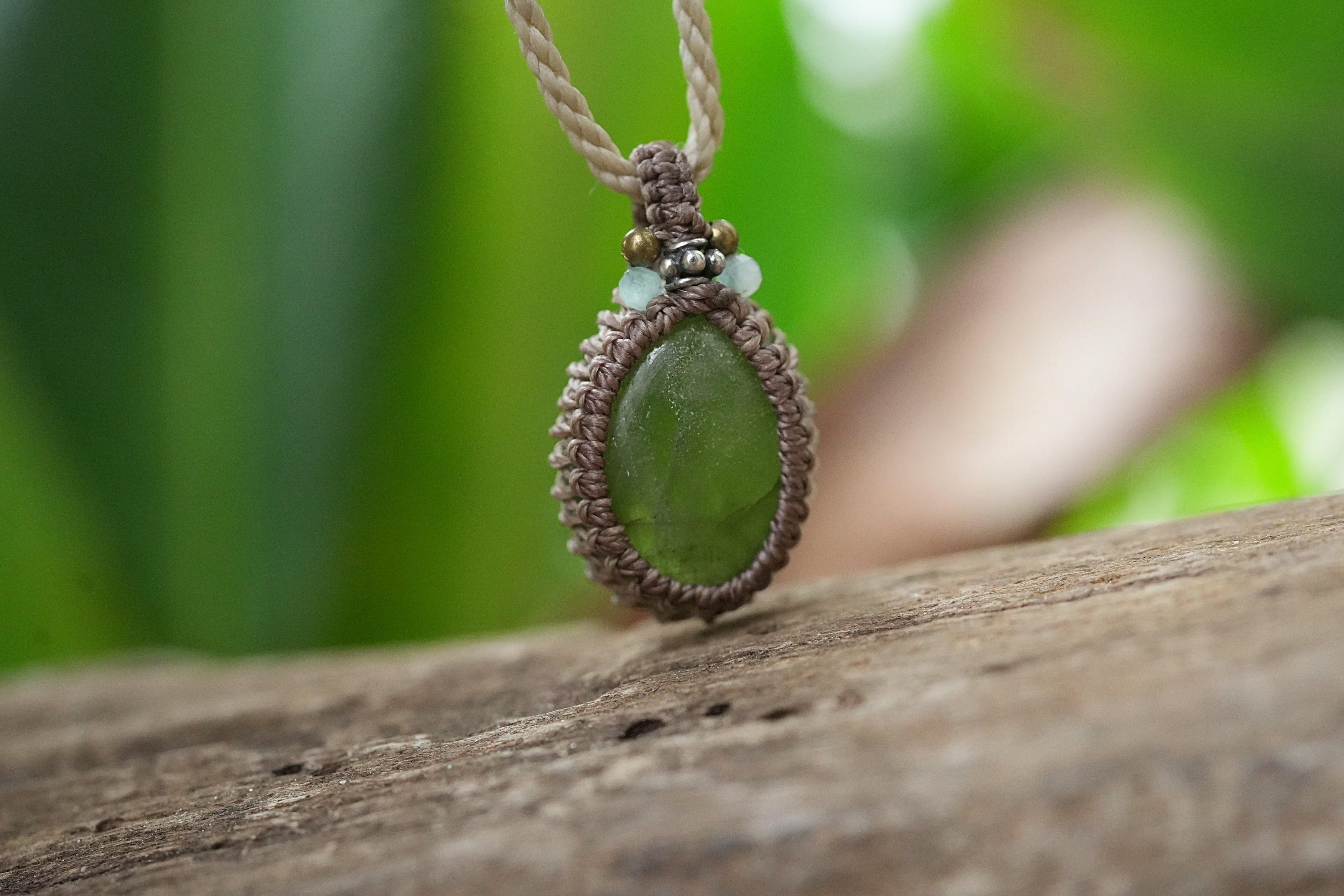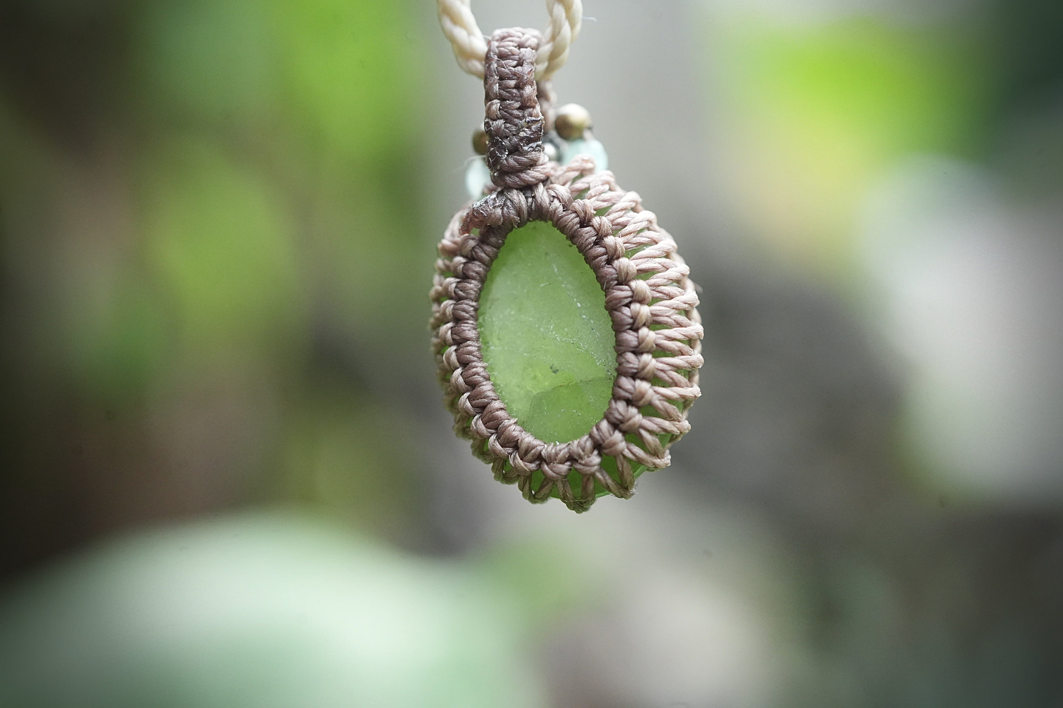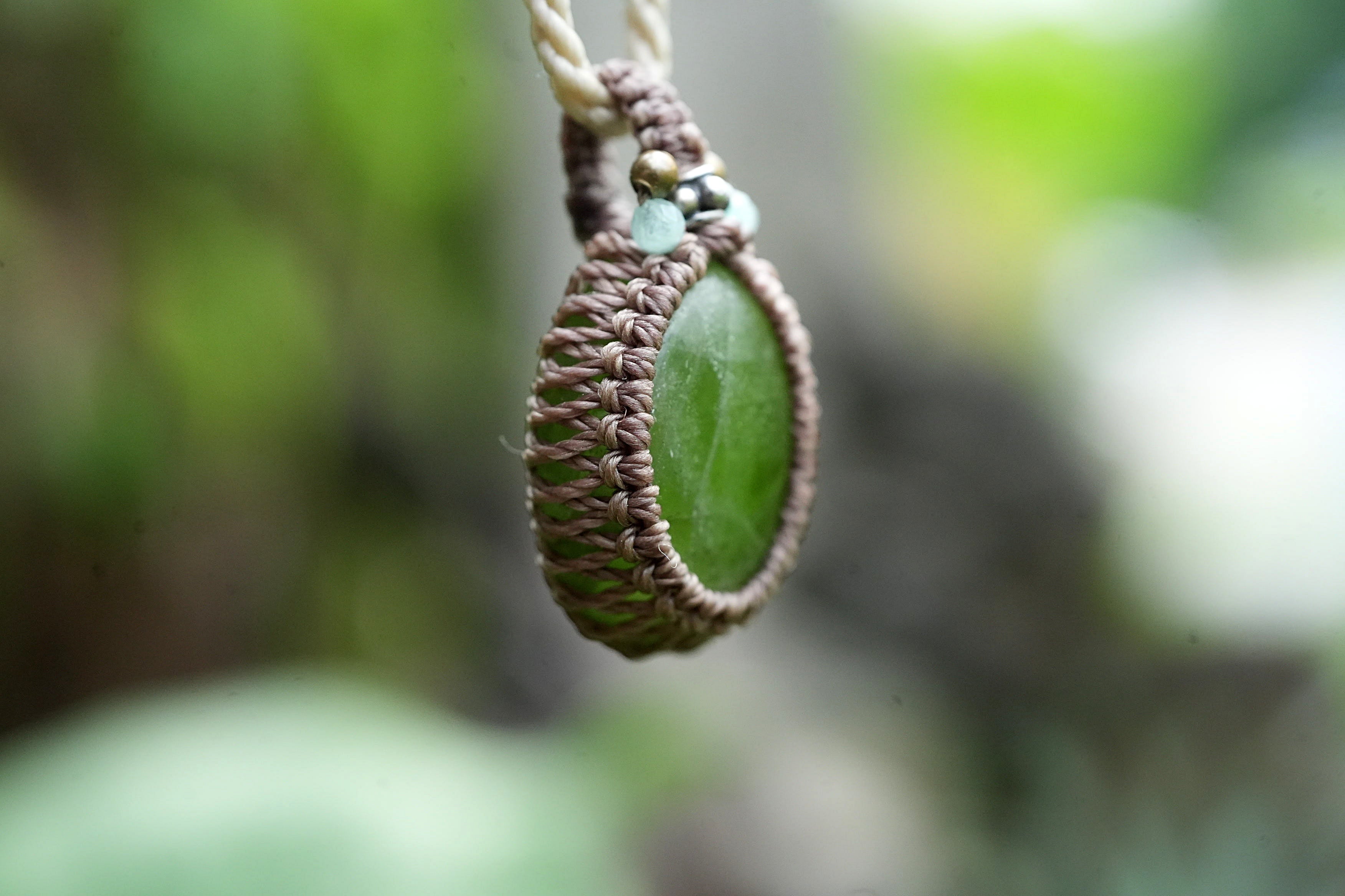 ◆このたびはキナリ、ブラウン色の蝋引き糸を使用しマクラメ編み装飾を施しました。