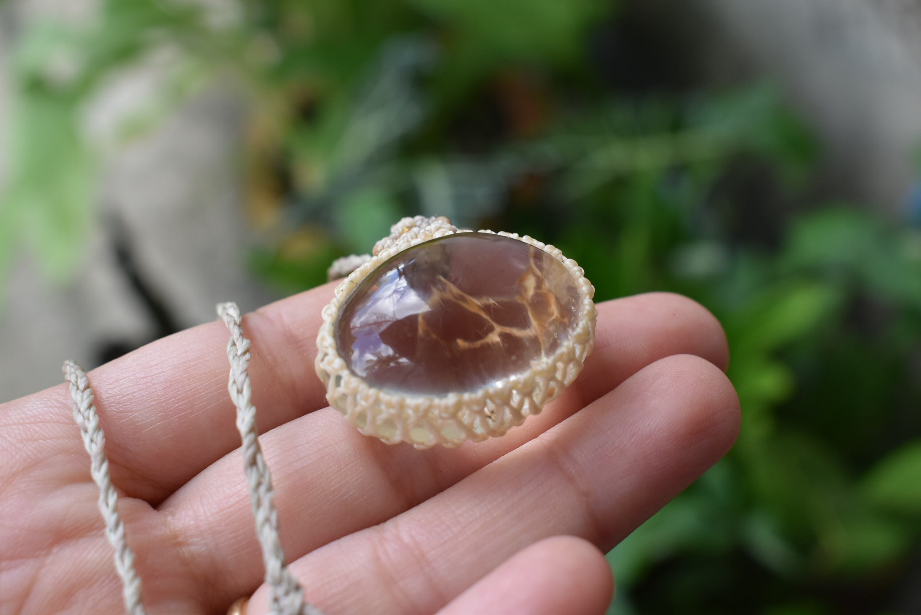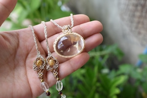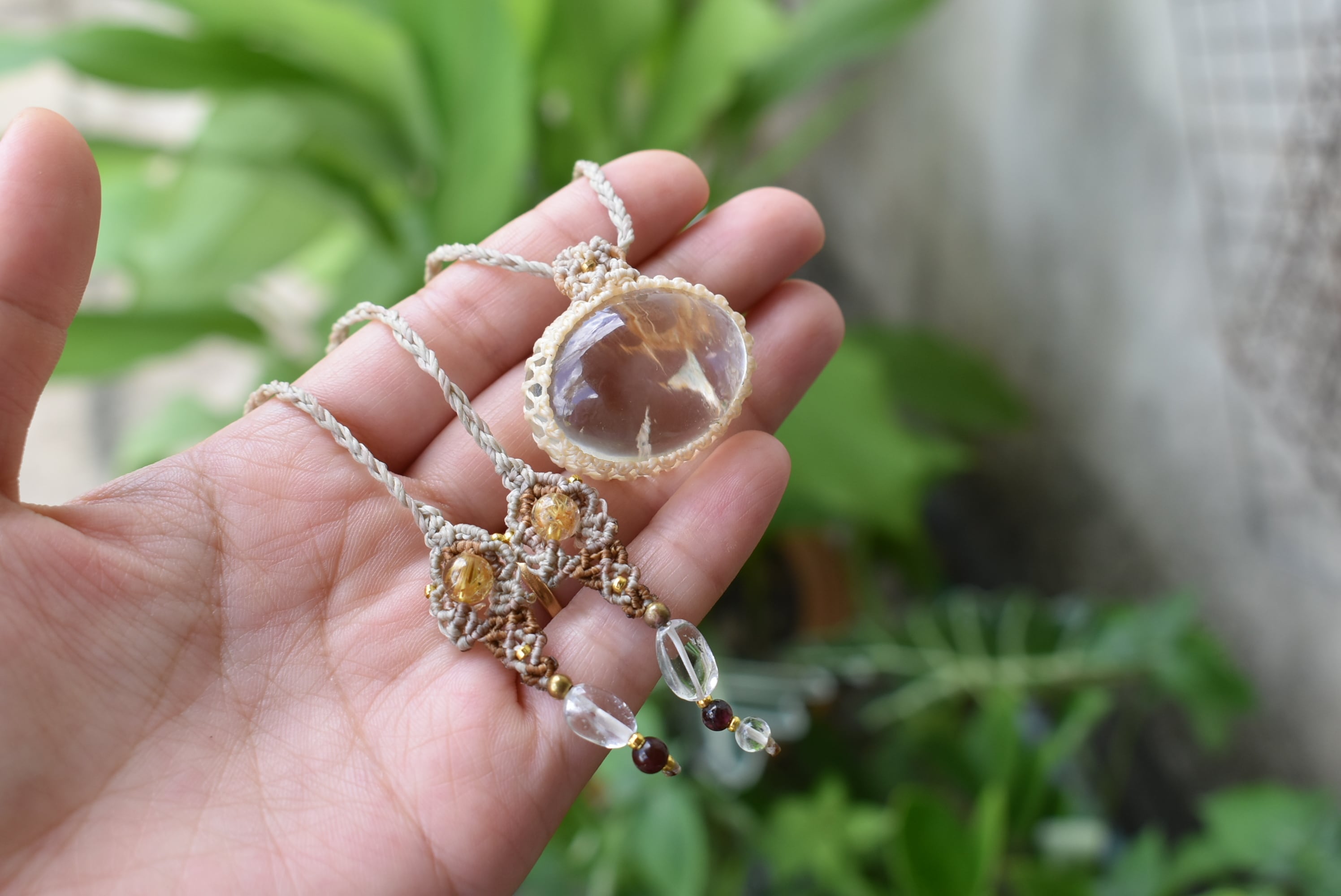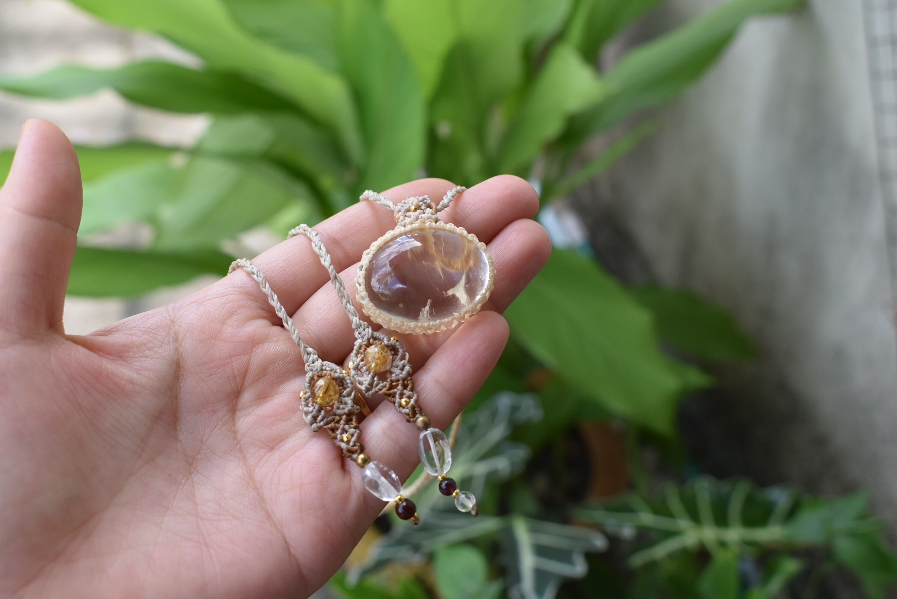 透明感溢れるガーデンクォーツをシンプルにマクラメ編み装飾を施しペンダントに仕上げました。鹿の角のような小さな模様を見ることができます。