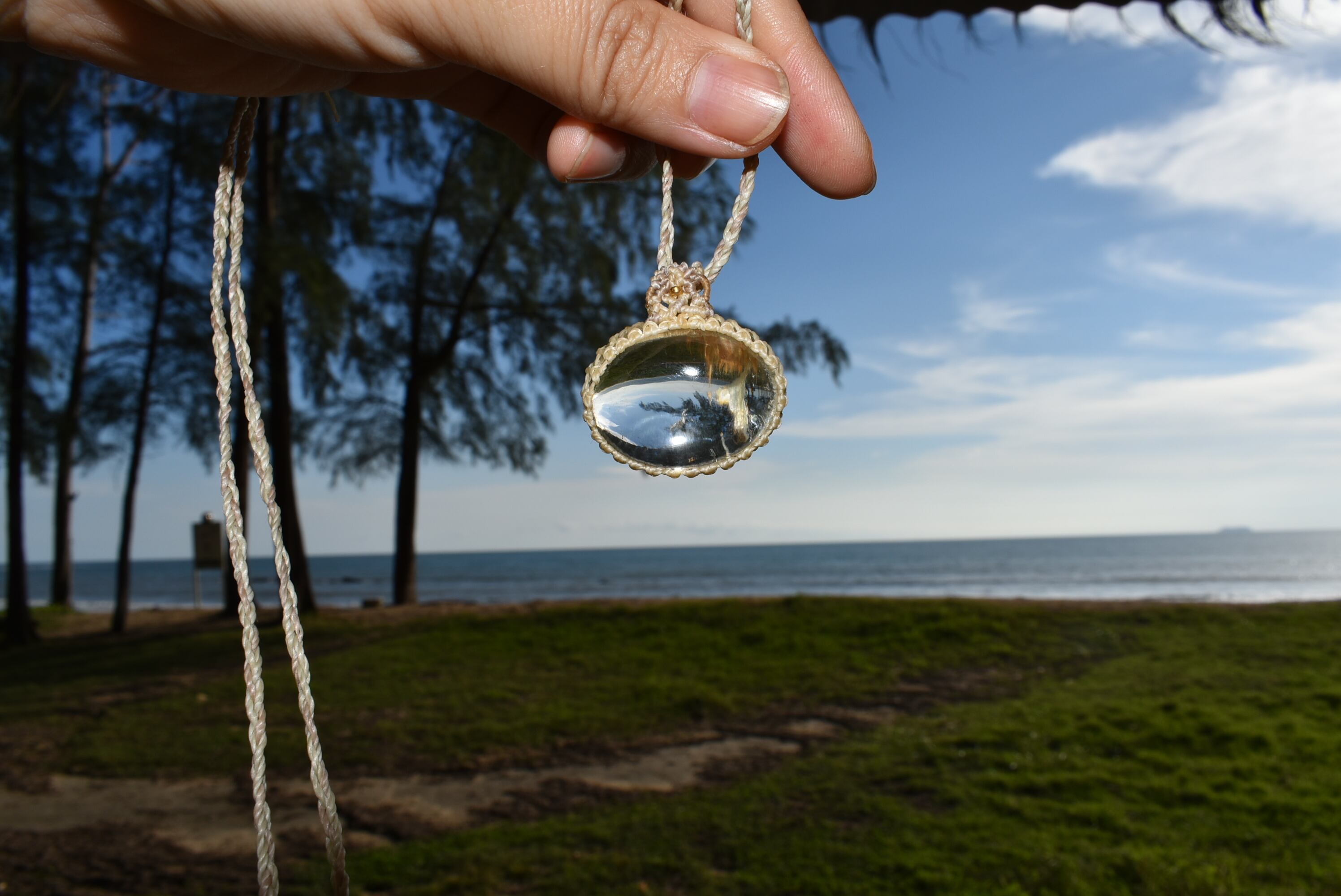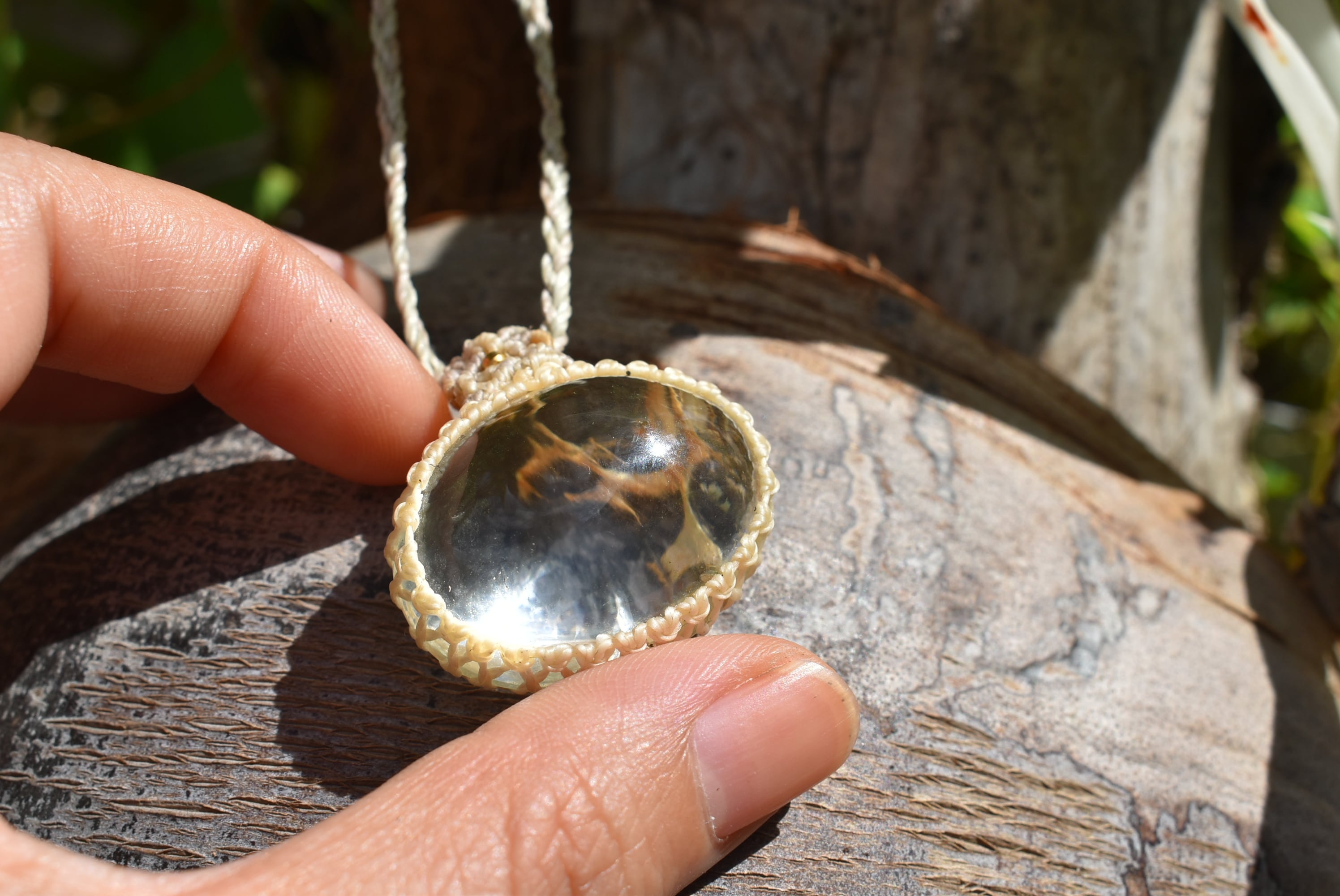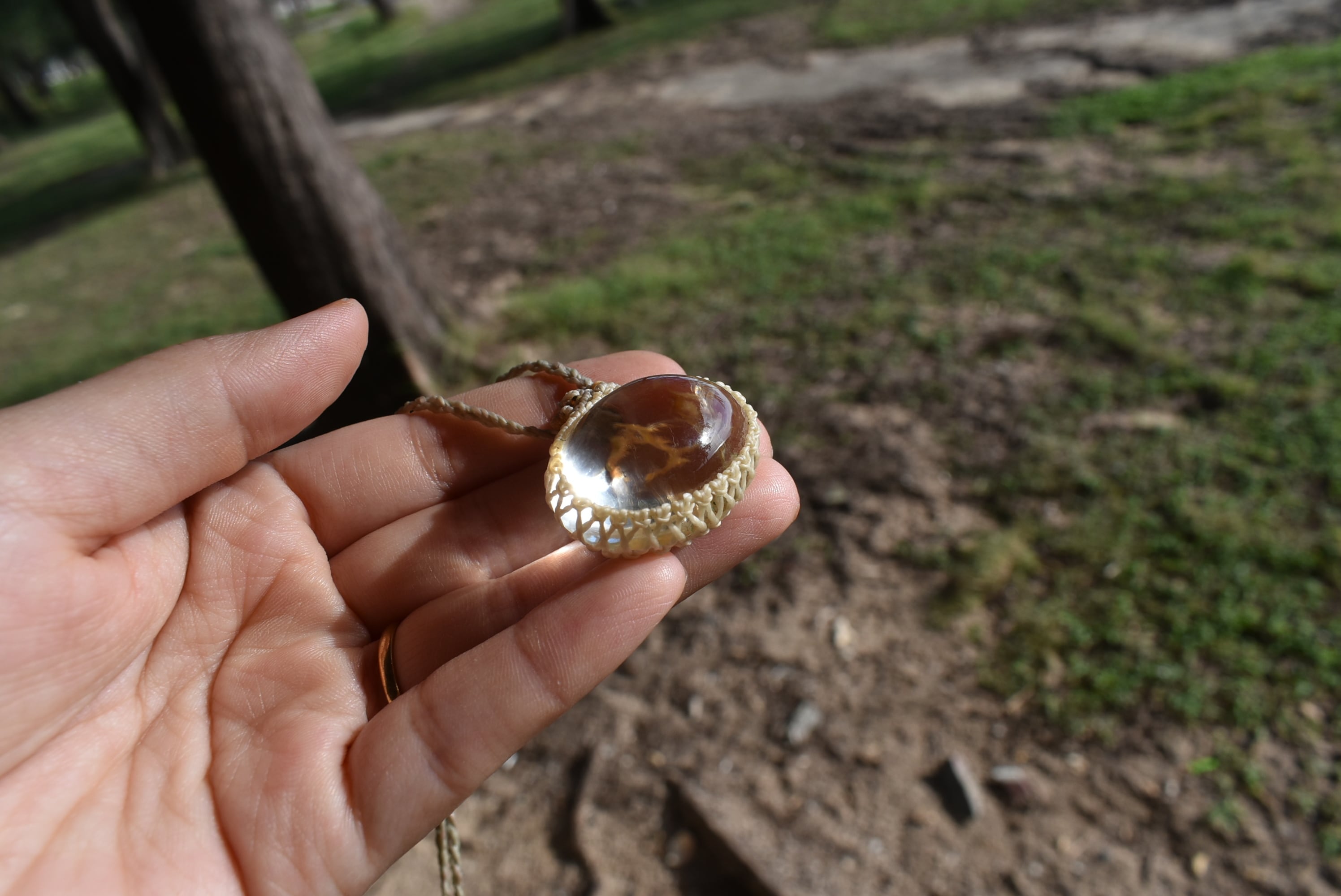 透明感溢れるガーデンクォーツをシンプルにマクラメ編み装飾を施しペンダントに仕上げました。鹿の角のような小さな模様を見ることができます。