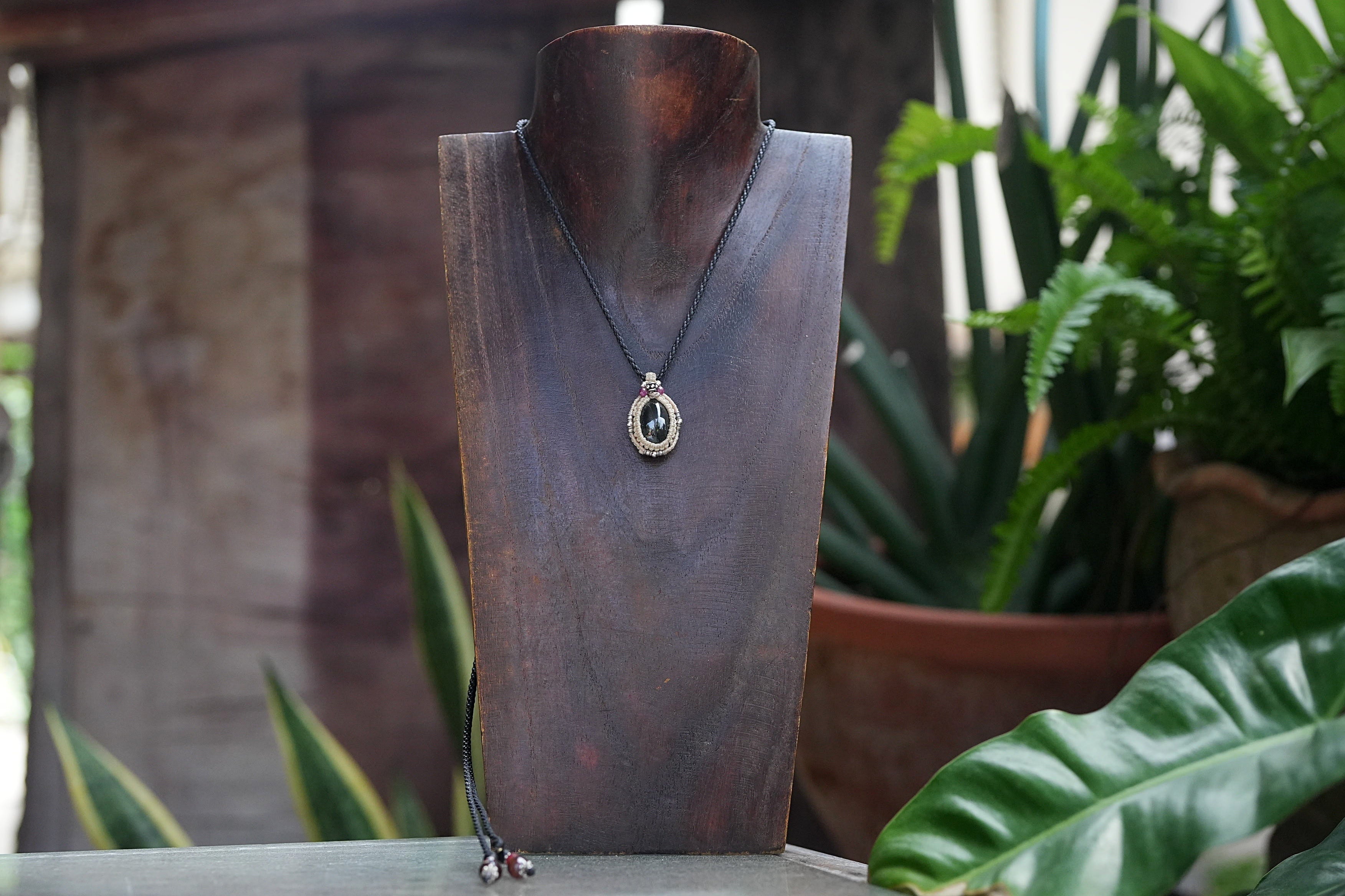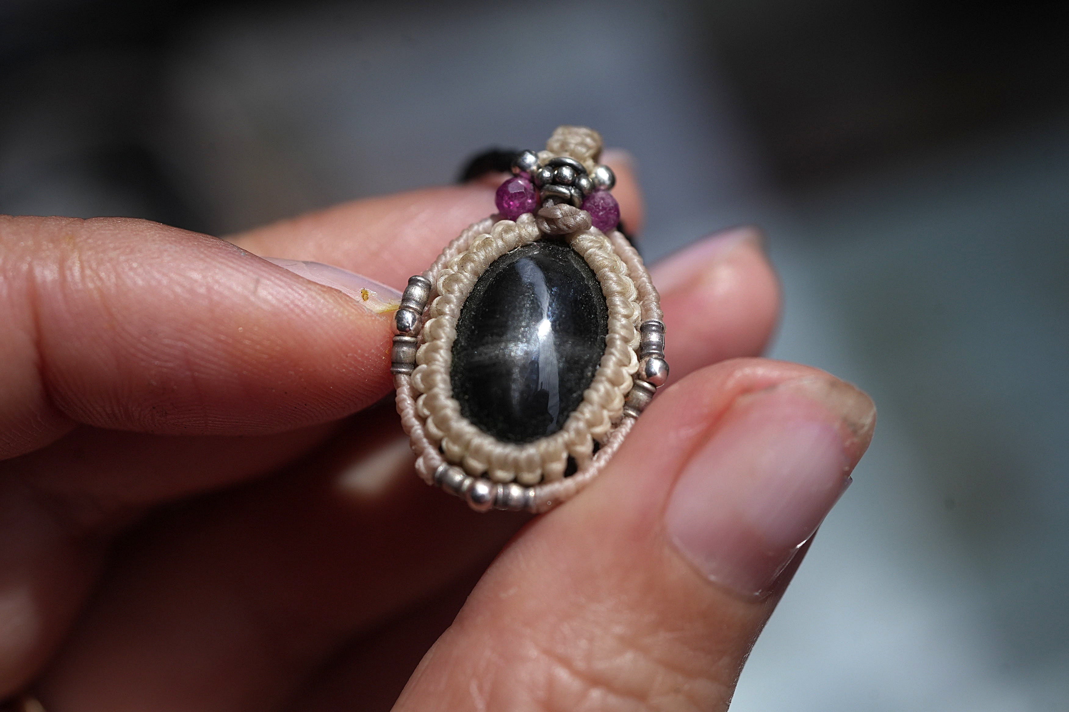 ◆このたびはナチュラルホワイト・ブラック色の蝋引き糸を使用しマクラメ編み装飾を施しました。