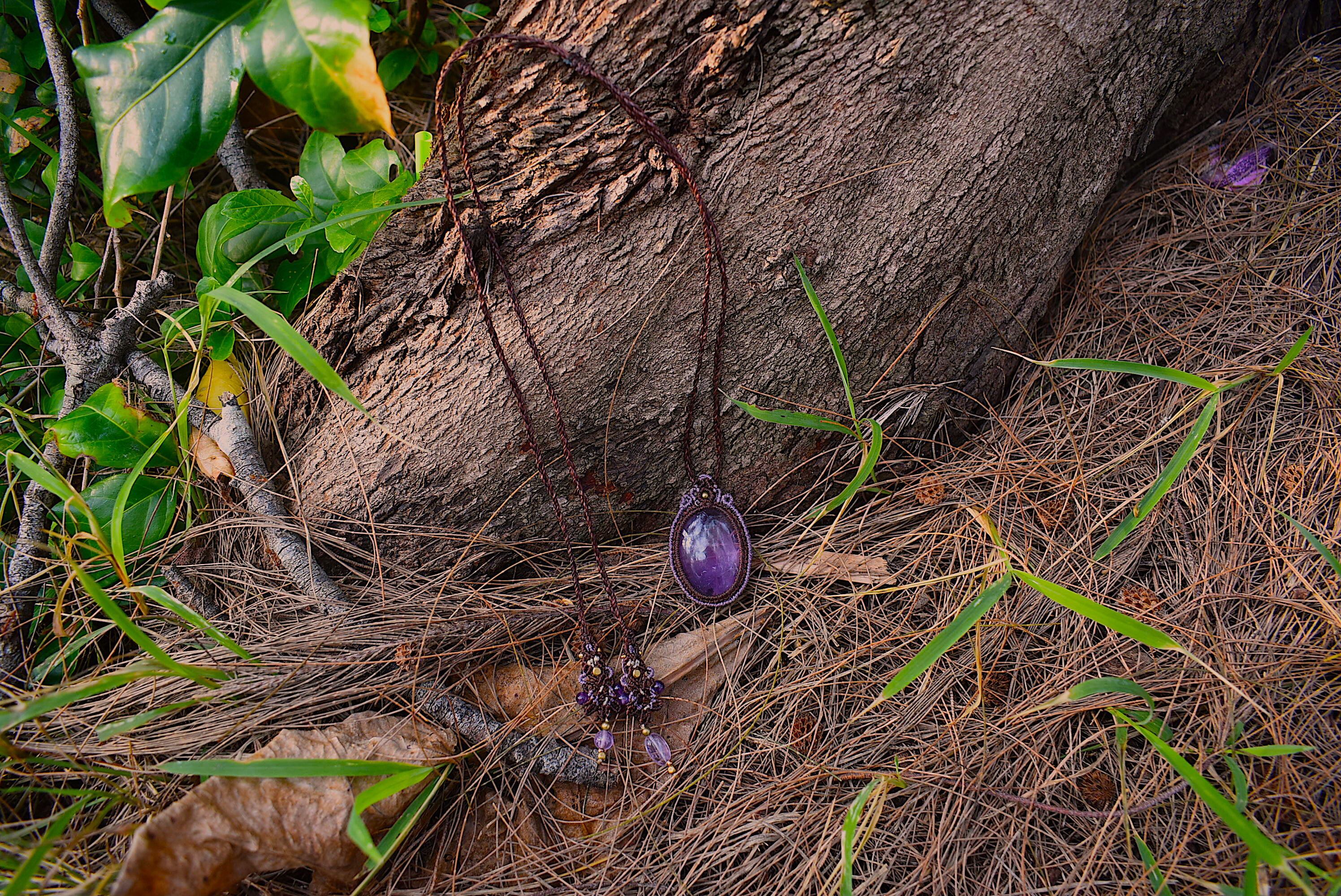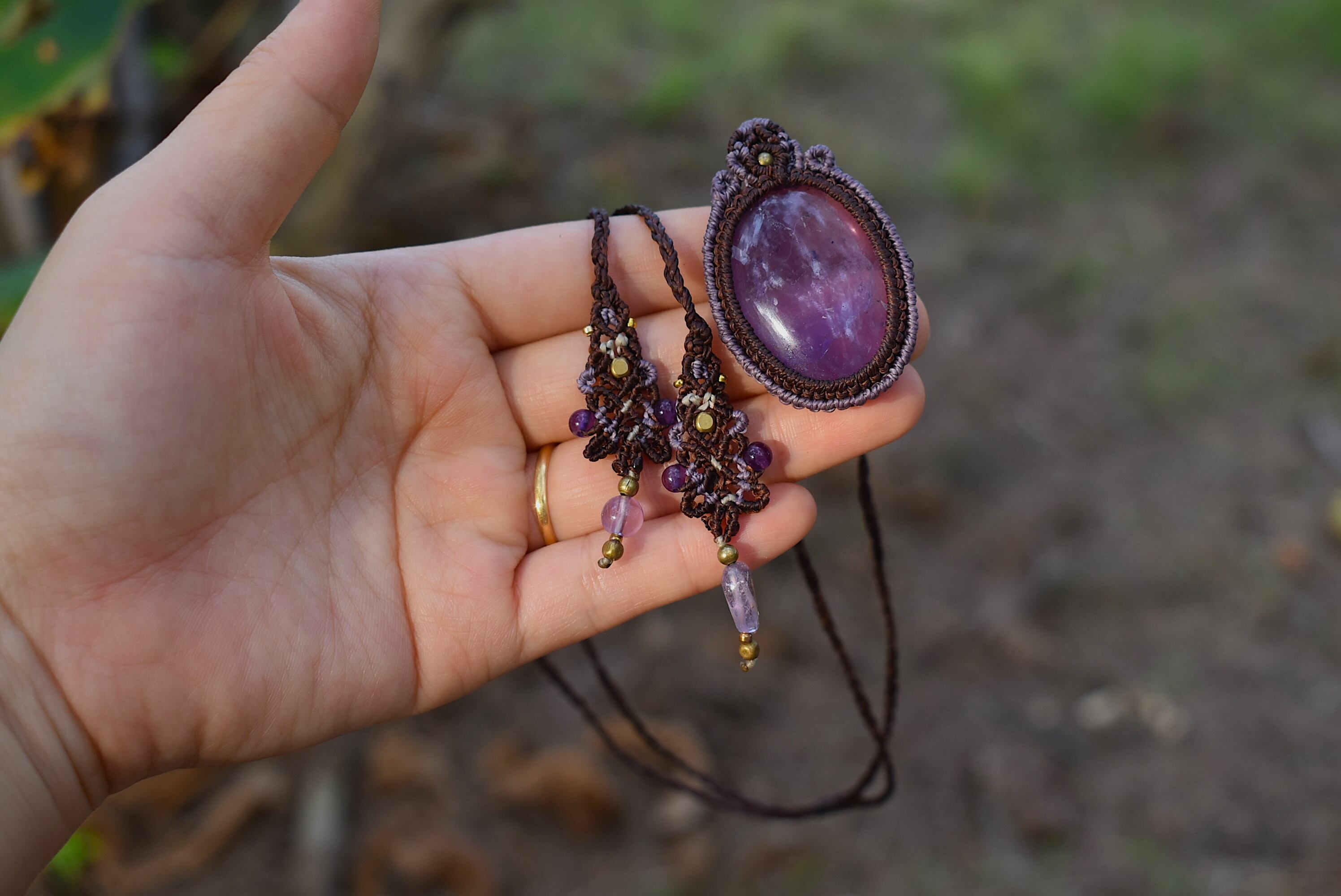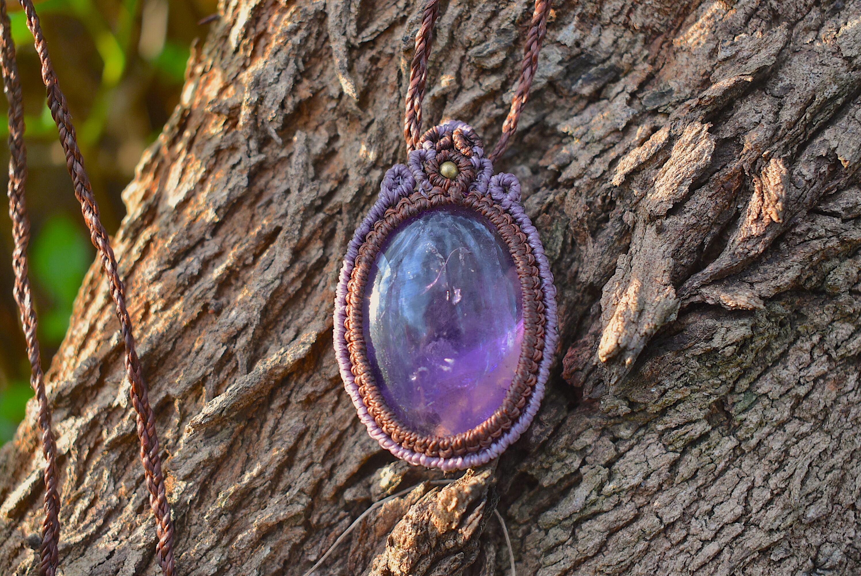 深くディープな紫色が美しく、つるんと研磨されたアメジストをマクラメ編み装飾を施し、ペンダントに仕上げました。