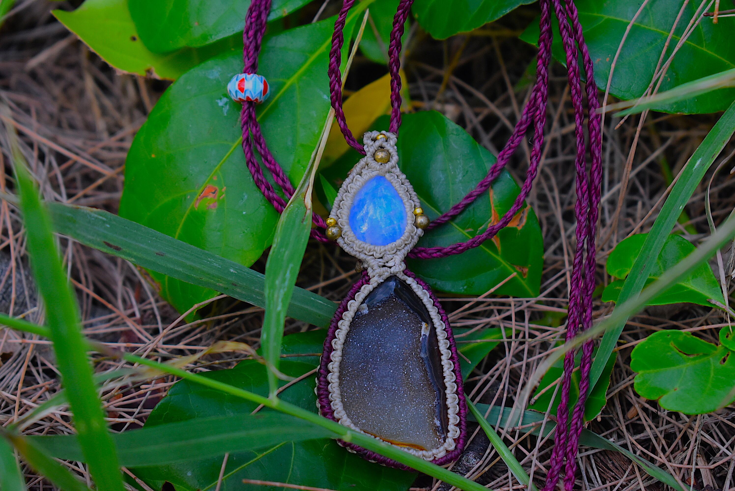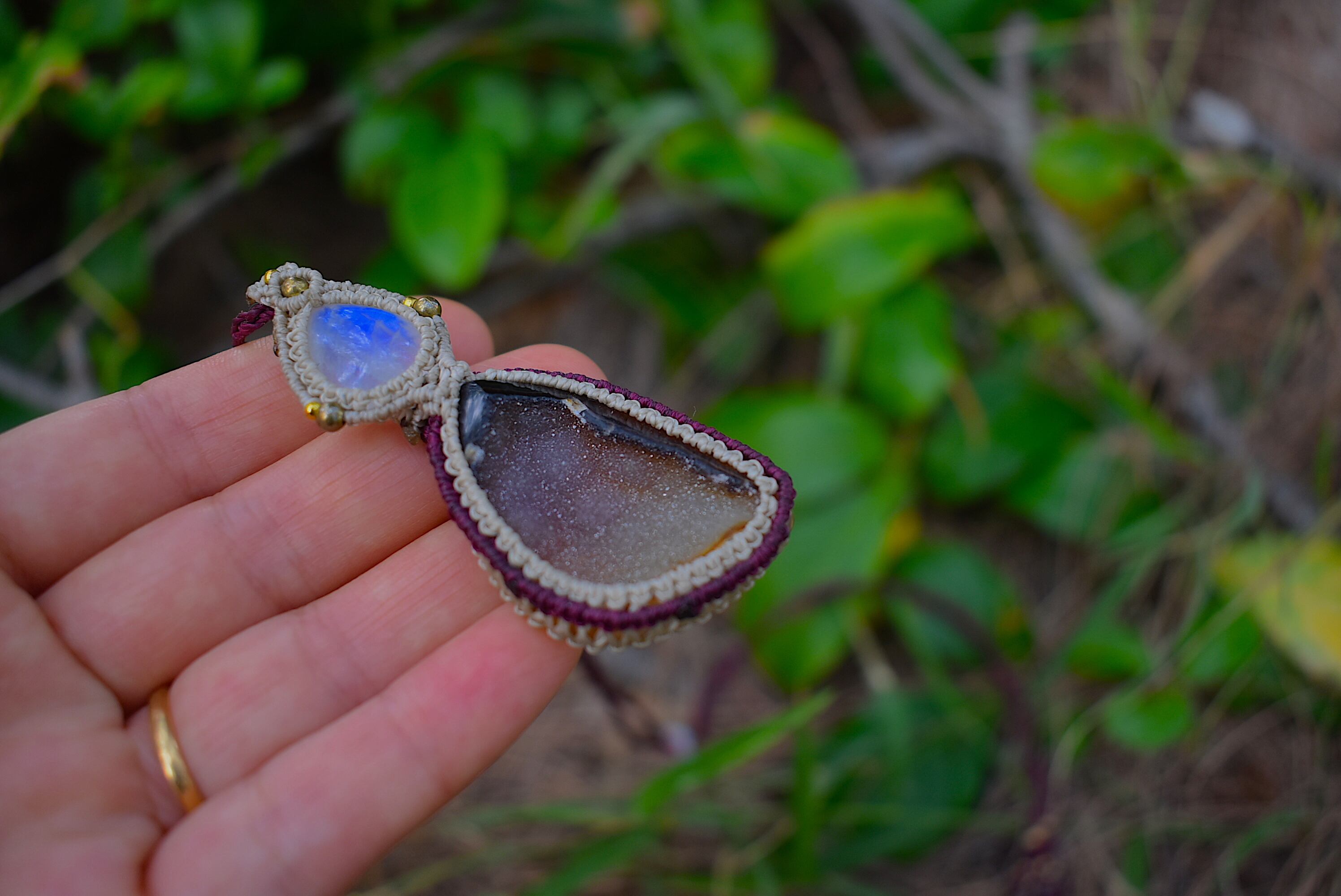 キラキラ光る★ドゥルージーアゲート×ブルームーンストーン マクラメペンダントmoon006