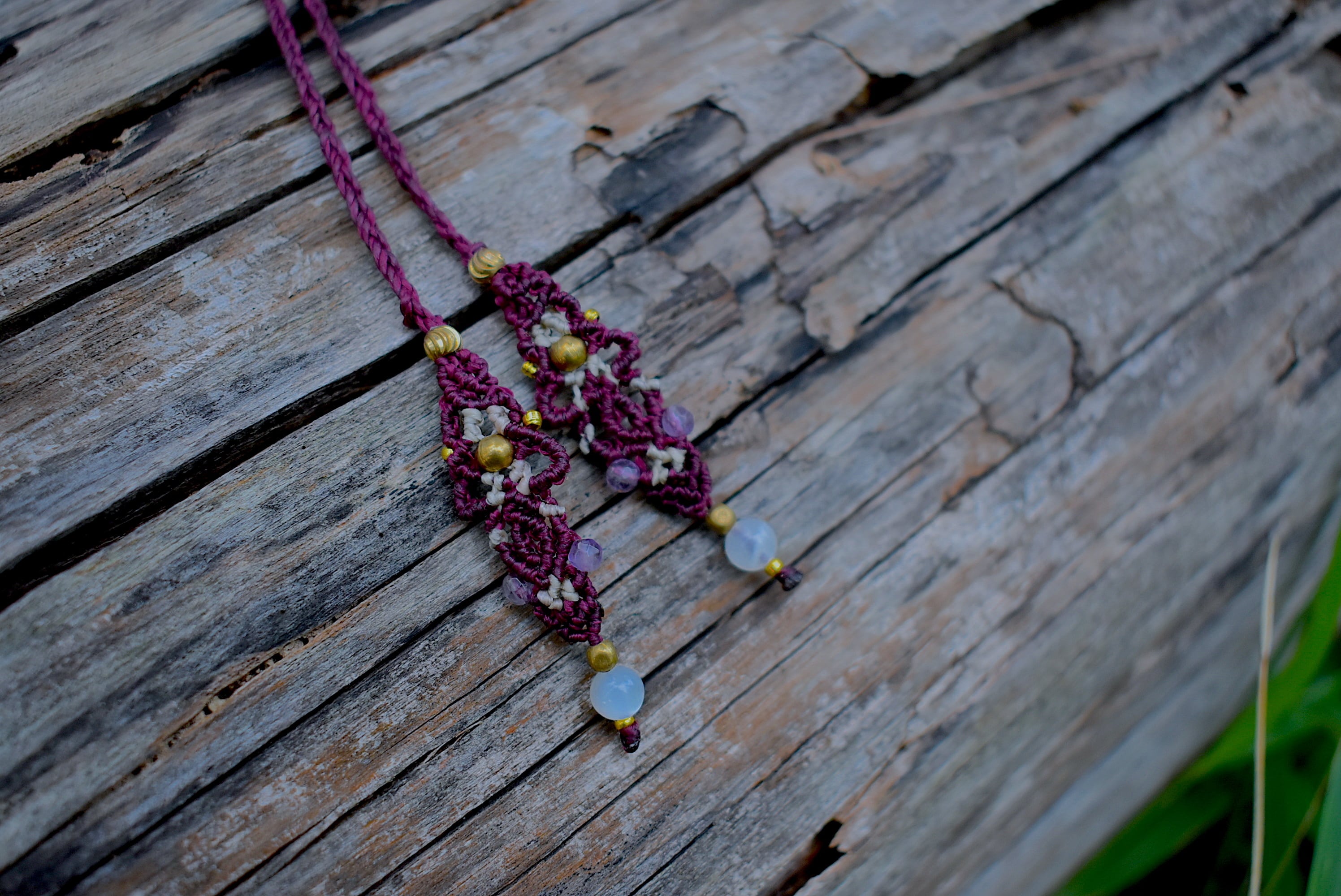 ◆このたびはボルドー、ヘンプの2色の蝋引き糸を使用しマクラメ編み装飾を施しました。