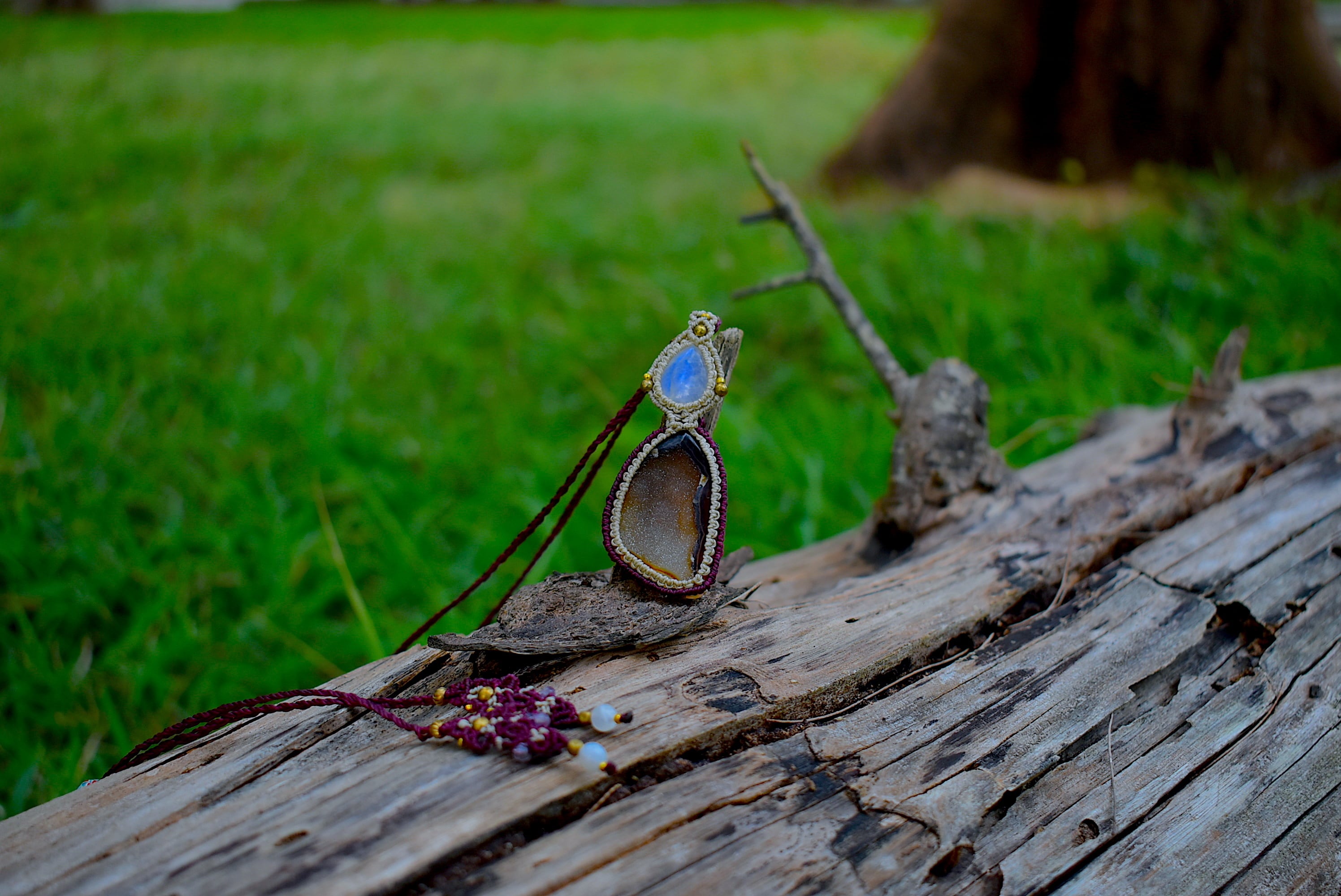 キラキラと眩い反射の光を魅せてくれるドゥルージーアゲートと透き通る良質で美しいムーンストーンをひとつにし、シンプルにマクラメ編み装飾を施しました。