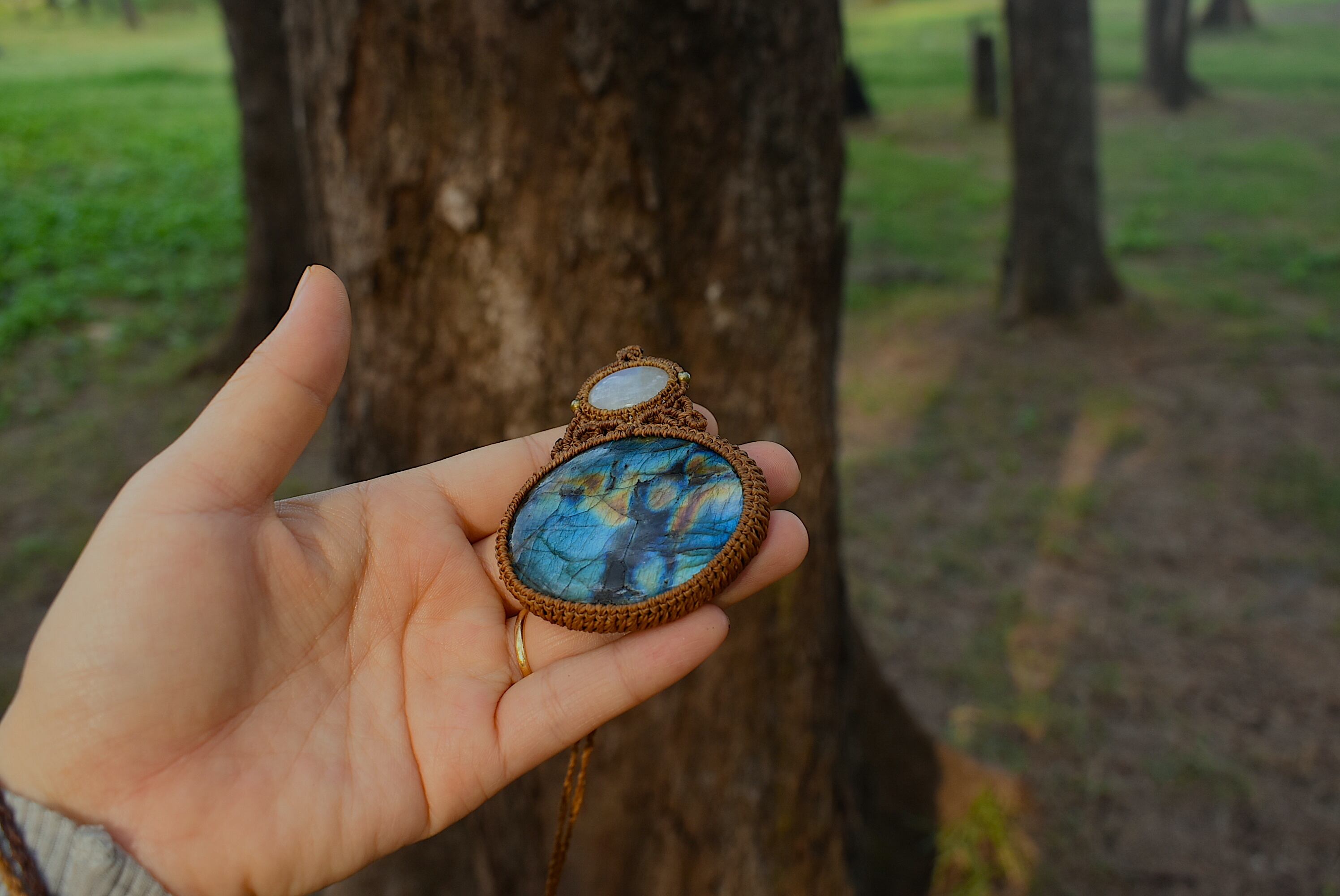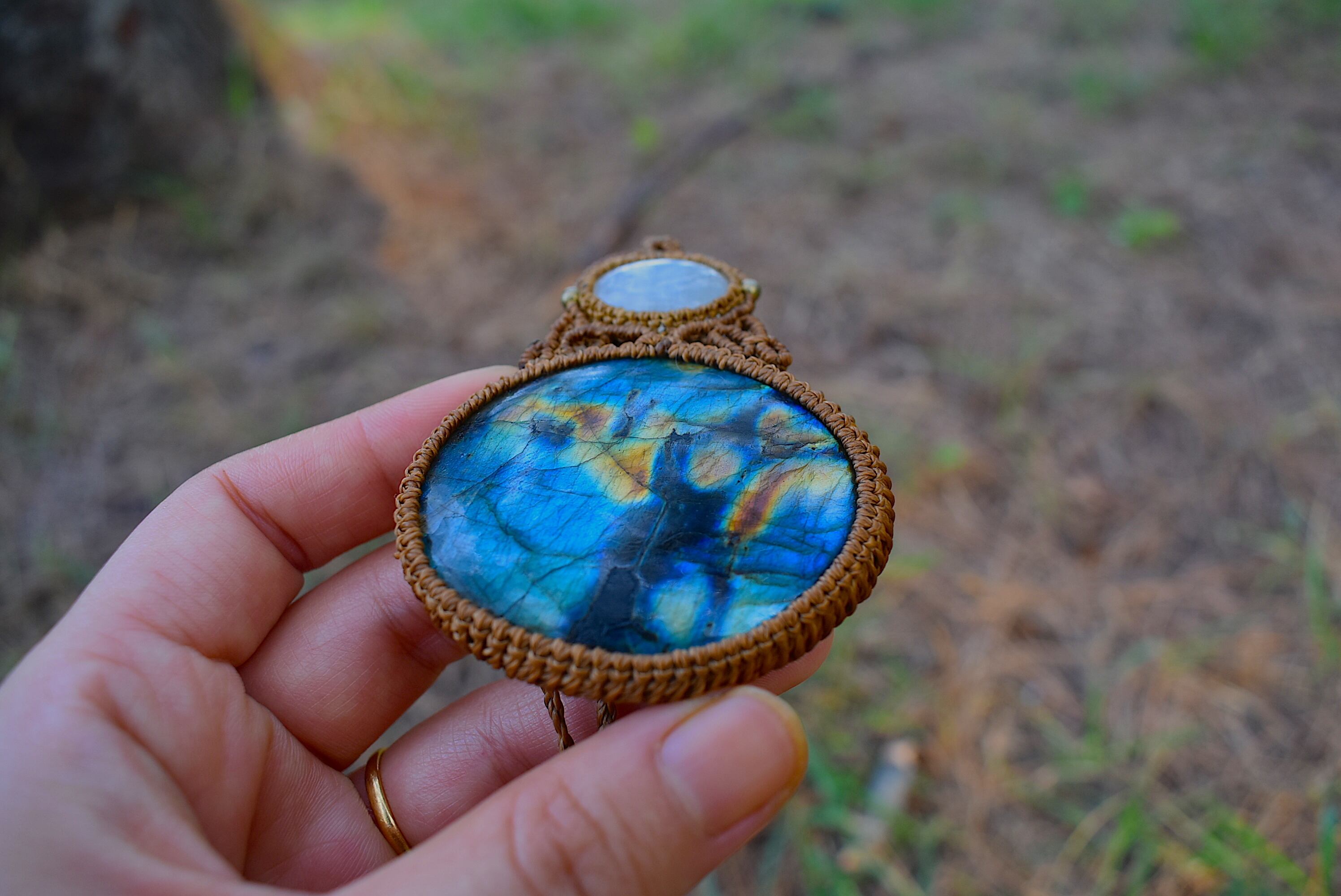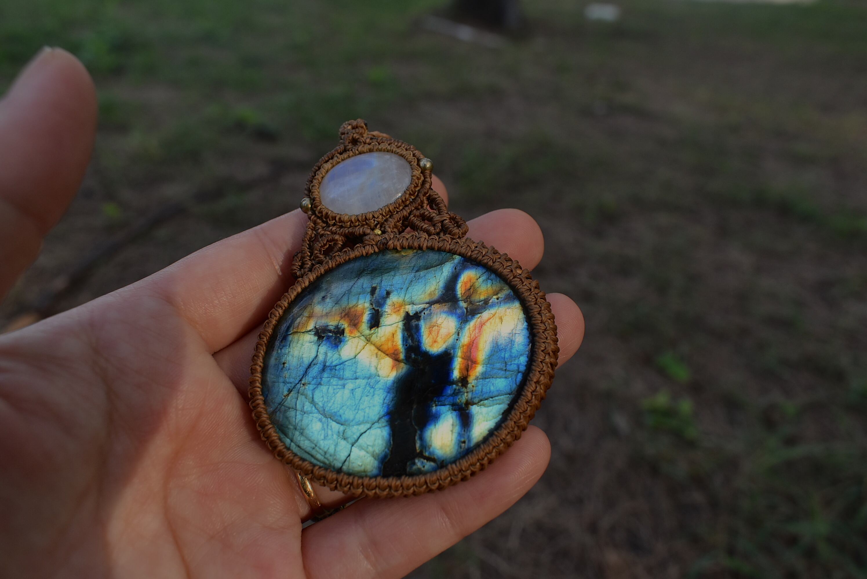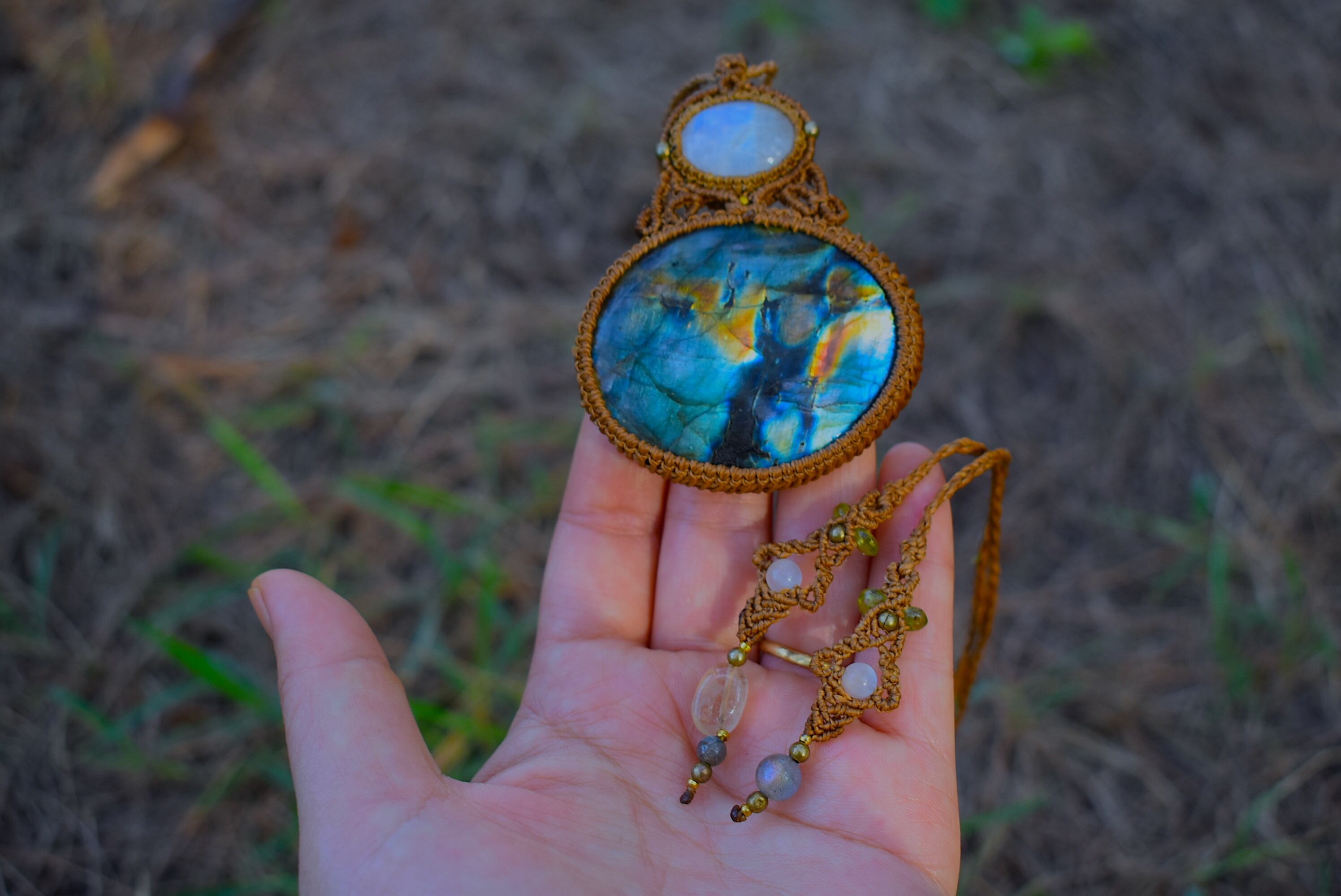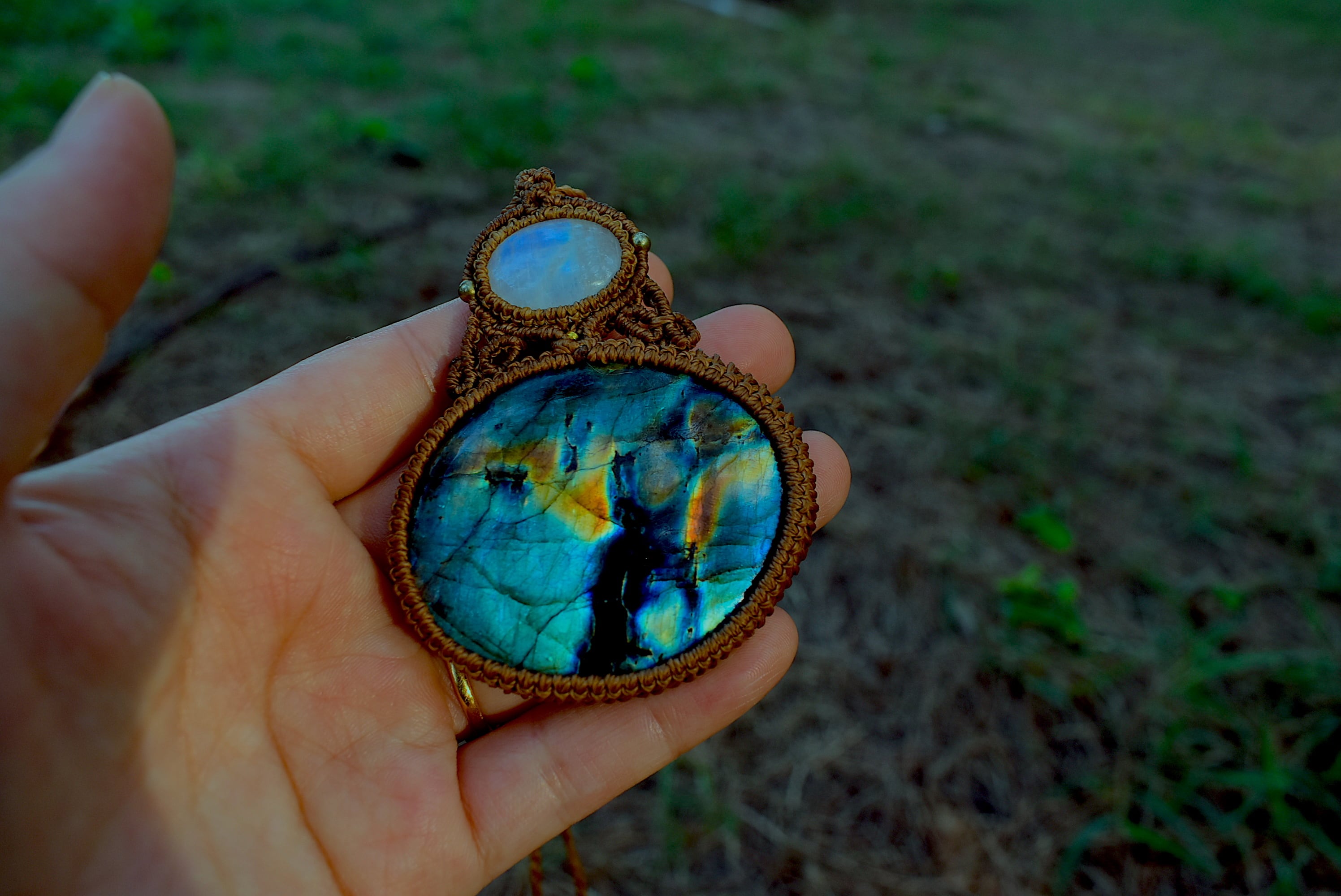 宇宙と交信★マルチラブラドライトマト×レインボーブルームーンストーン マクラメペンダント