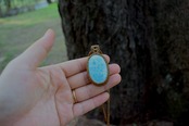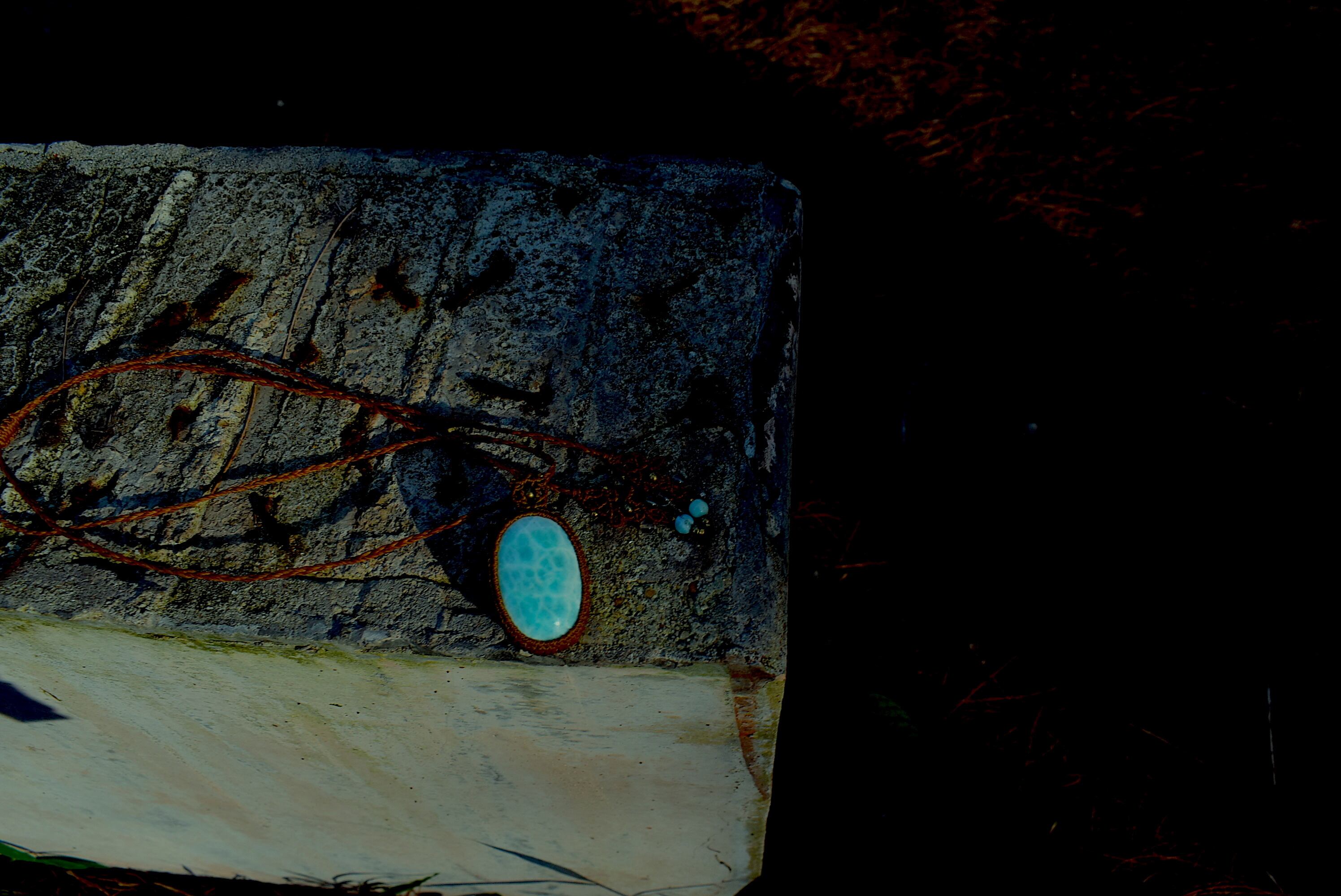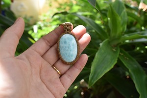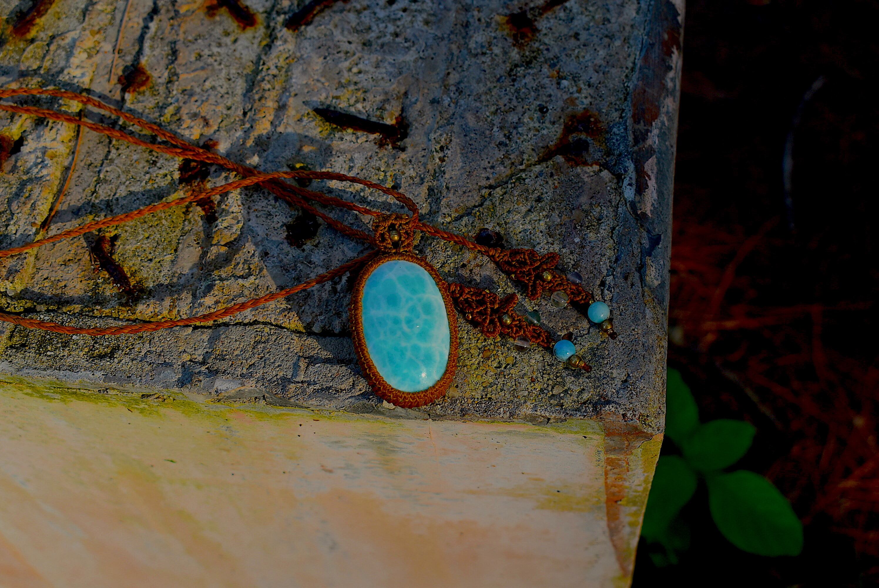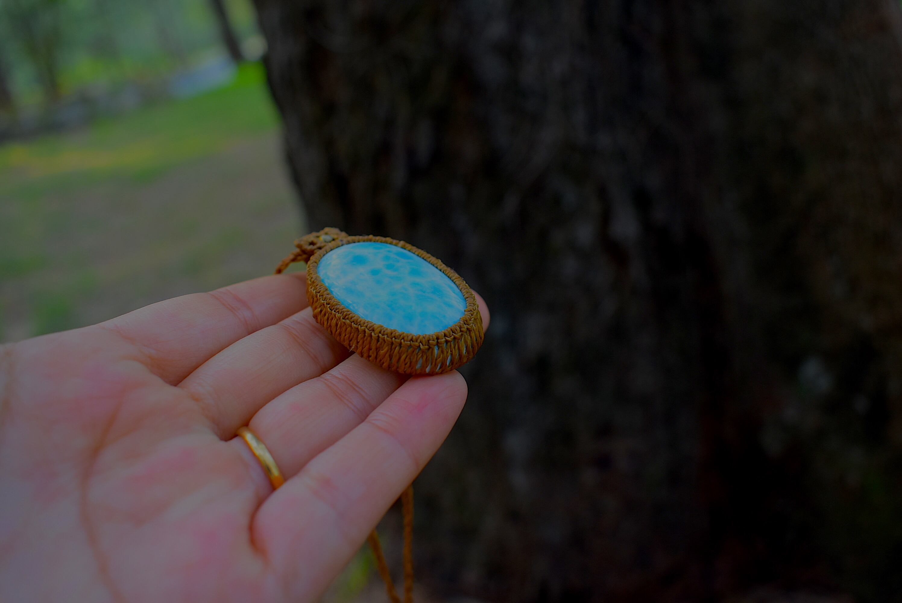 石の厚みの充分にあり、何より身につけた時の色味が日本人の肌にぴったりとあった良質なラリマーです。このたびはトップの部分のみを真鍮ビーズとともにマクラメ編み装飾を施してペンダントに仕上げました。
