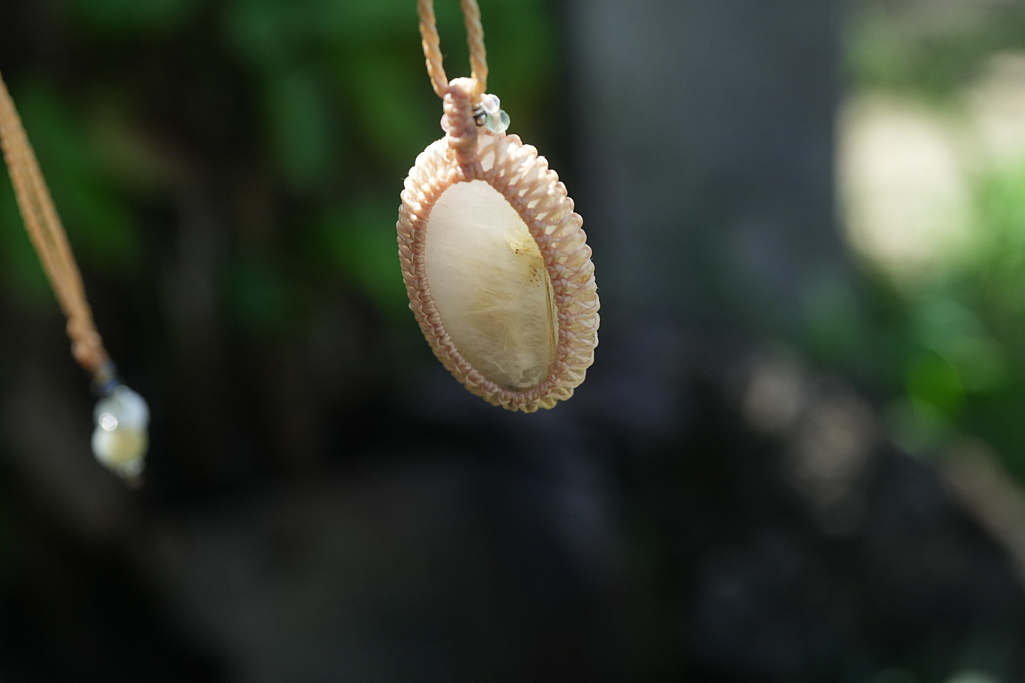 ◆このたびはキャラメル色の蝋引き糸を使用しマクラメ編み装飾を施しました。