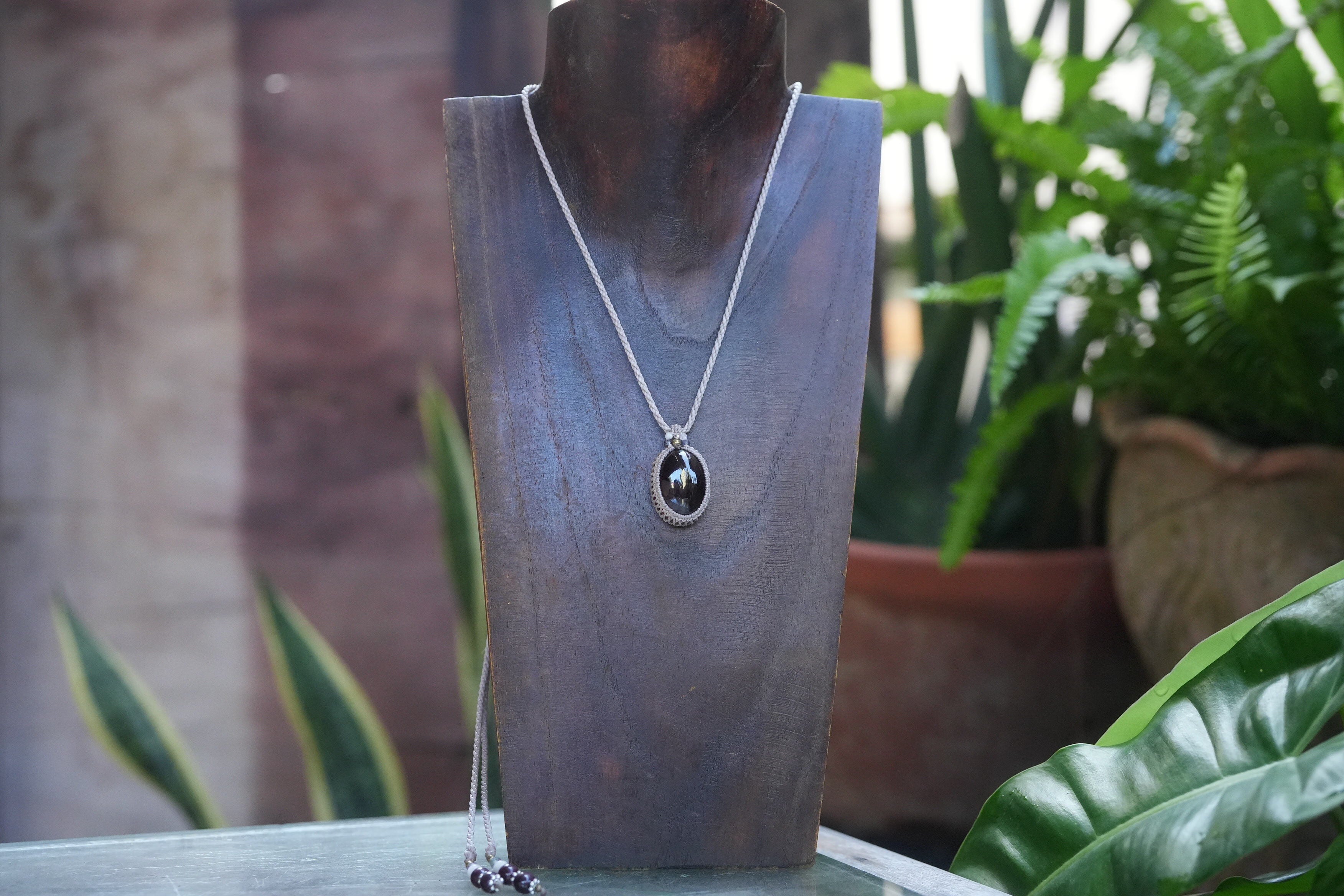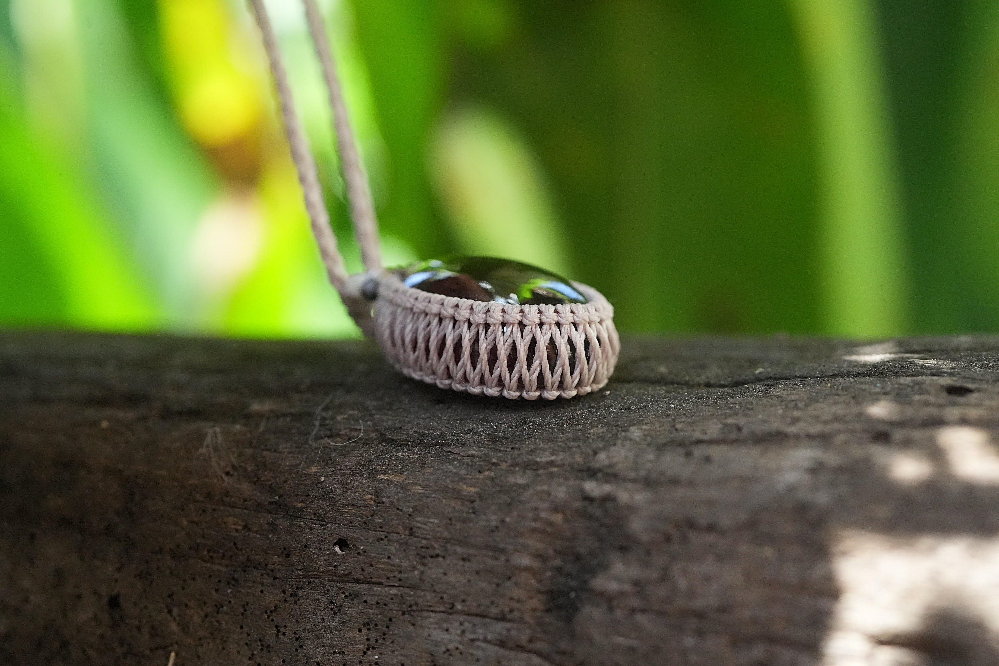 ◆このたびはキナリ、カフェオレ色の蝋引き糸を使用しマクラメ編み装飾を施しました。