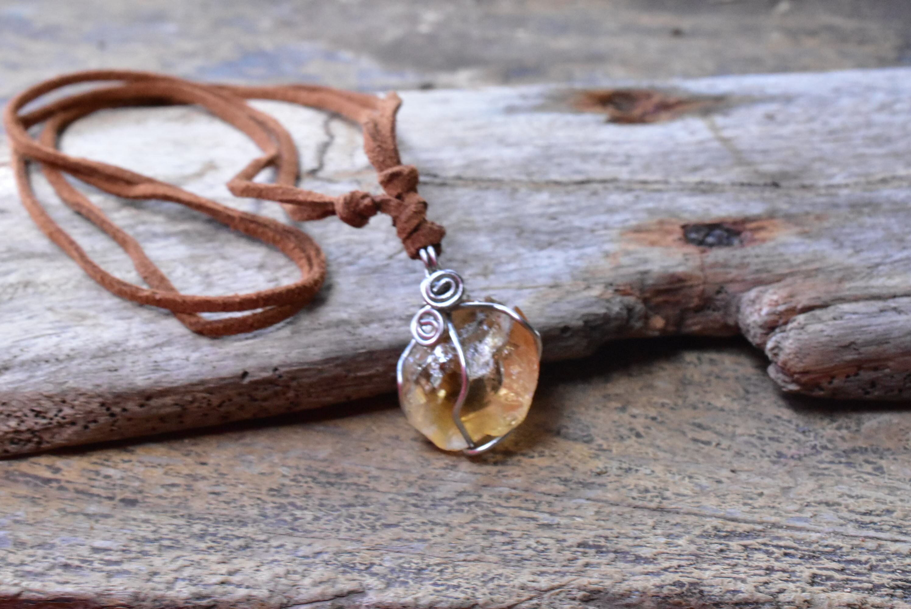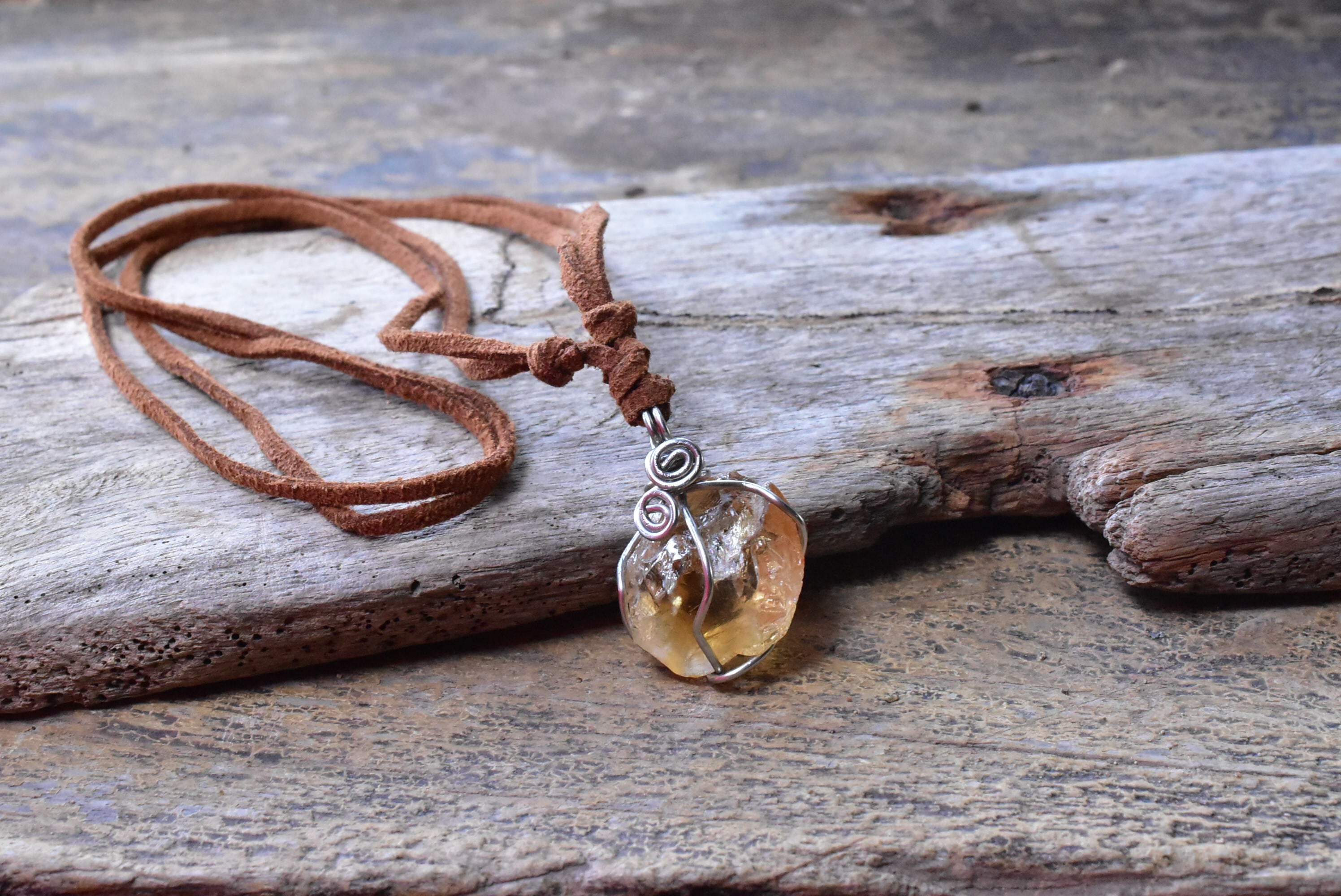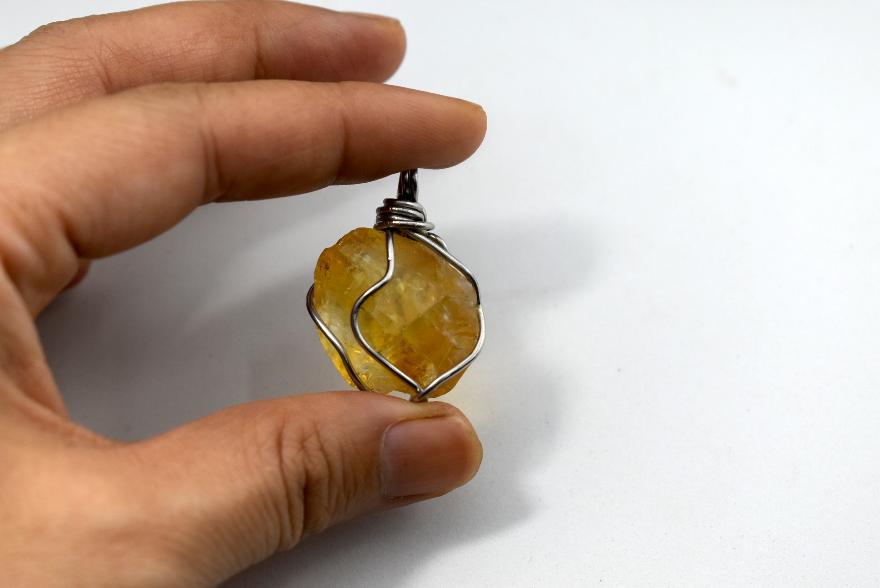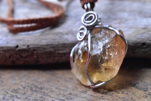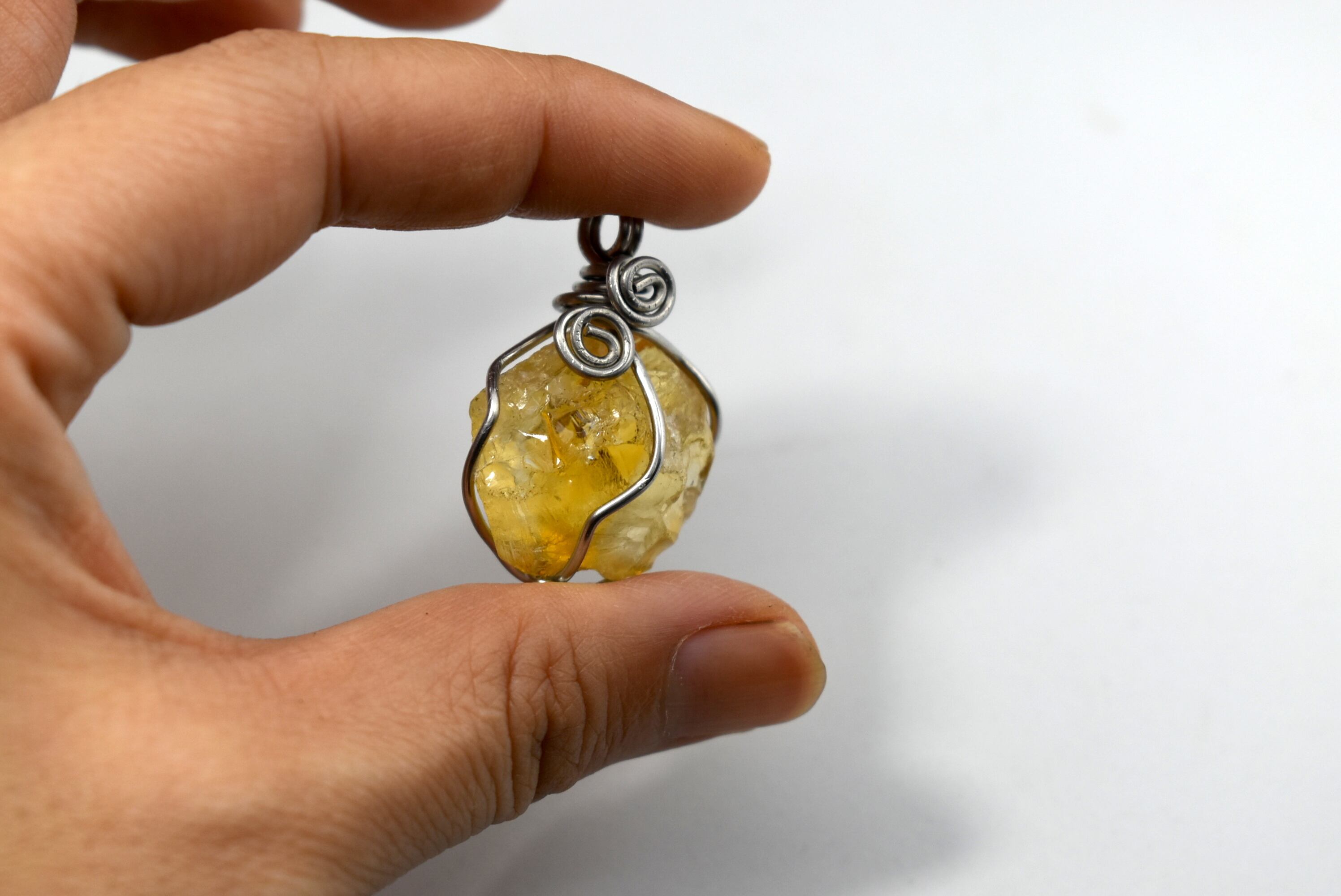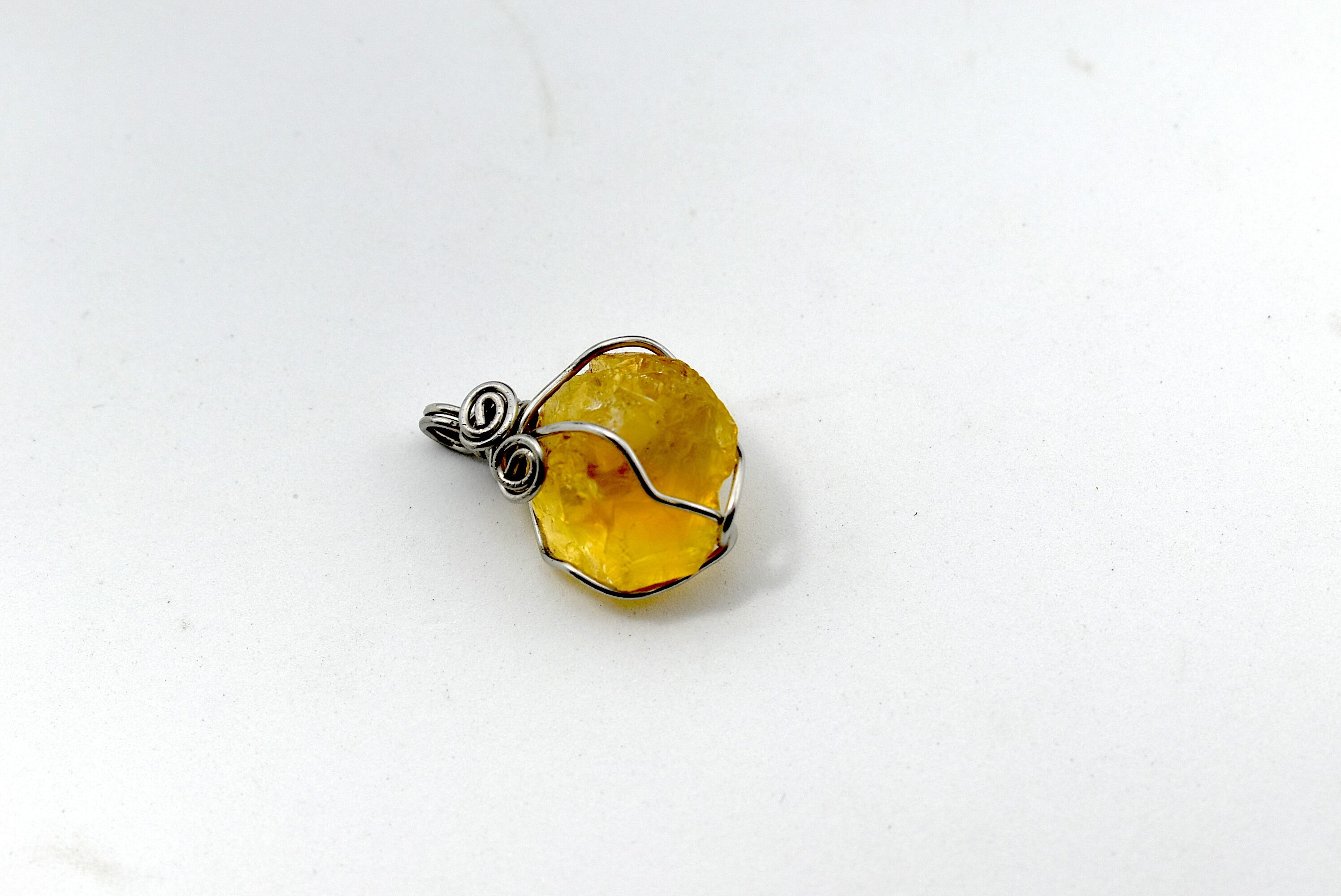 天然石シトリン原石を使用し、ワイヤーワークを施してペンダントトップに仕上げました。石の周りをぐるっとワイヤーで囲んであります。