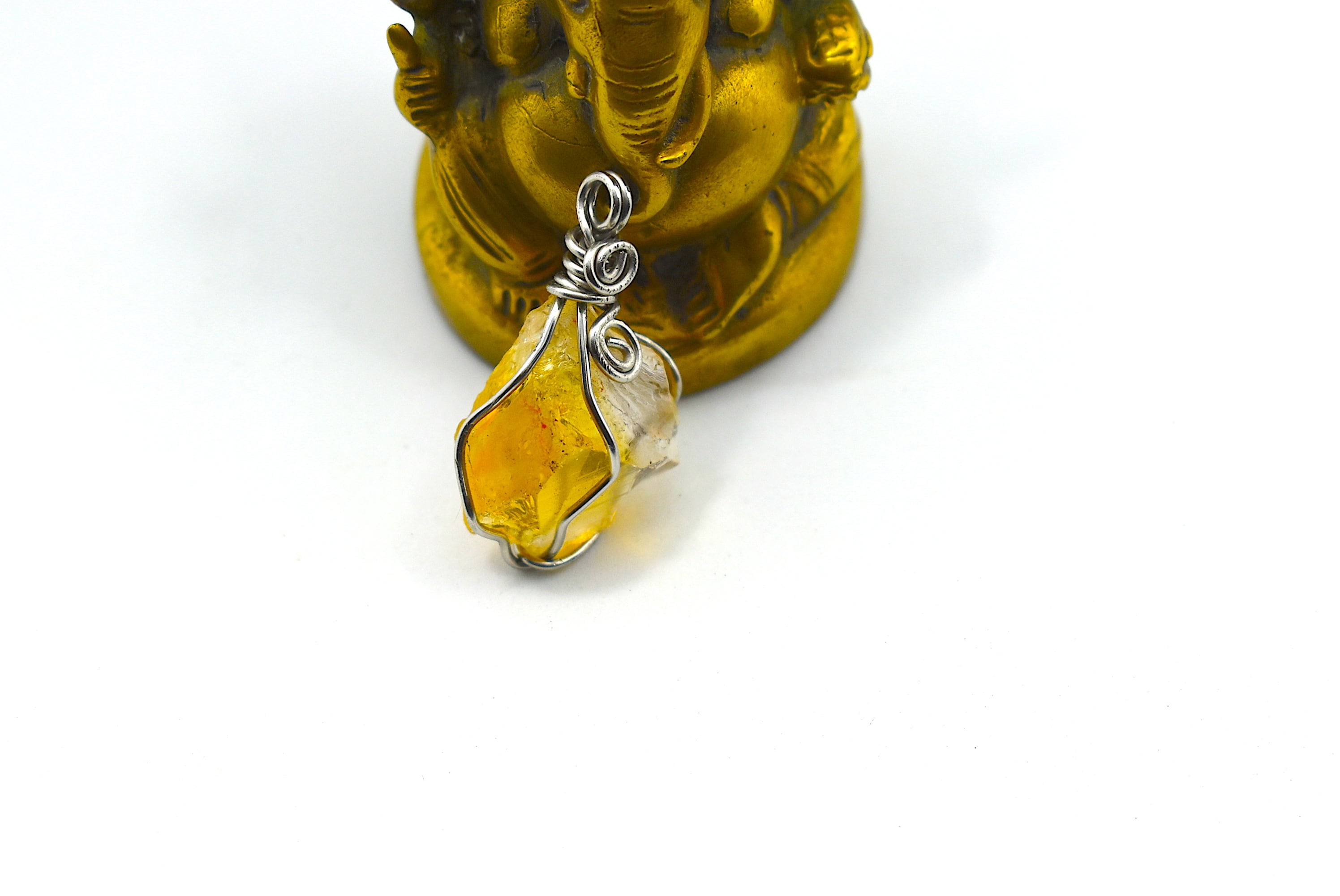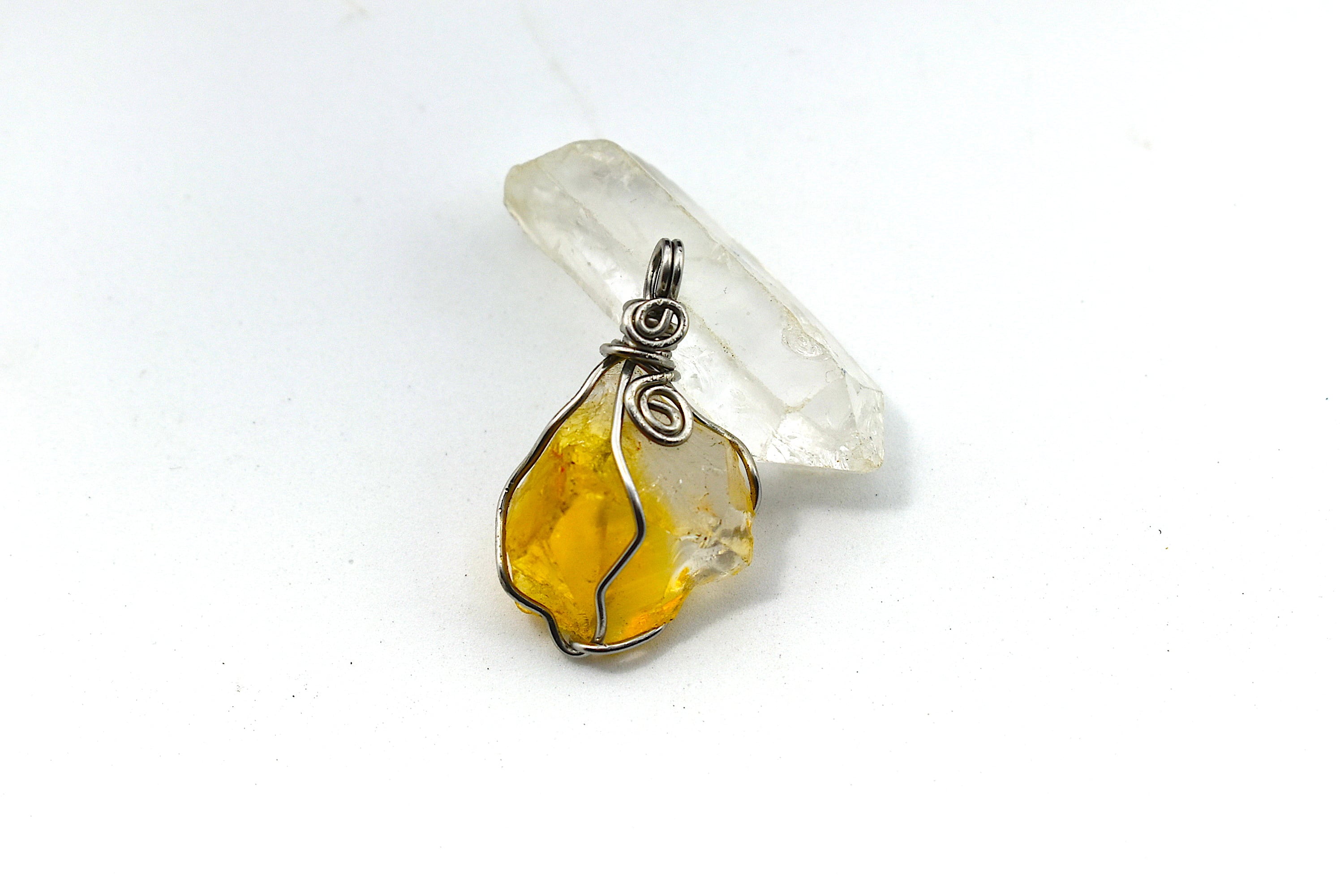 天然石シトリン原石を使用し、ワイヤーワークを施してペンダントトップに仕上げました。石の周りをぐるっとワイヤーで囲んであります。