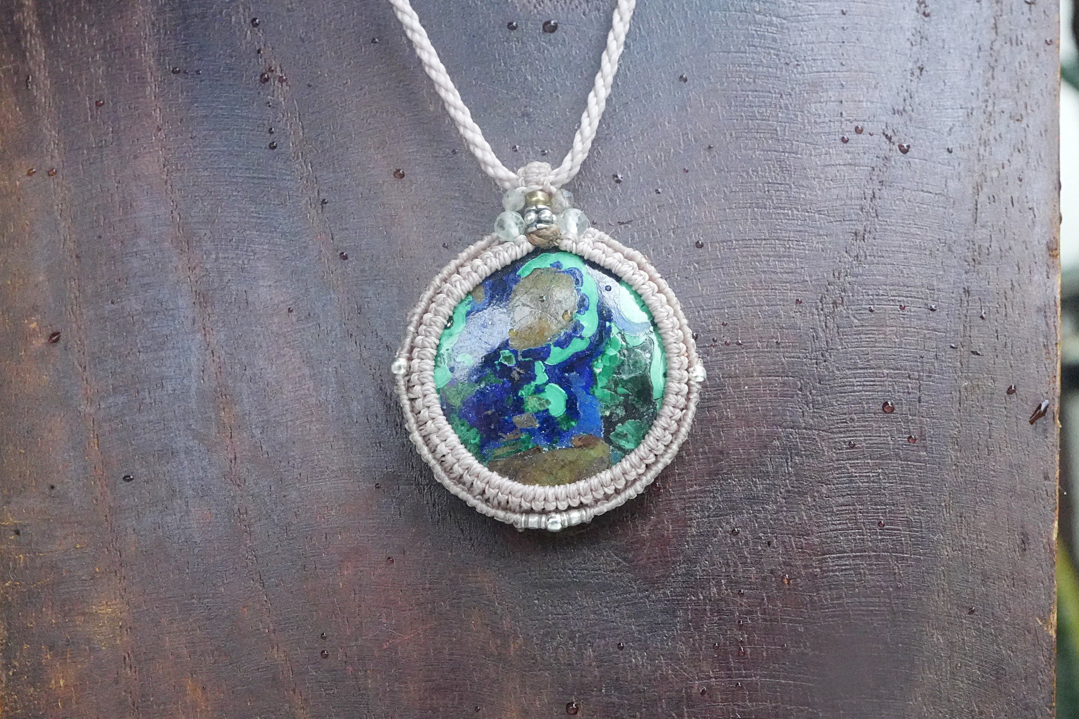 ◆このたびはキナリ、ヘンプ色の蝋引き糸を使用しマクラメ編み装飾を施しました。