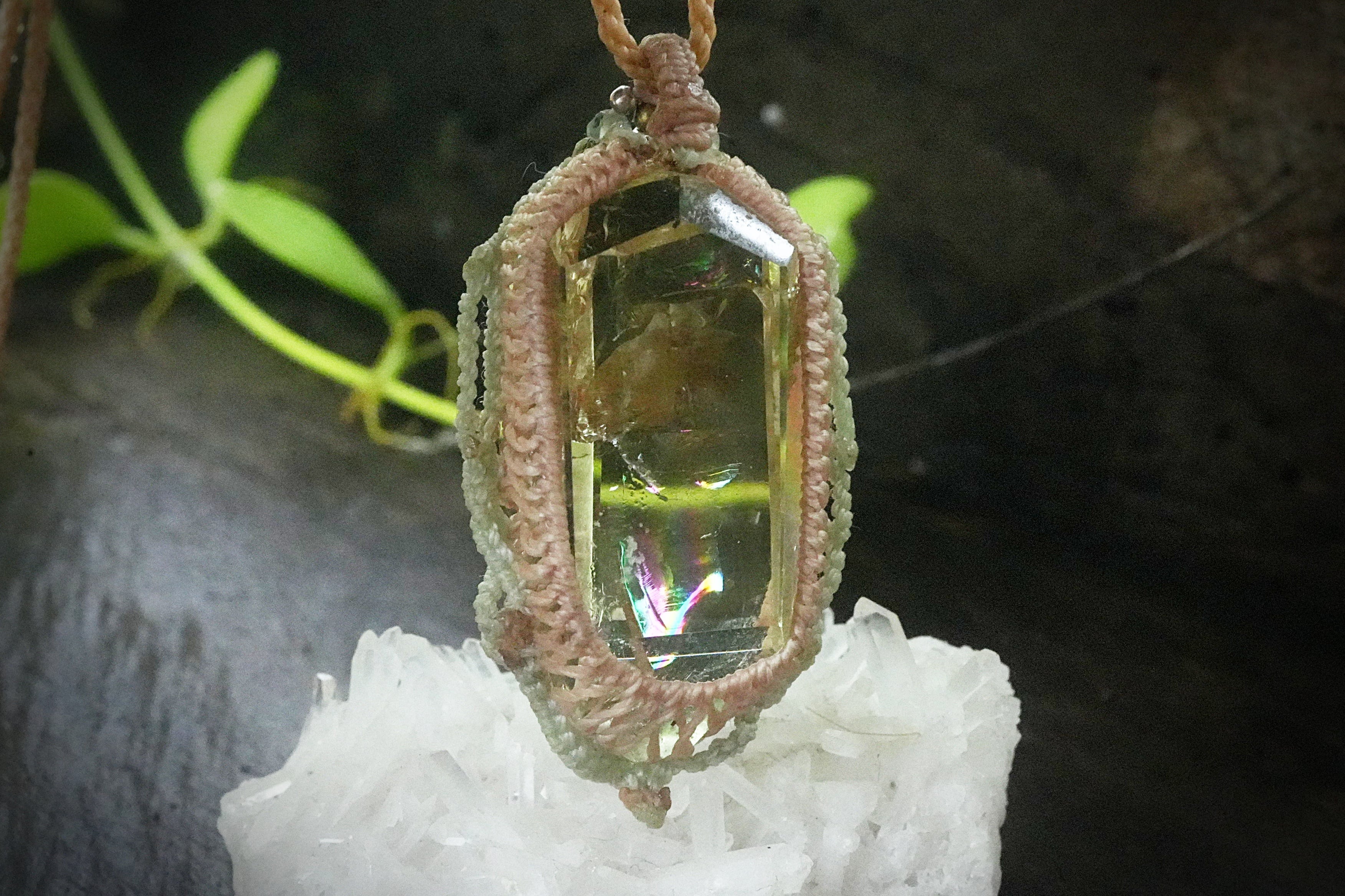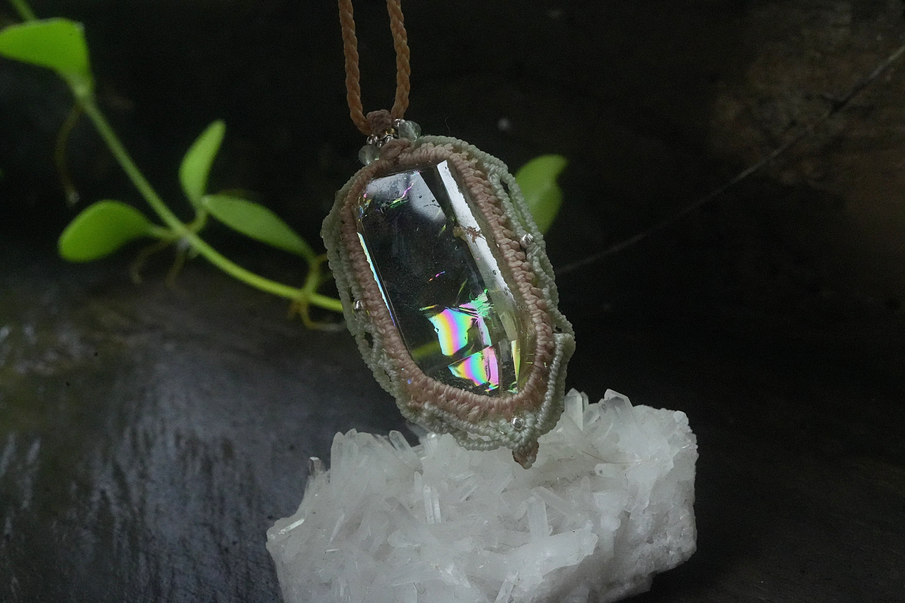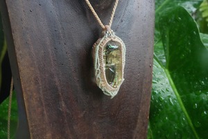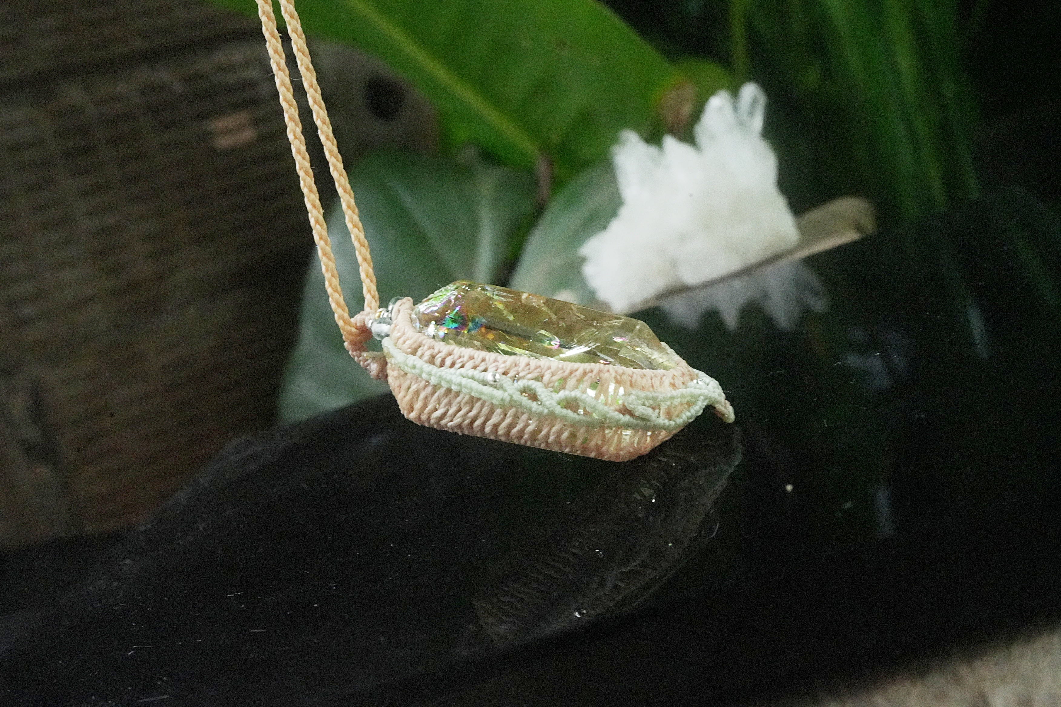 ◆このたびはキャラメル、ミントグリーン色の蝋引き糸を使用しマクラメ編み装飾を施しました。