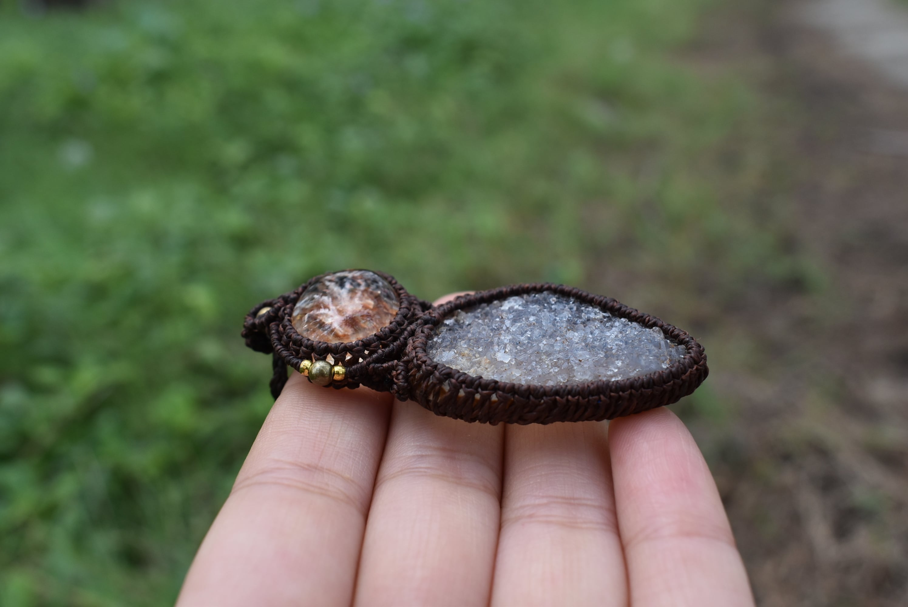 ◆このたびはコーヒーブラウンの蝋引き糸を使用しマクラメ編み装飾を施しました。