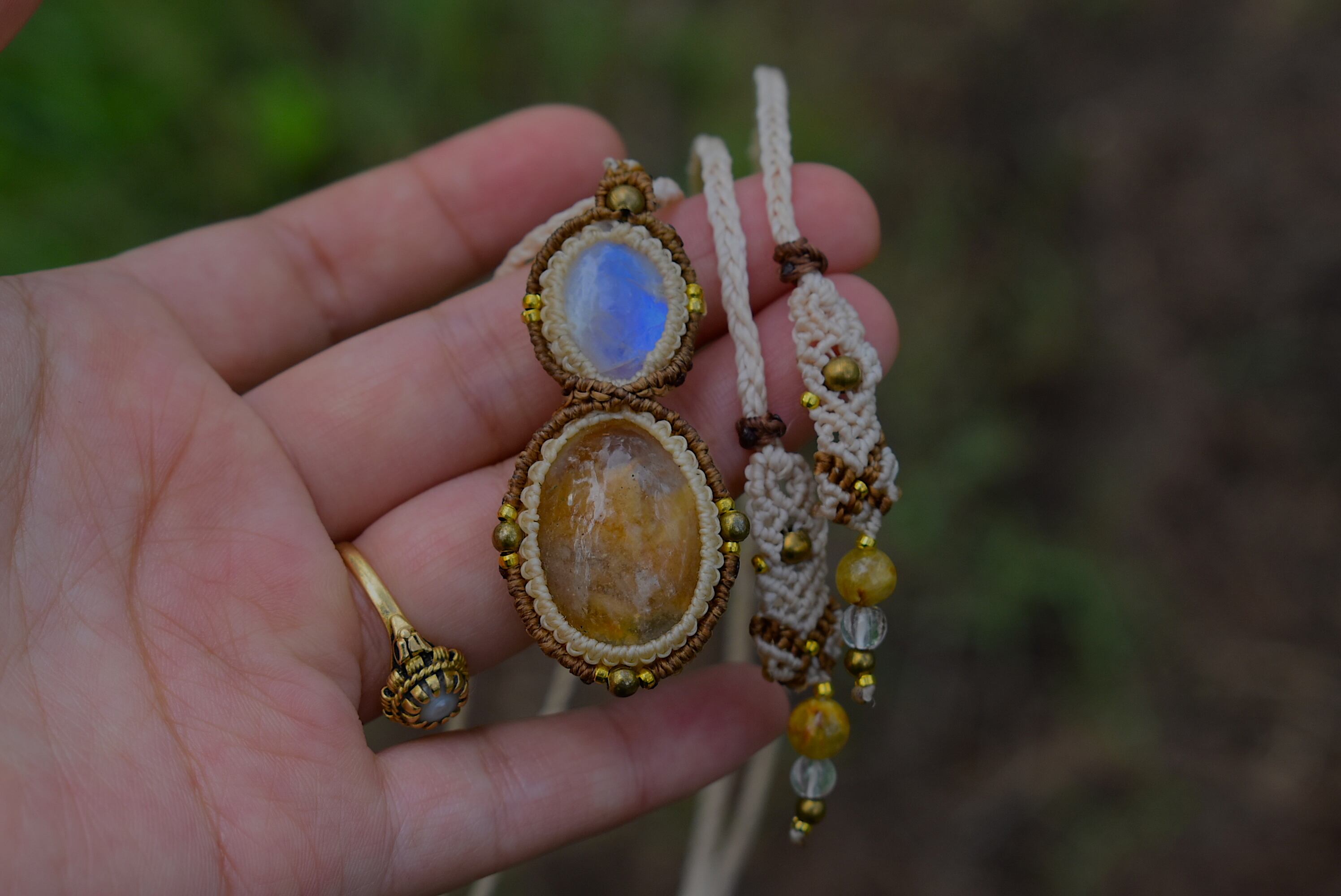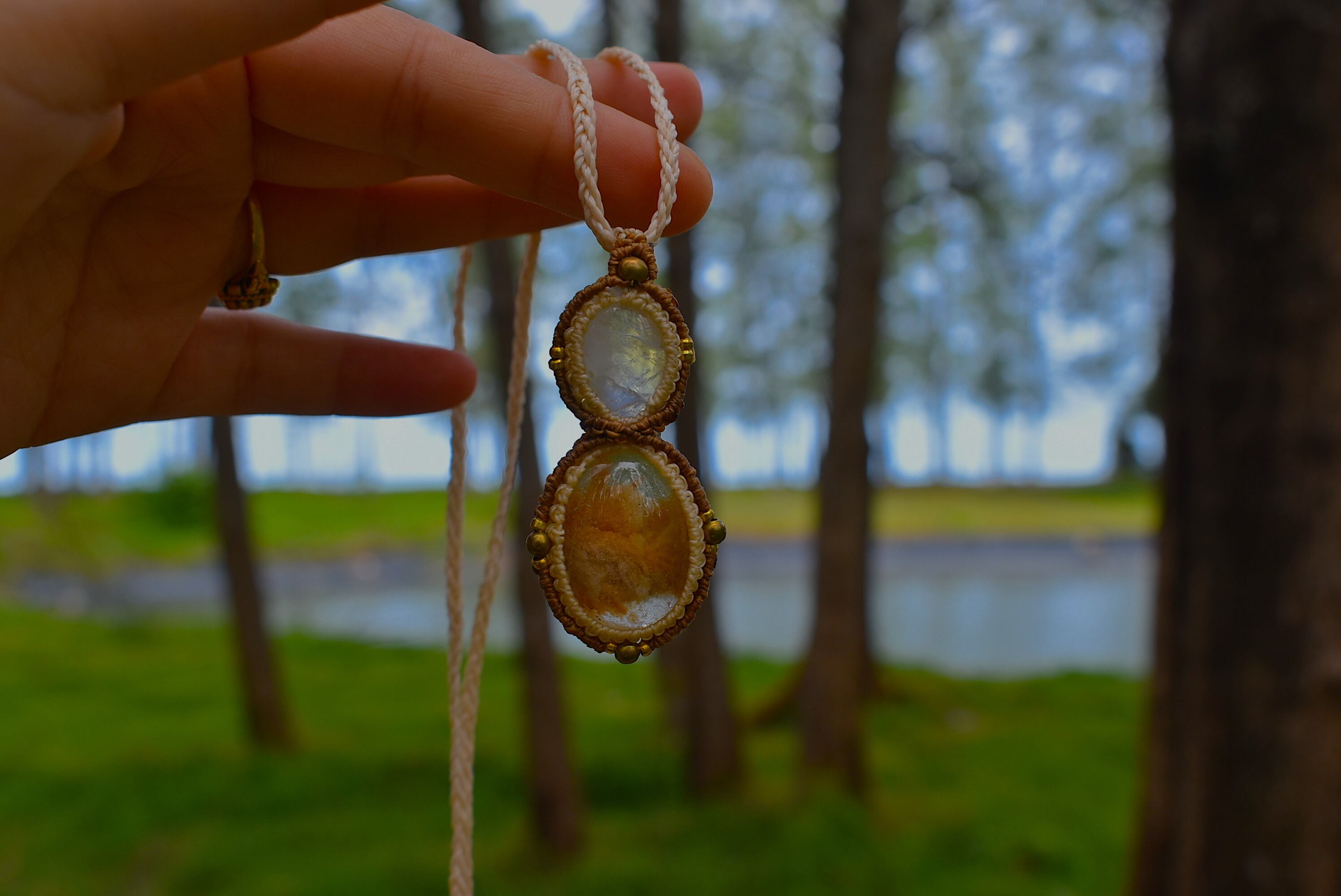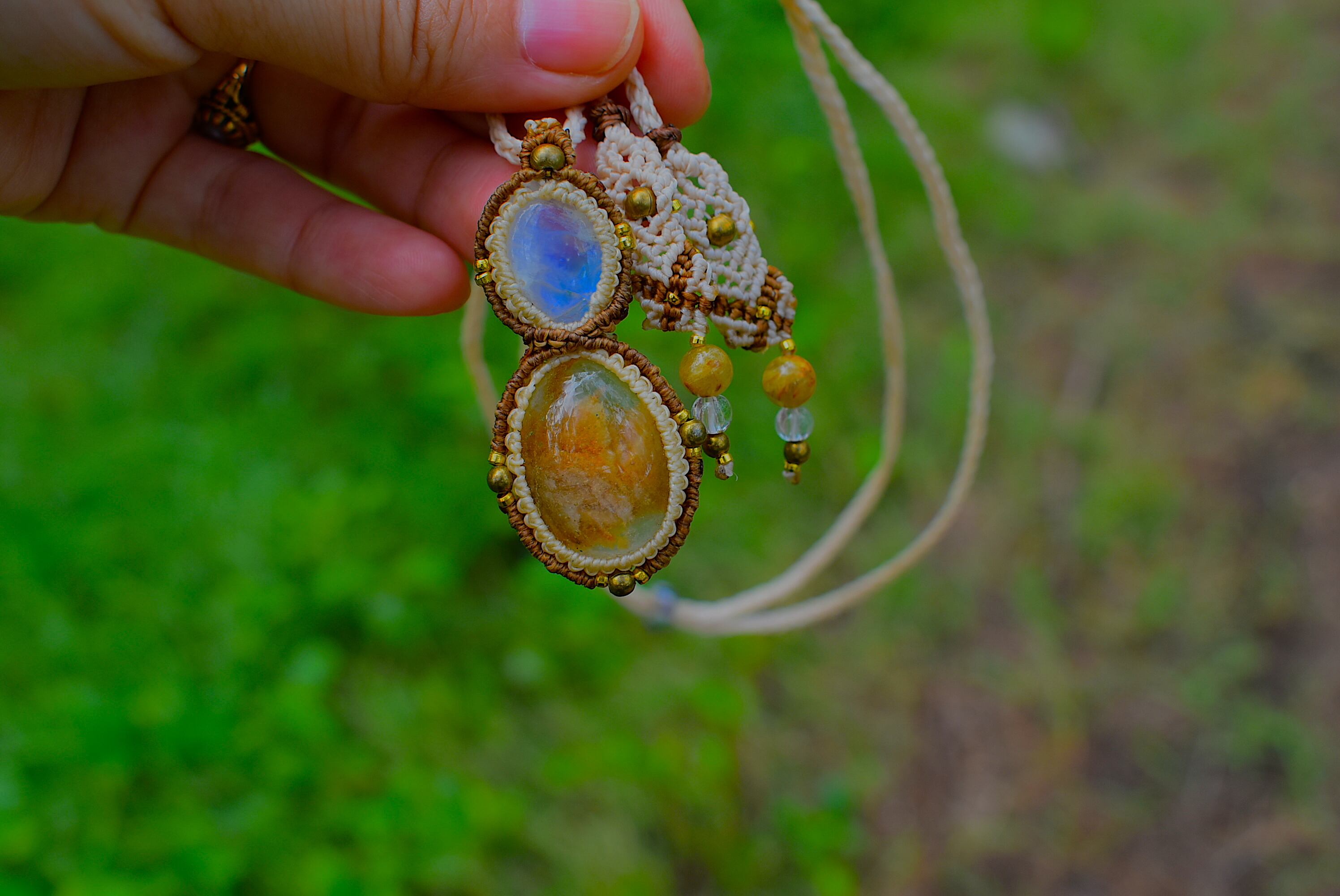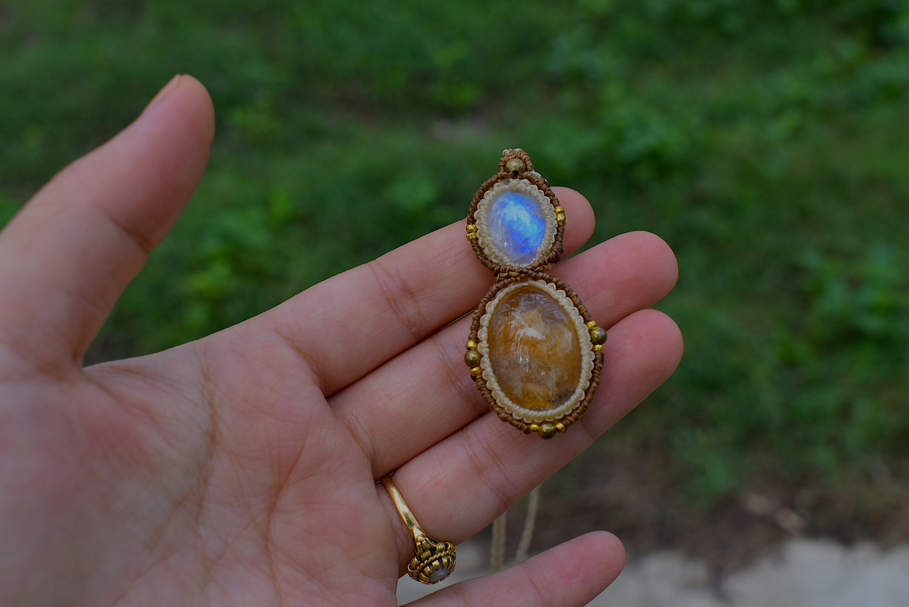 希少★ホワイトラブラトライト× 3Dグラフィック★ やわらかイエローガーデン水晶 マクラメペンダントgarm063
