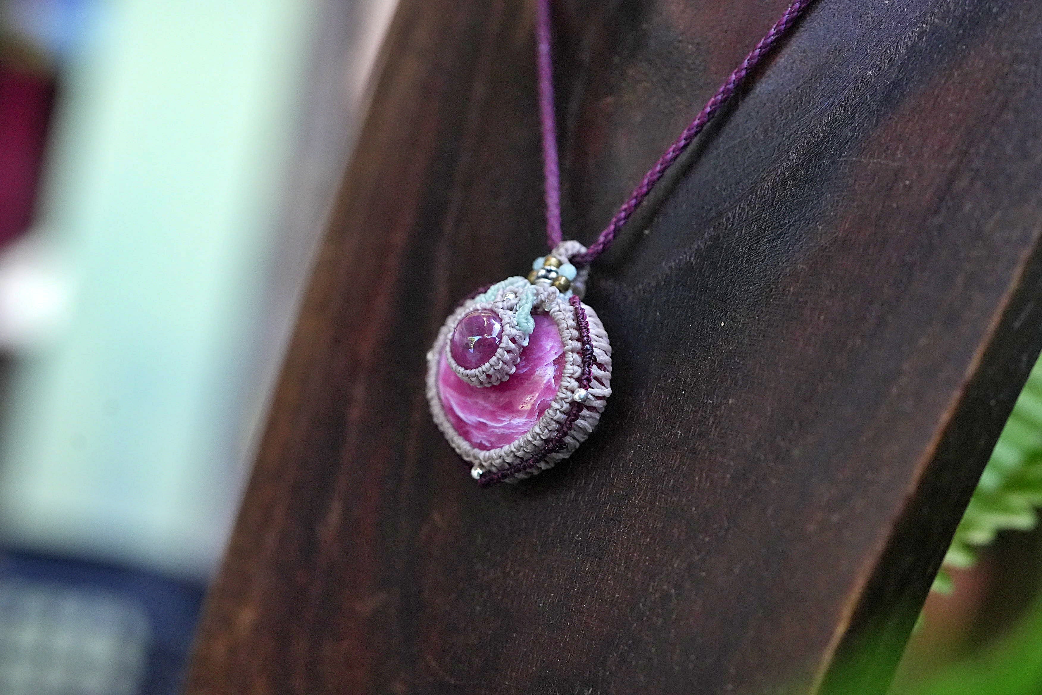 ◆このたびはヘンプ、ボルドー色の蝋引き糸を使用しマクラメ編み装飾を施しました。