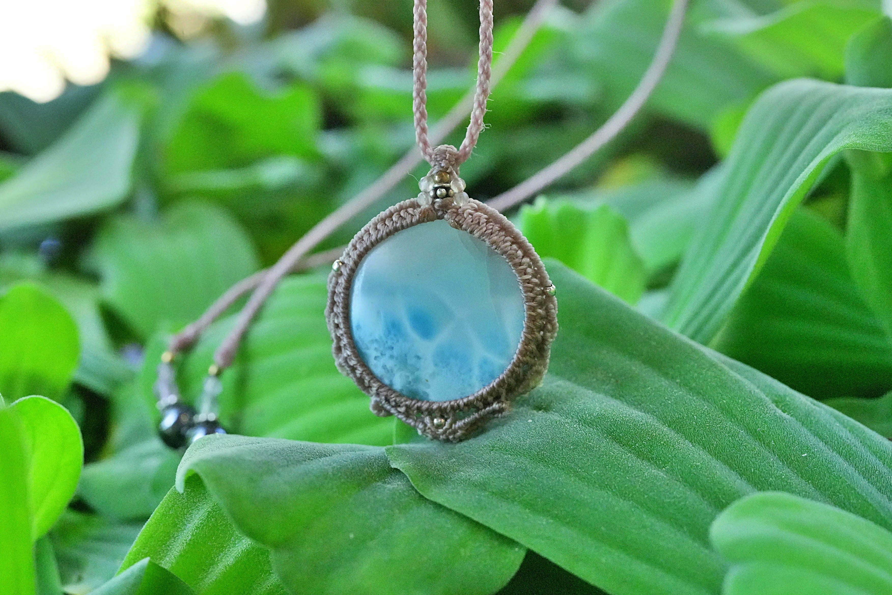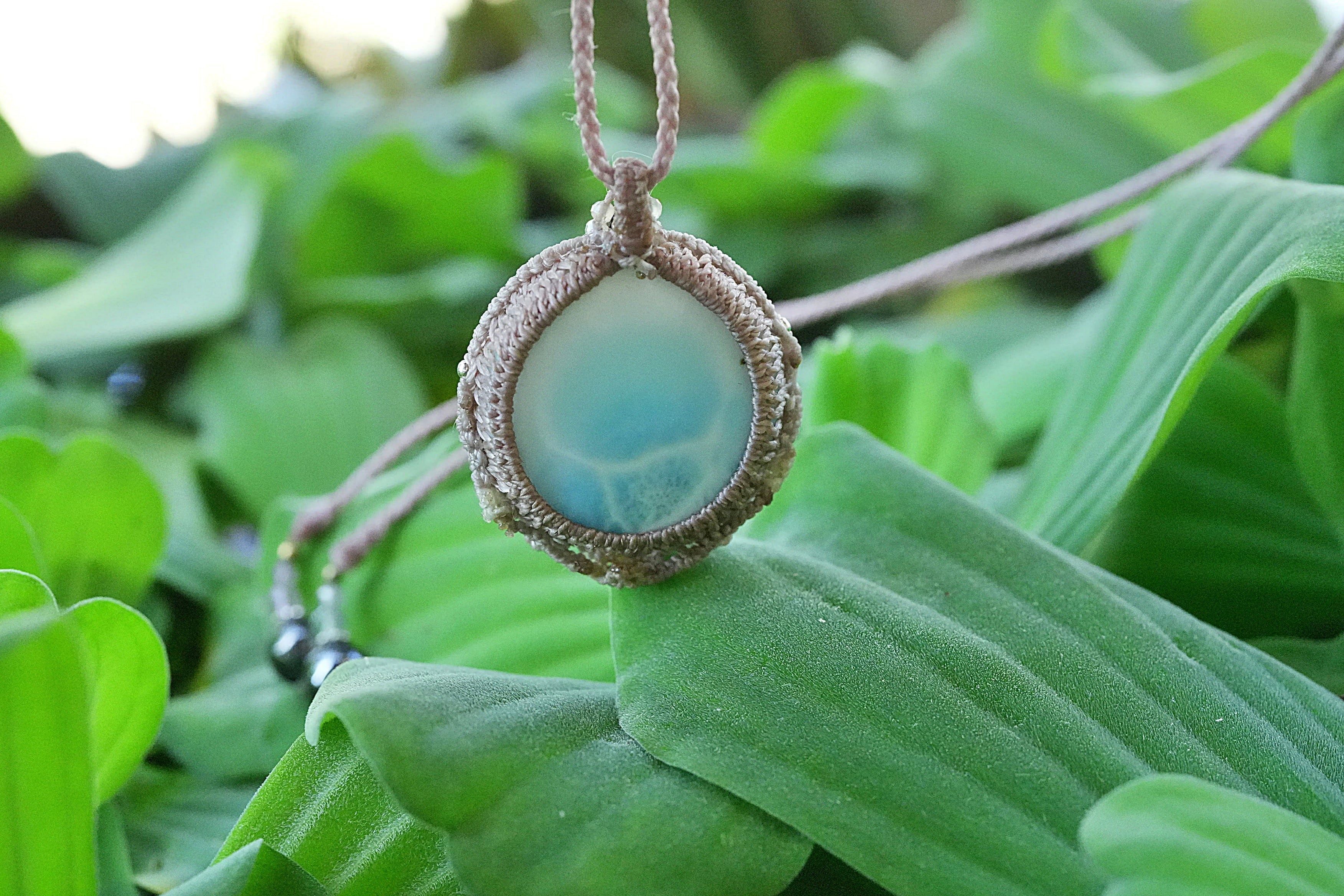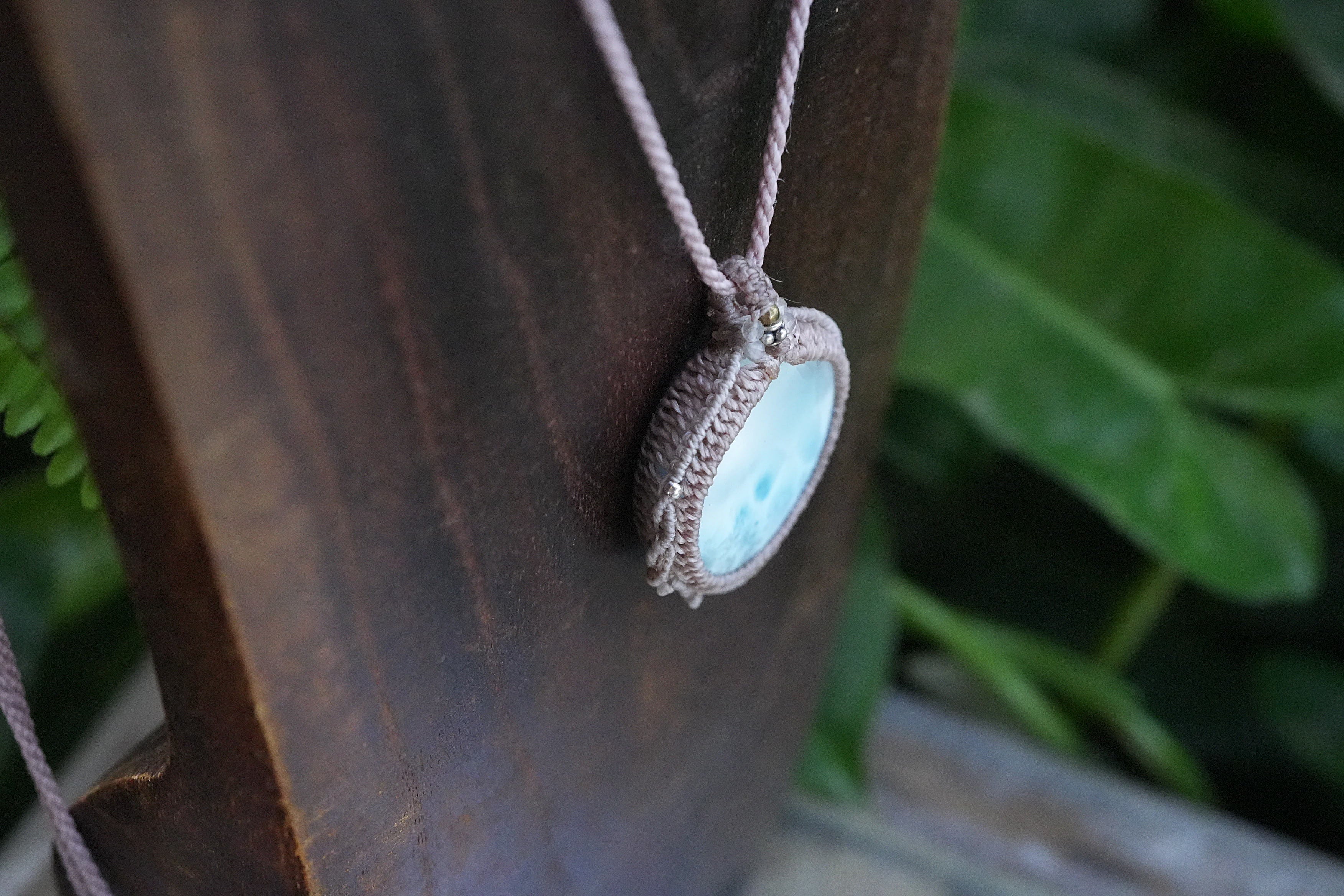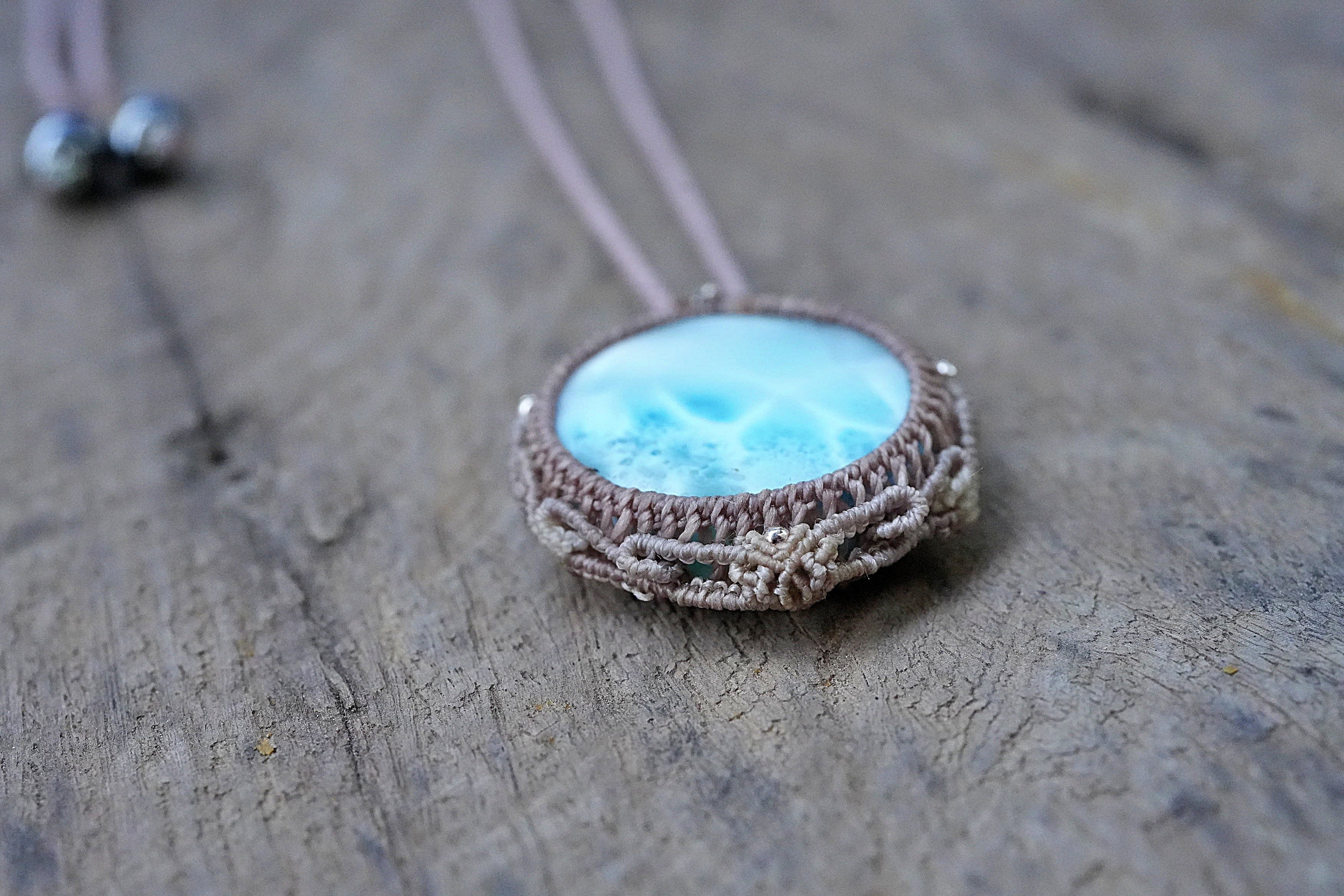 ◆このたびはカフェオレ、ヘンプ、キナリ色の蝋引き糸を使用しマクラメ編み装飾を施しました。