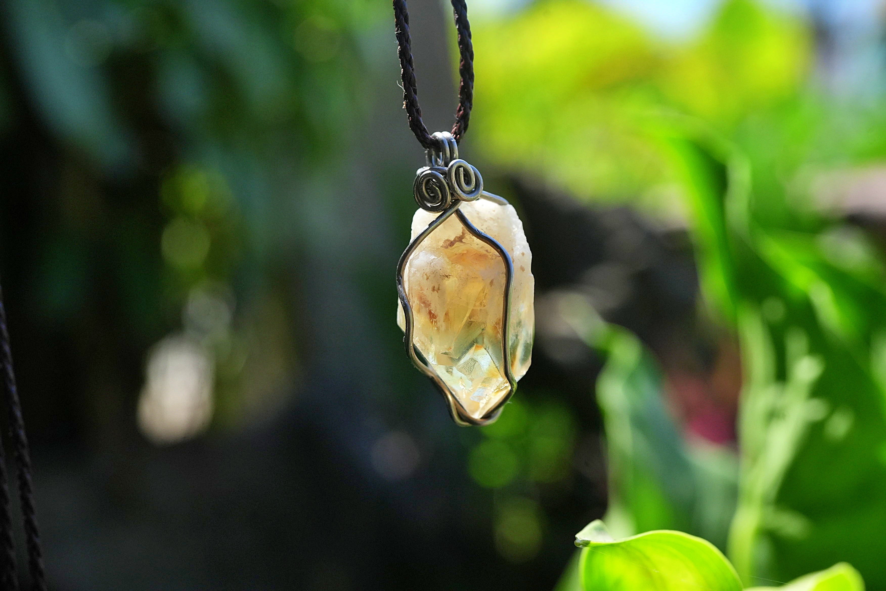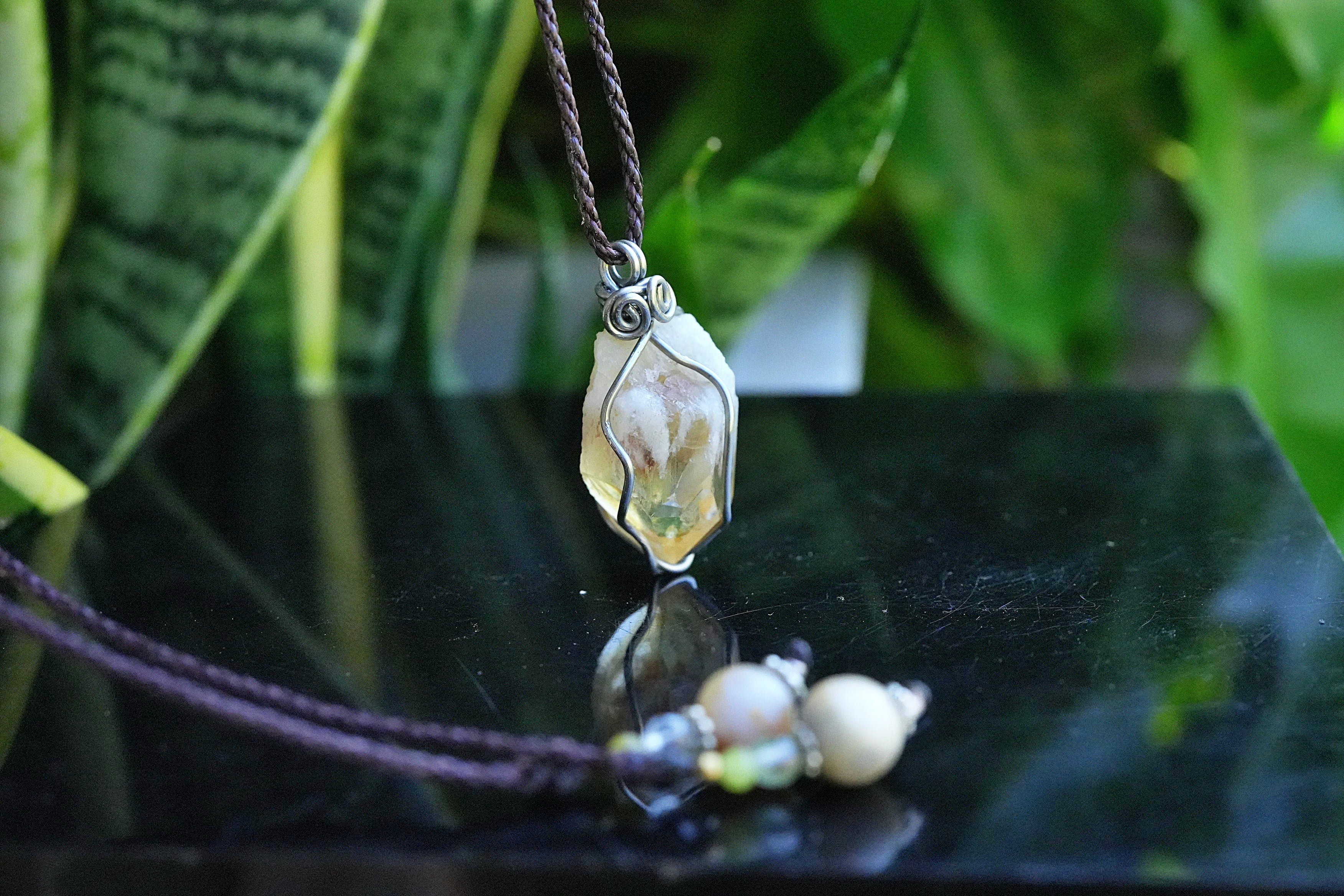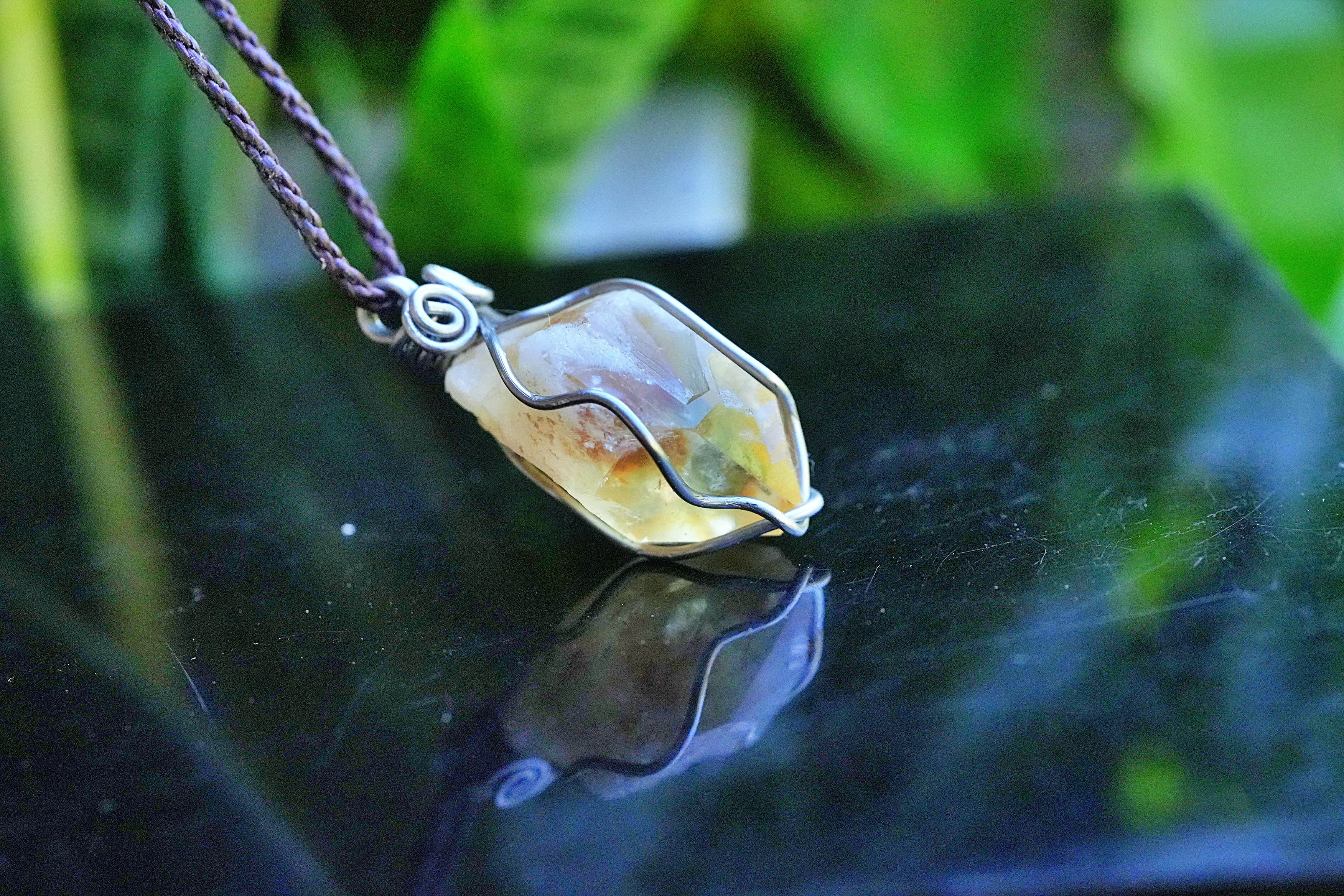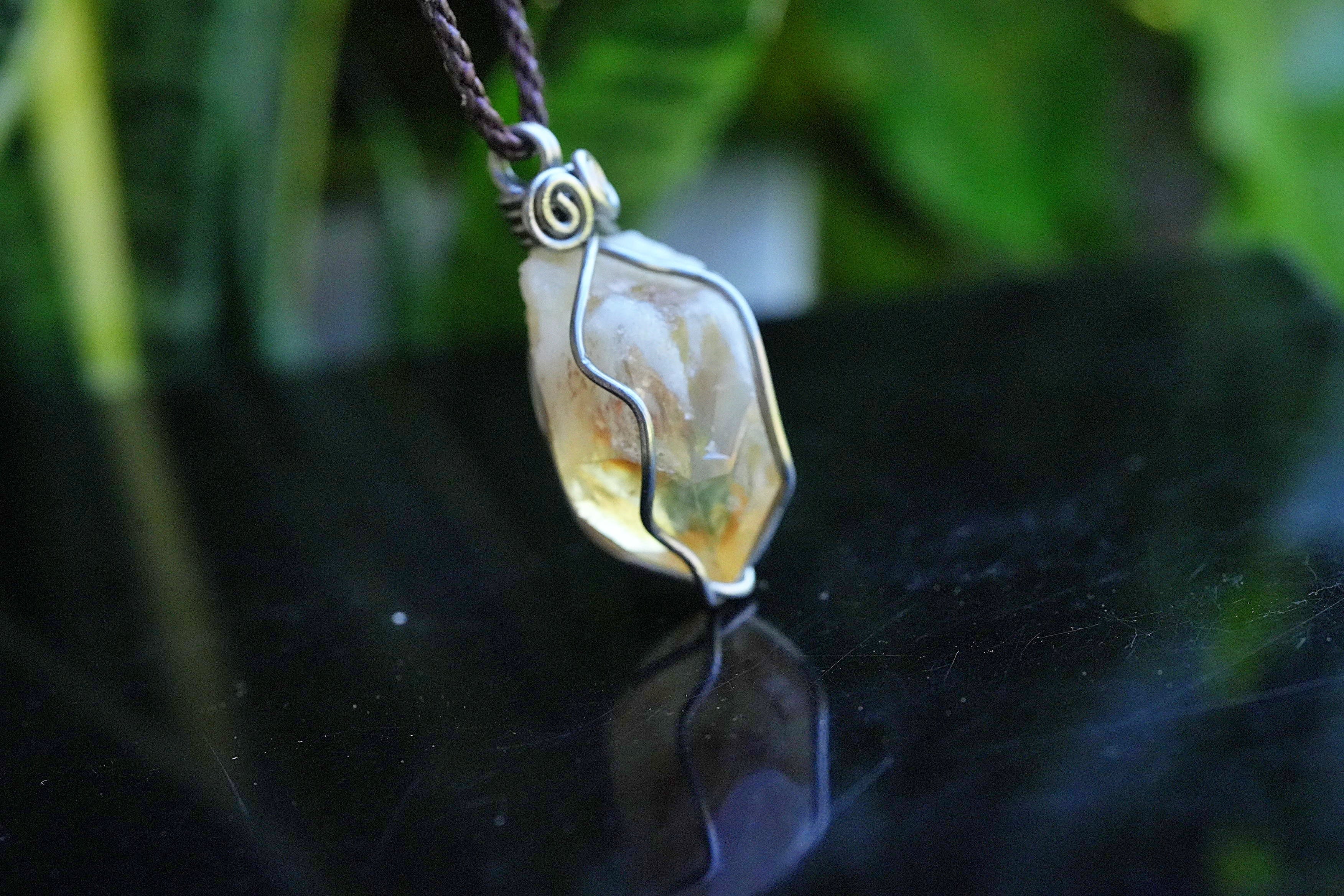 天然石シトリン原石を使用し、ワイヤーワークを施してペンダントトップに仕上げました。