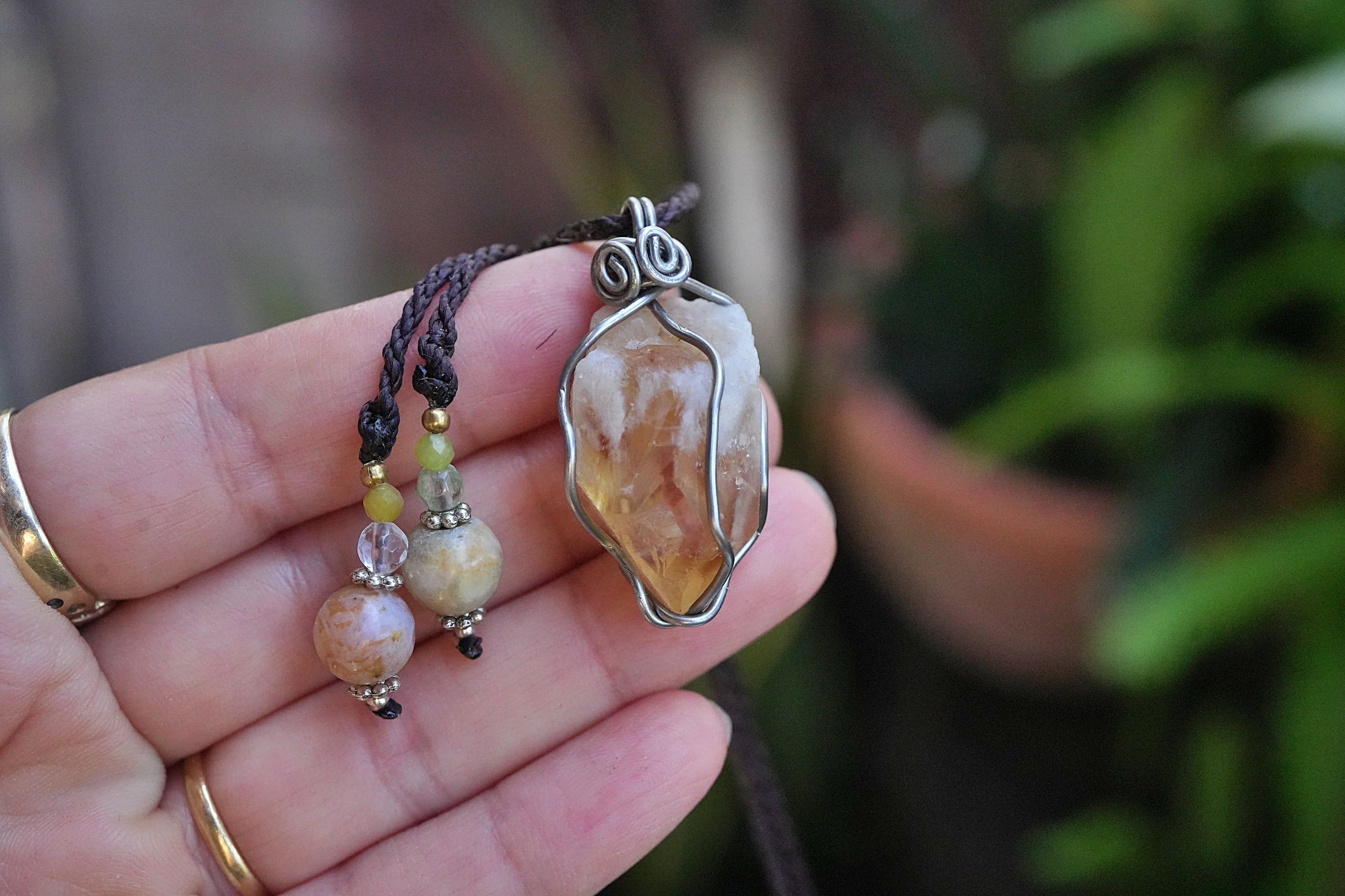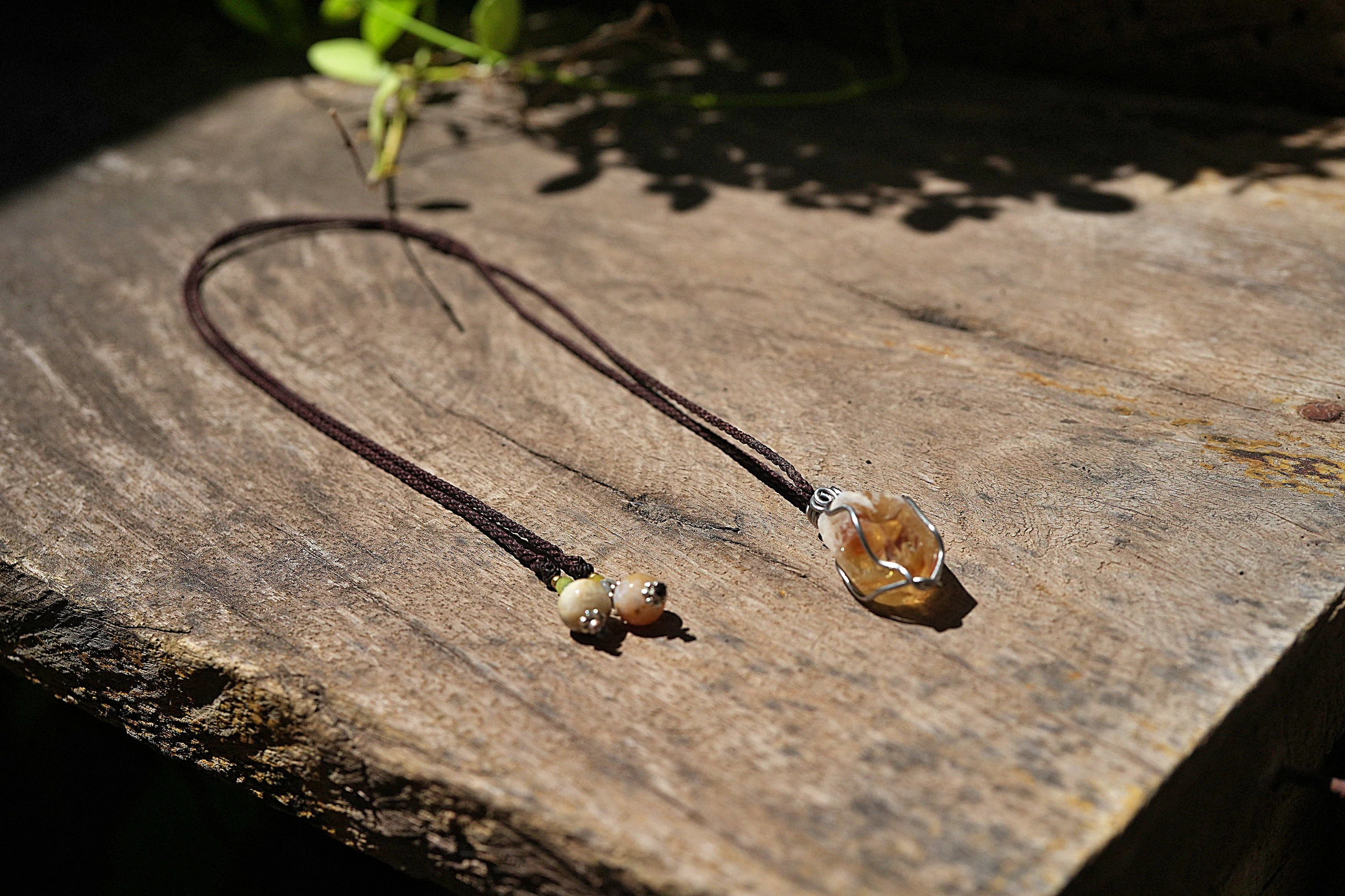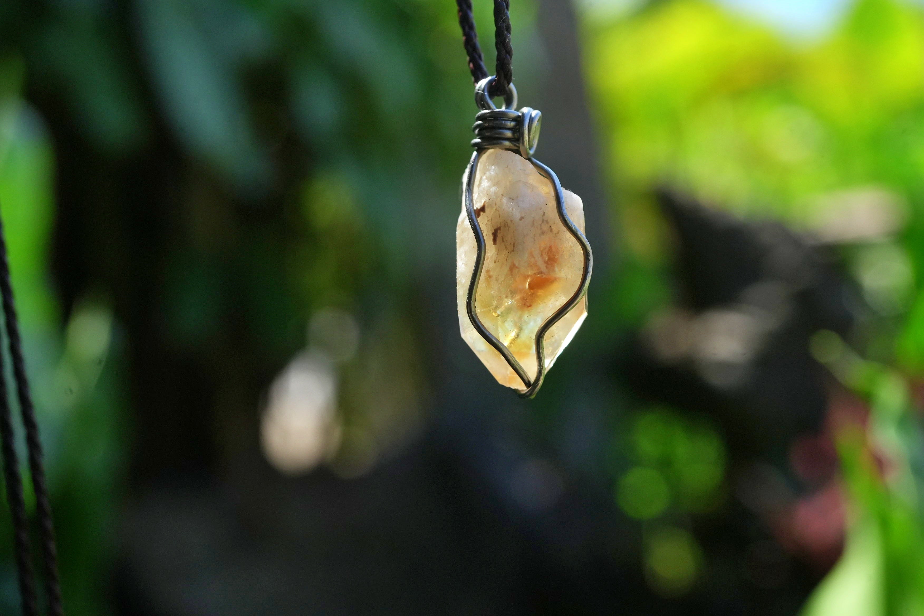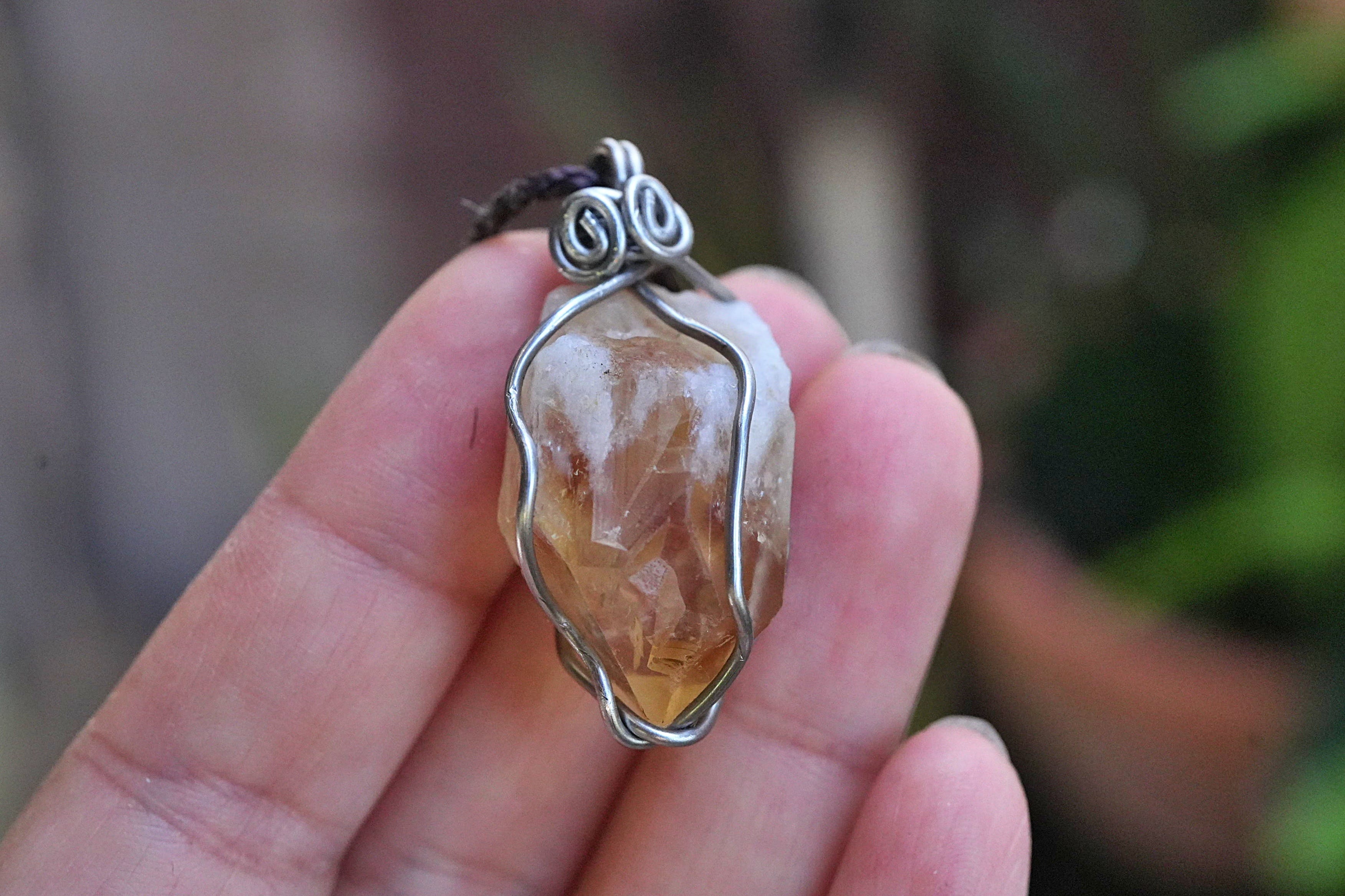 天然石シトリン原石を使用し、ワイヤーワークを施してペンダントトップに仕上げました。