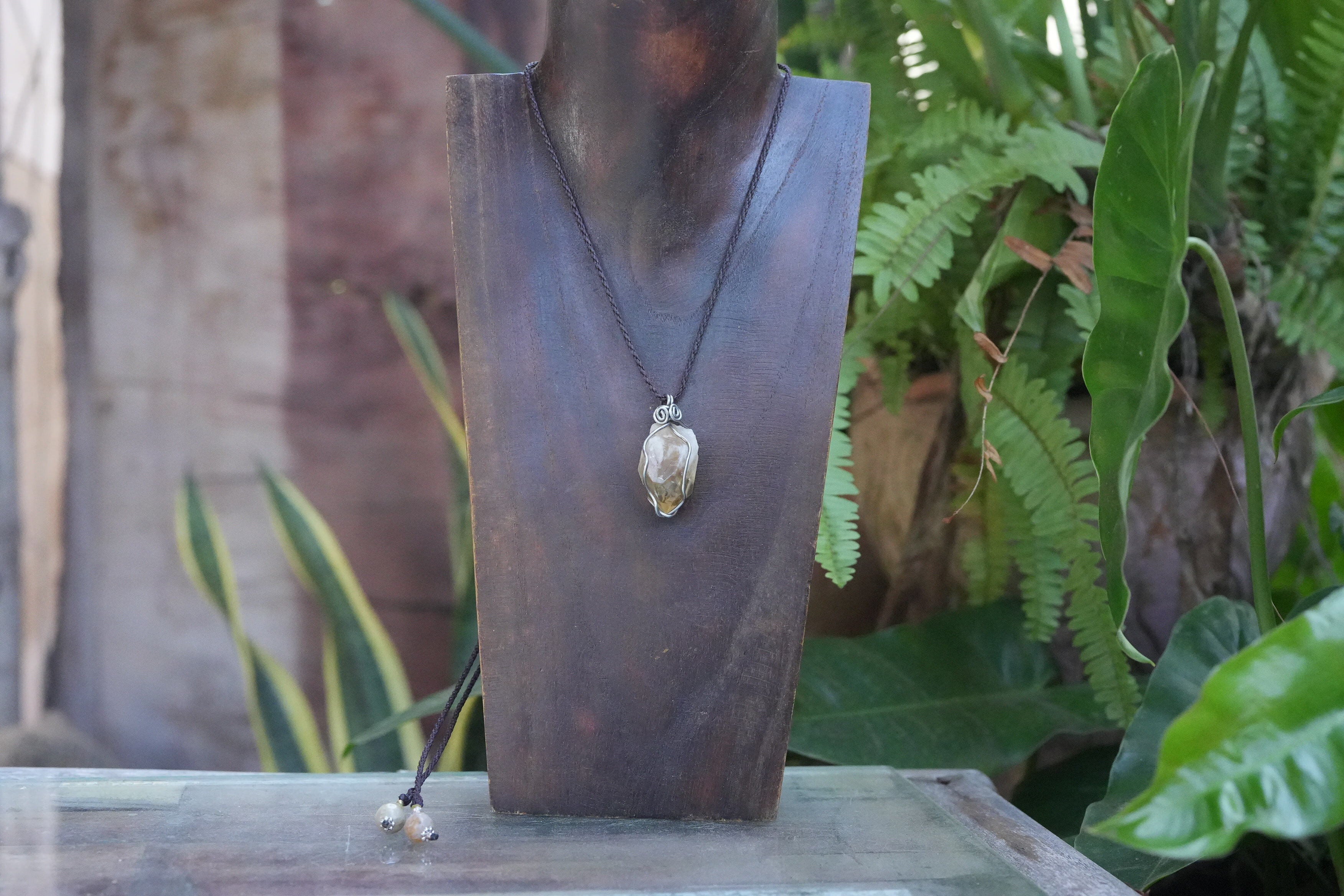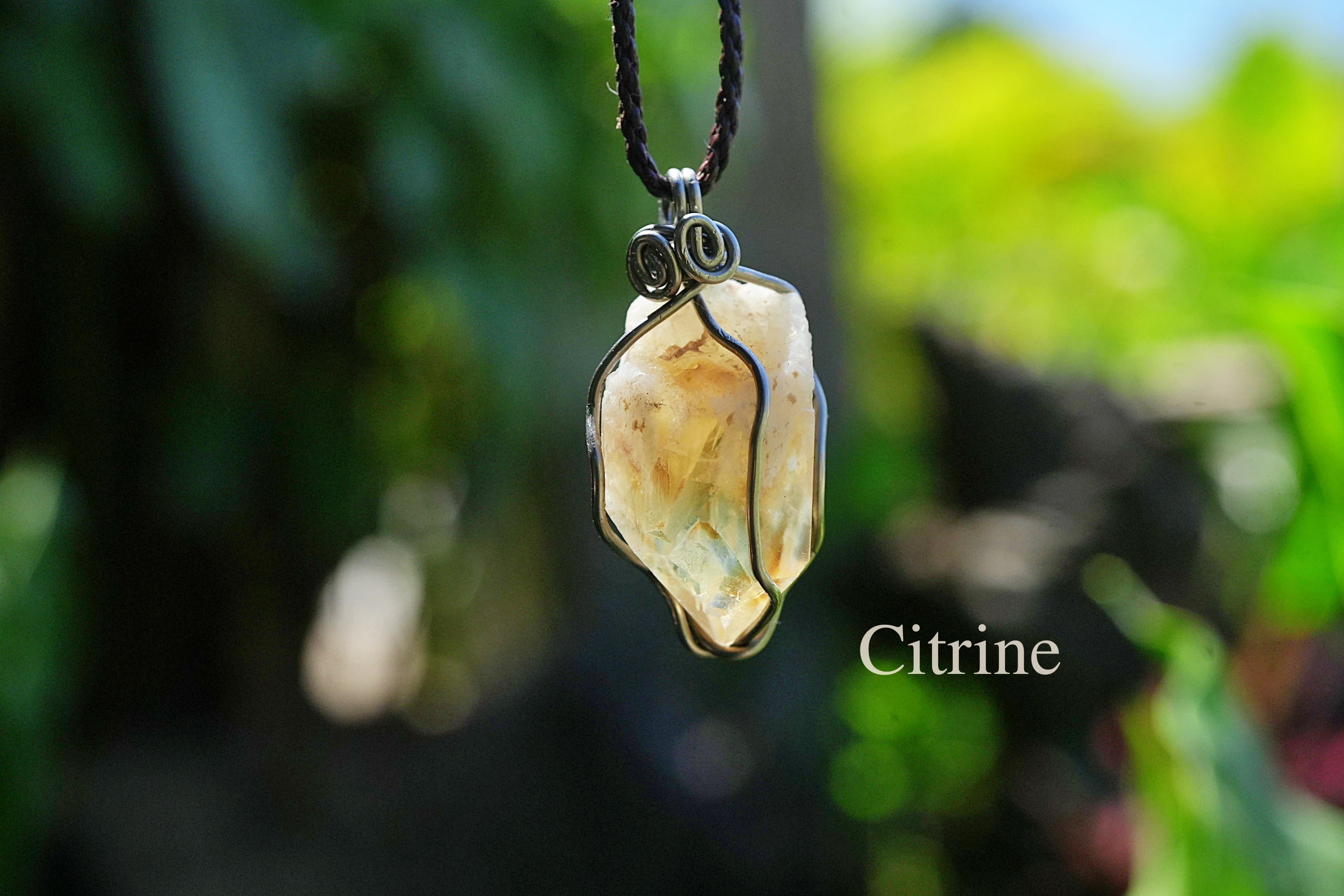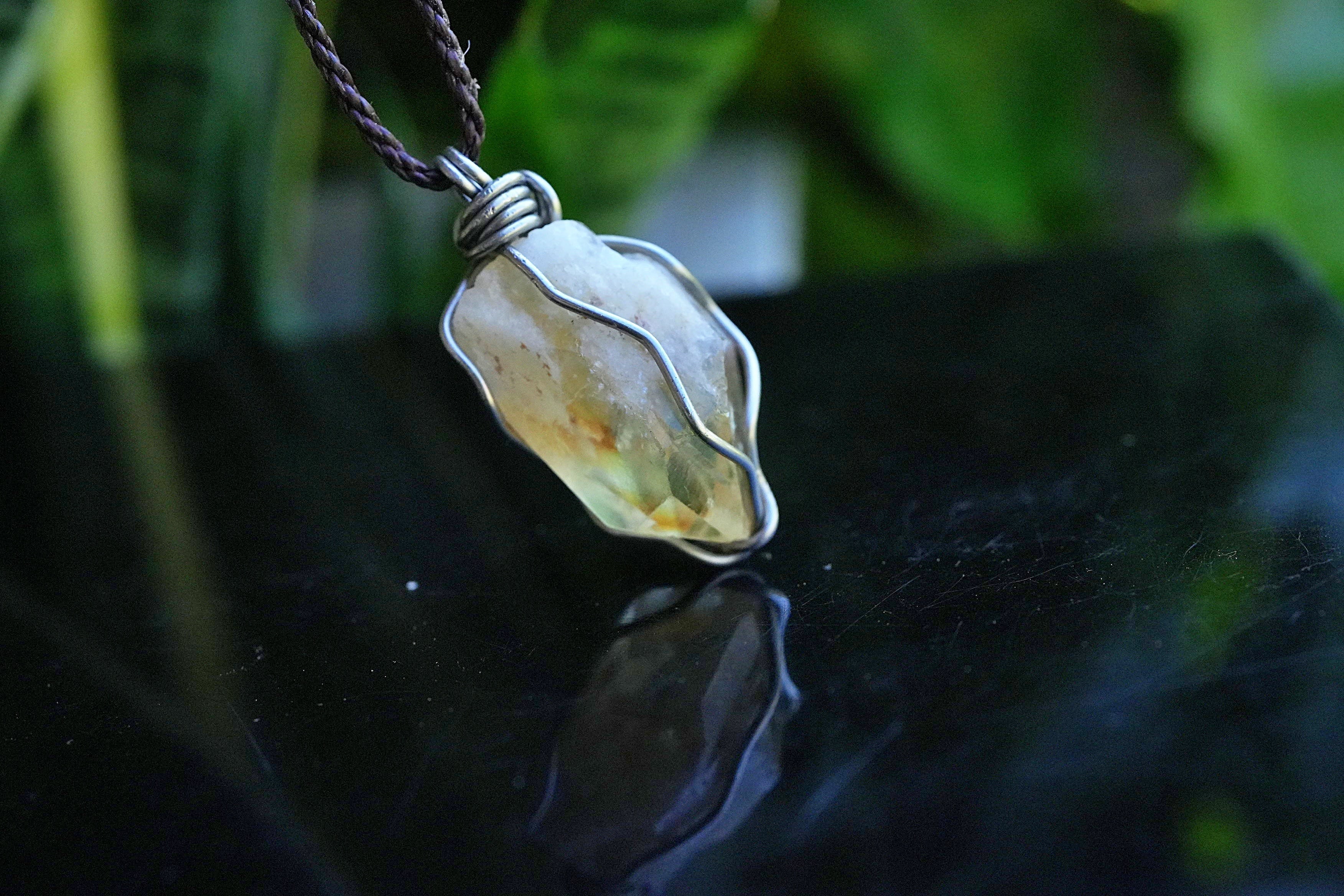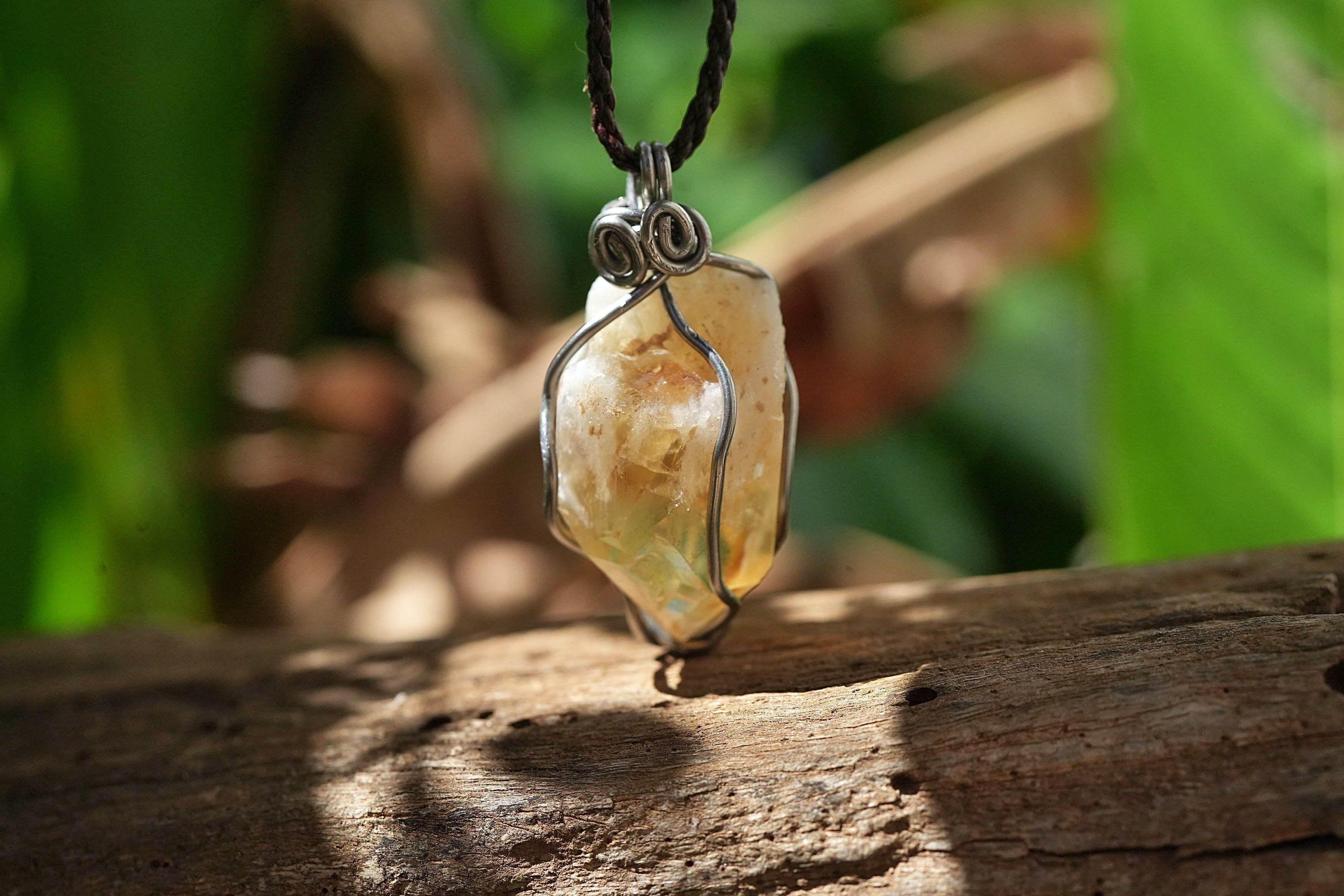 天然石シトリン原石を使用し、ワイヤーワークを施してペンダントトップに仕上げました。