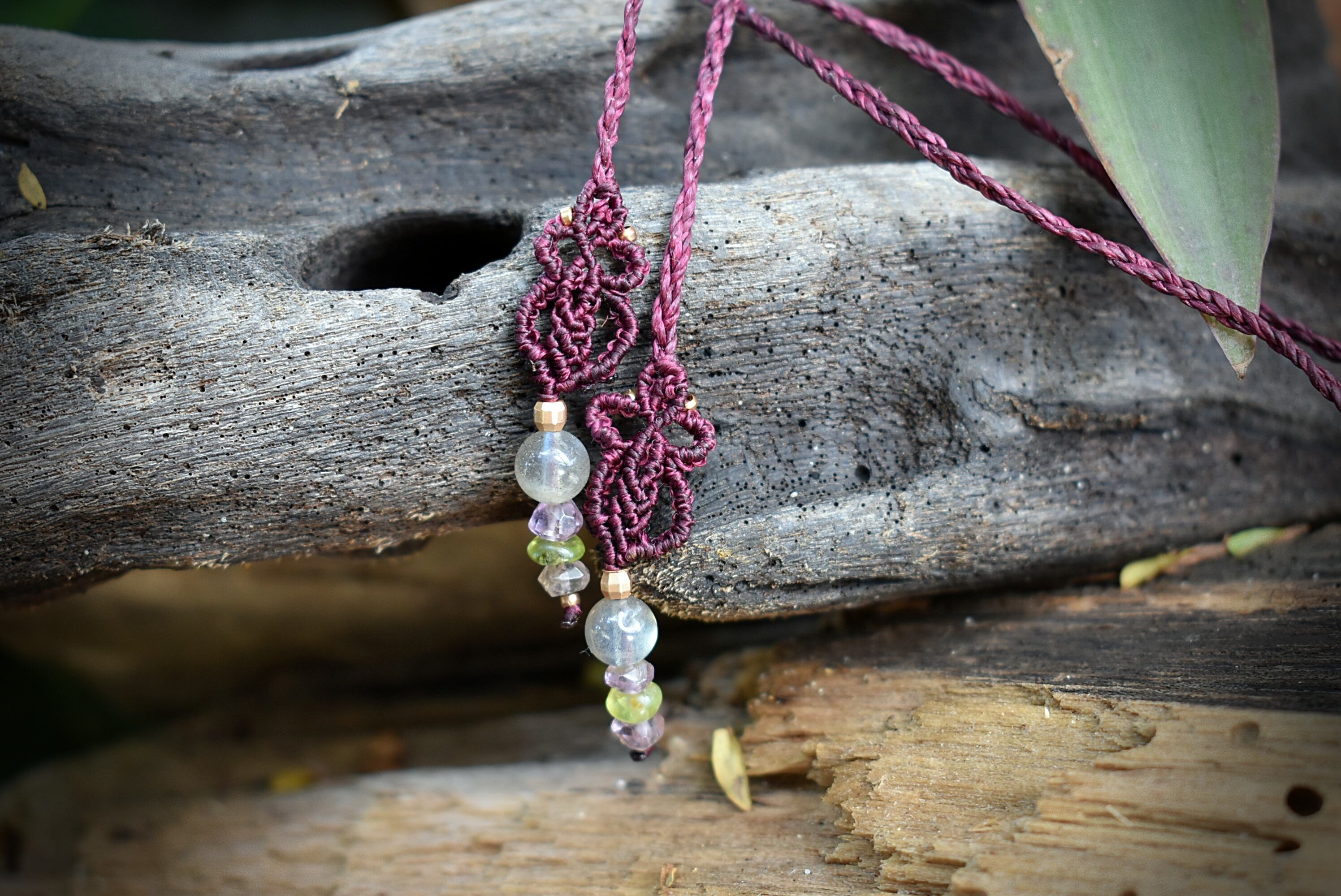 ◆このたびはボルドー色の蝋引き糸を使用しマクラメ編み装飾を施しました。