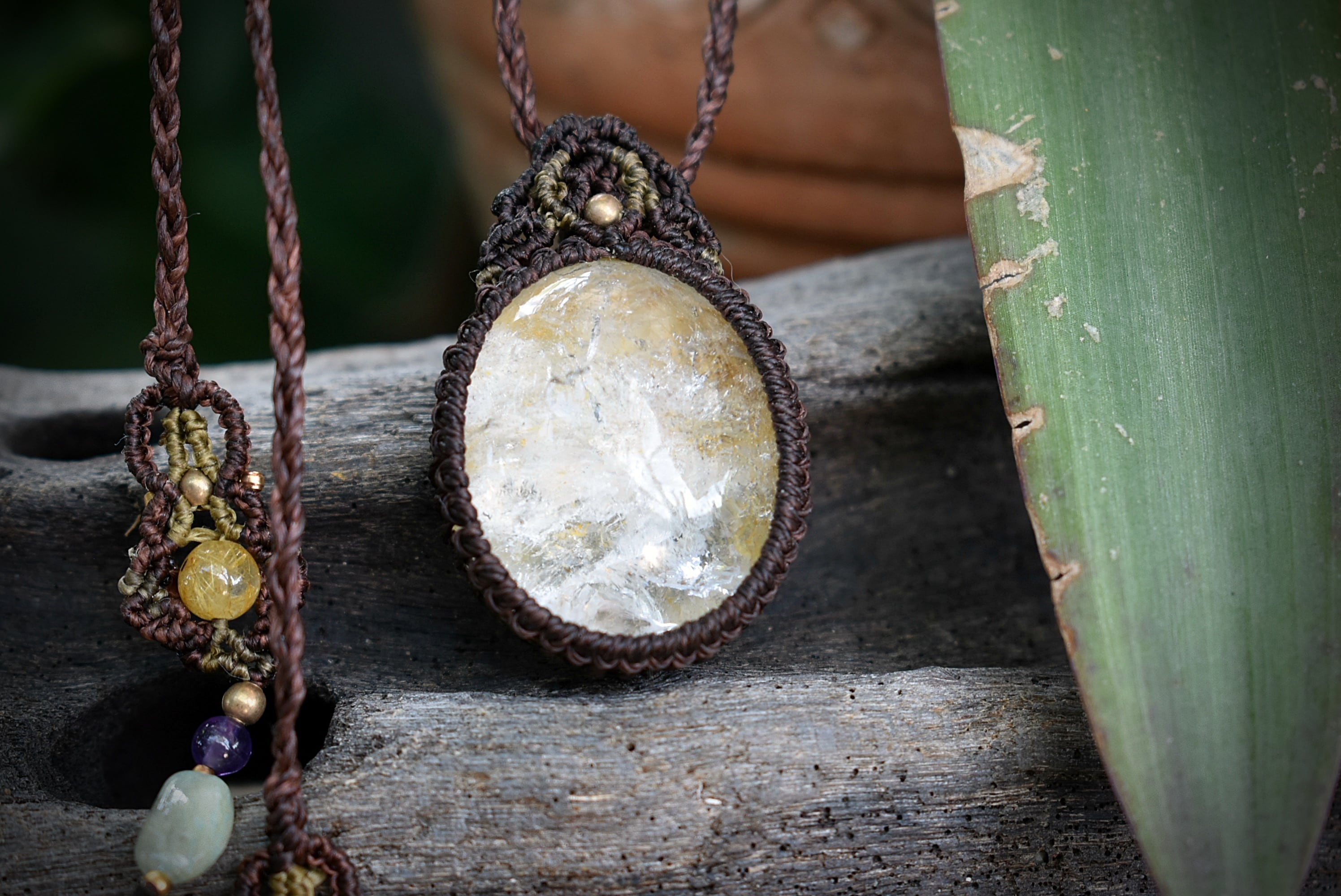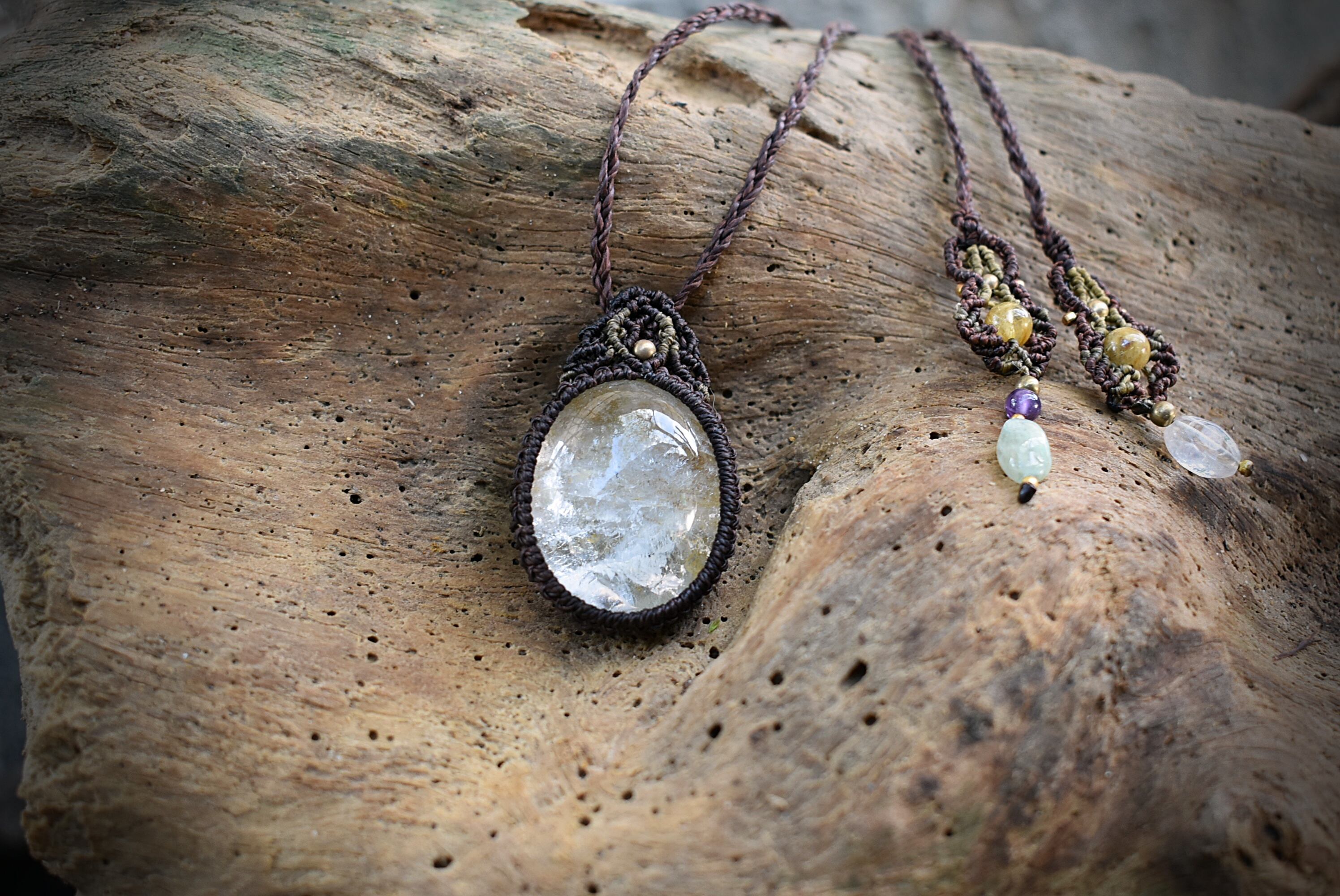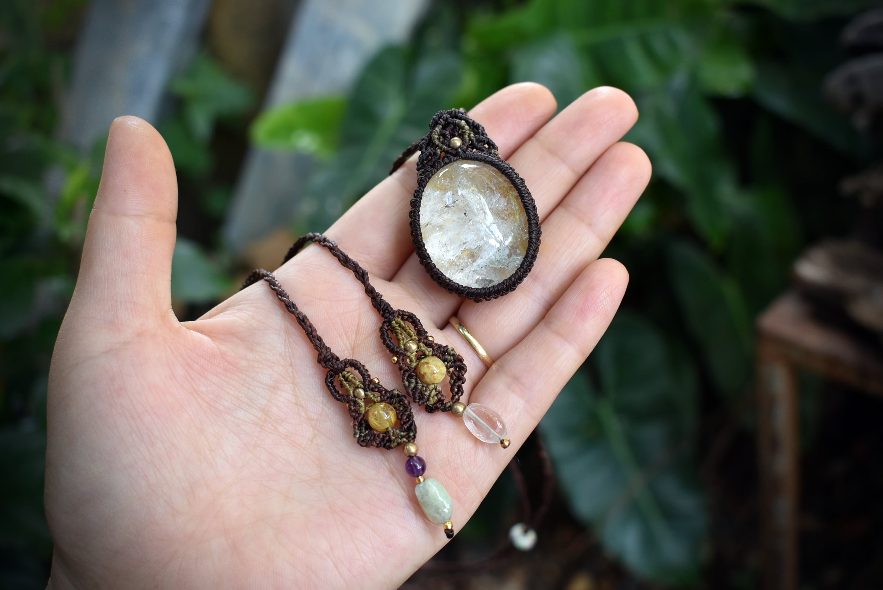 透明感ある水晶の中にニョキニョキと立体的な石の層が生えているかのような白色のめずらしいガーデンクォーツのひとつ、貫入り水晶をマクラメ編み装飾を施しペンダントに仕上げました。