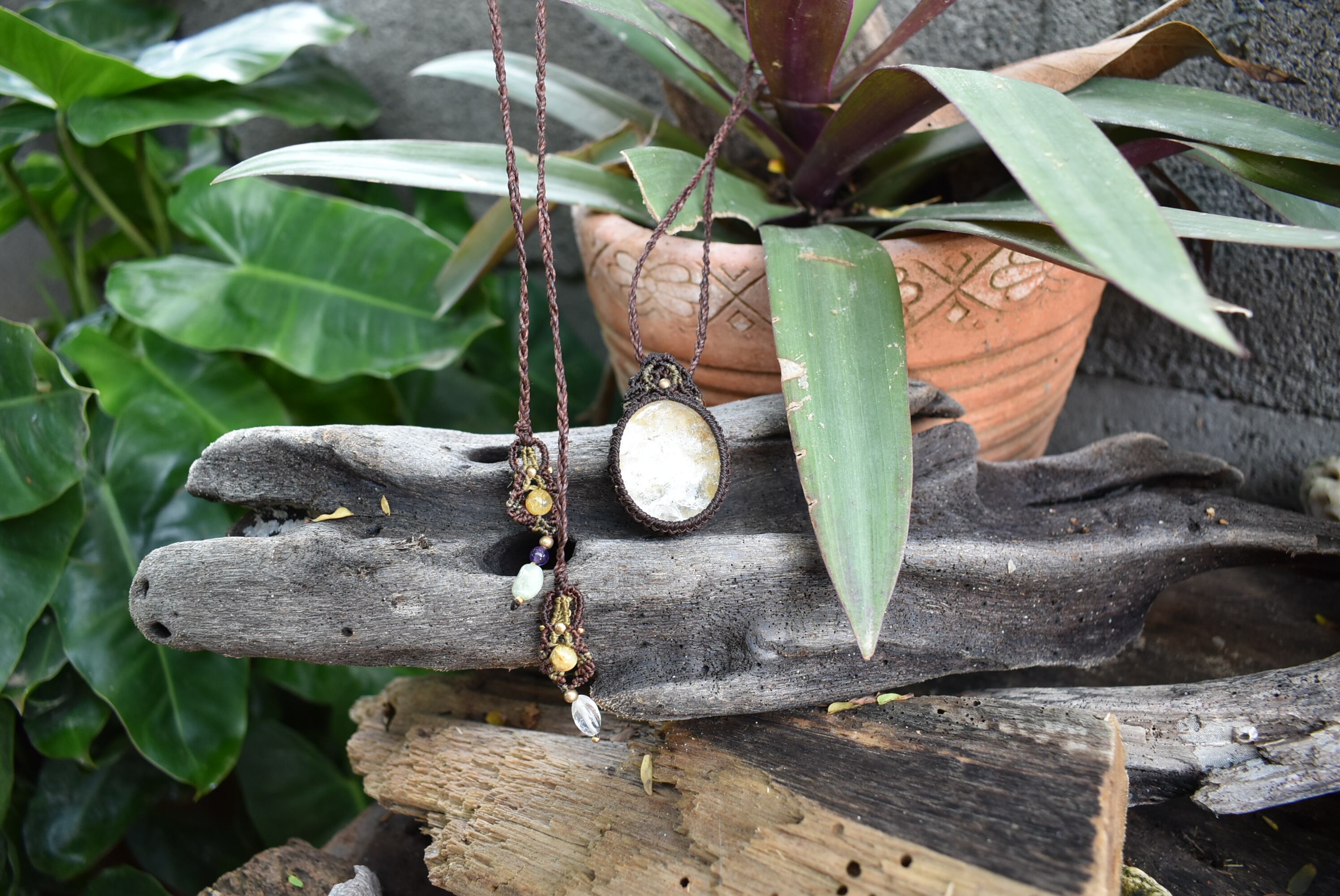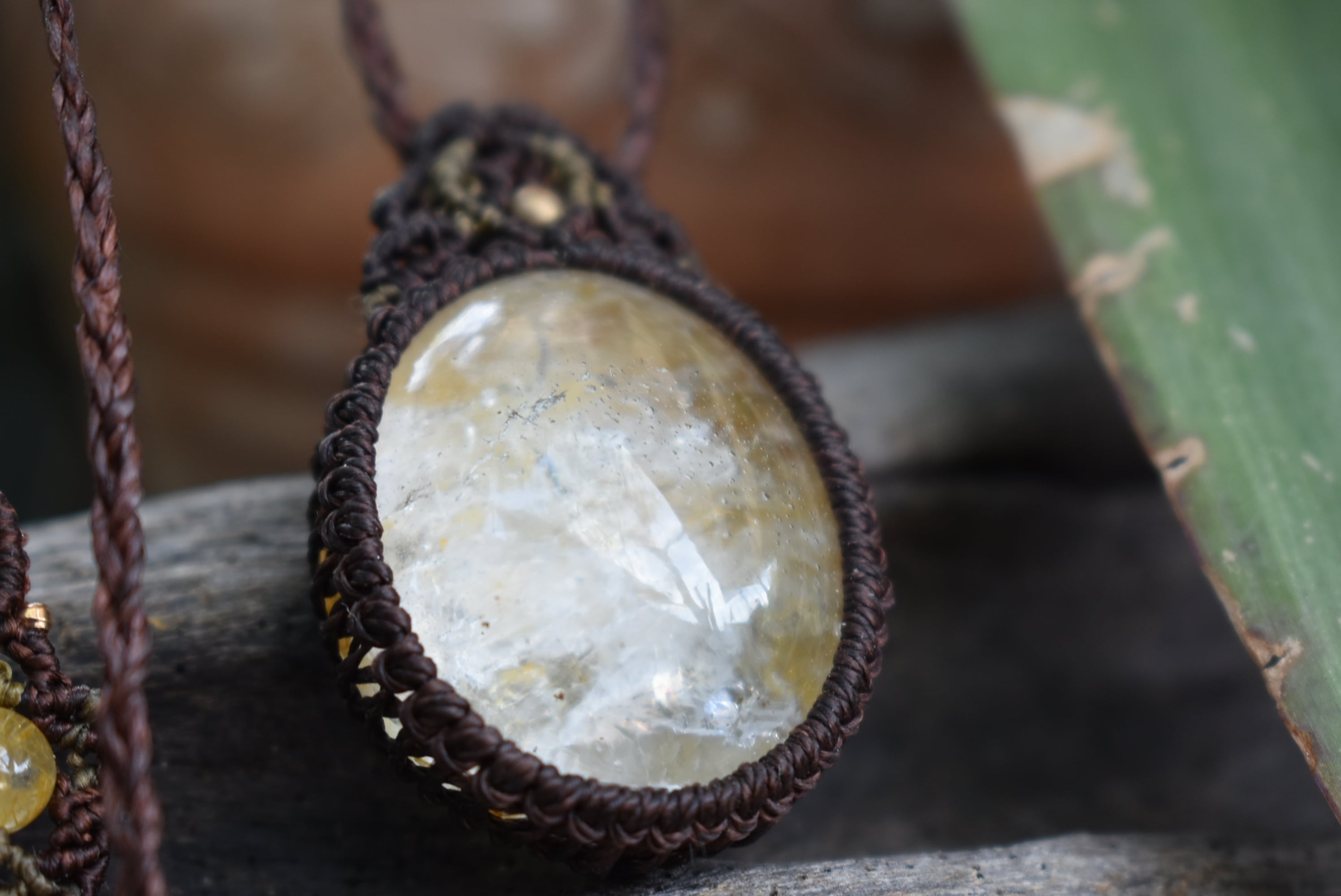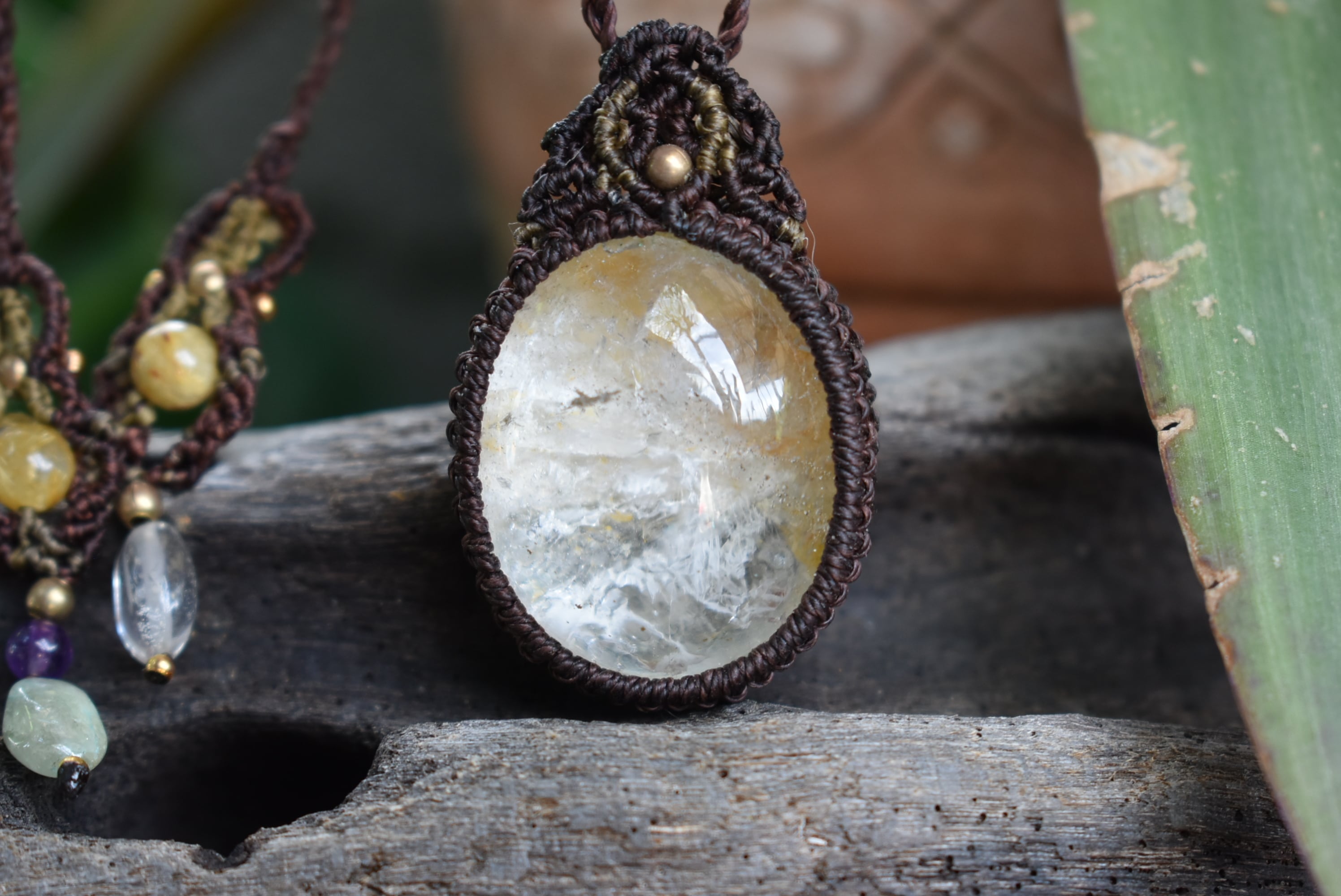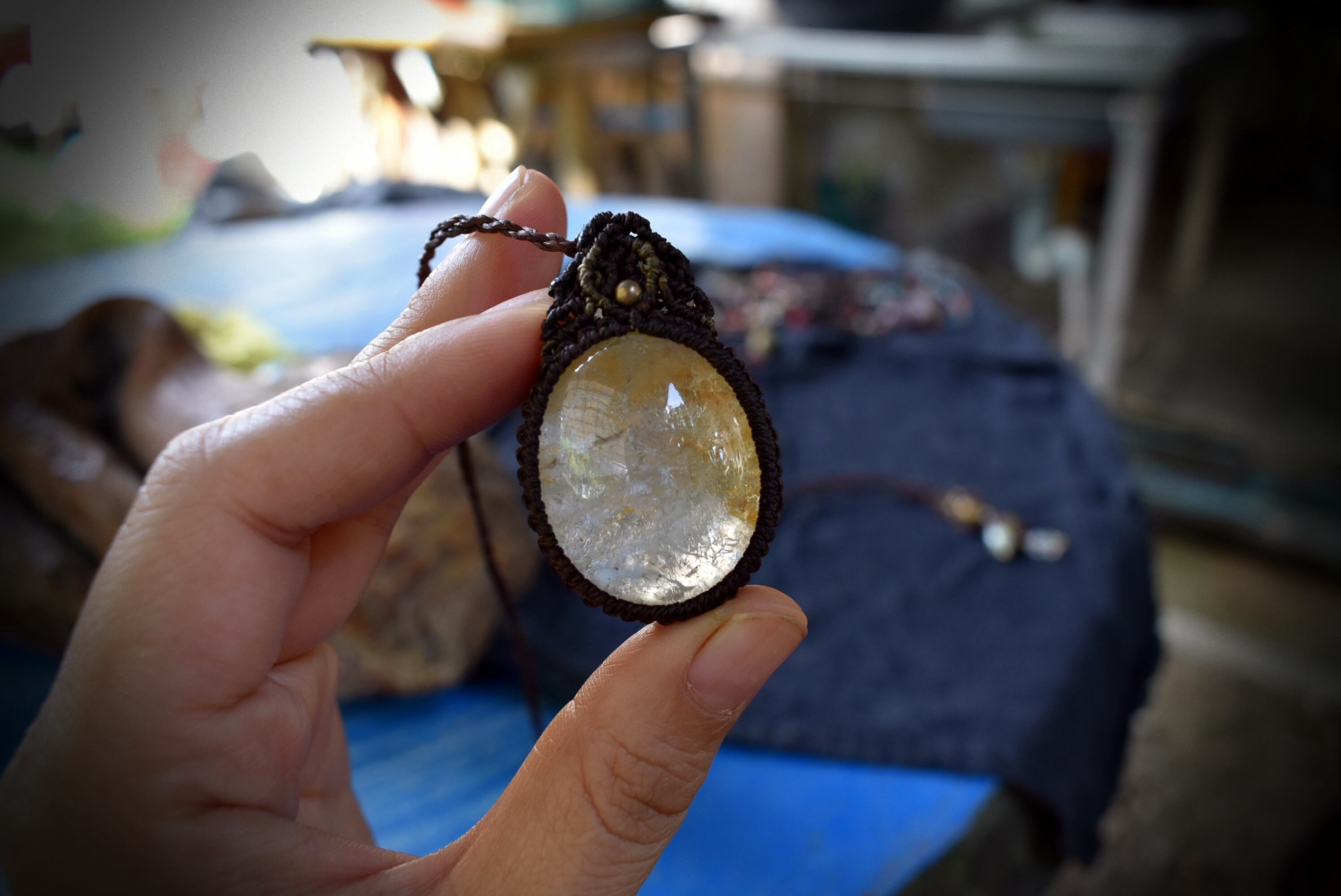 透明感ある水晶の中にニョキニョキと立体的な石の層が生えているかのような白色のめずらしいガーデンクォーツのひとつ、貫入り水晶をマクラメ編み装飾を施しペンダントに仕上げました。