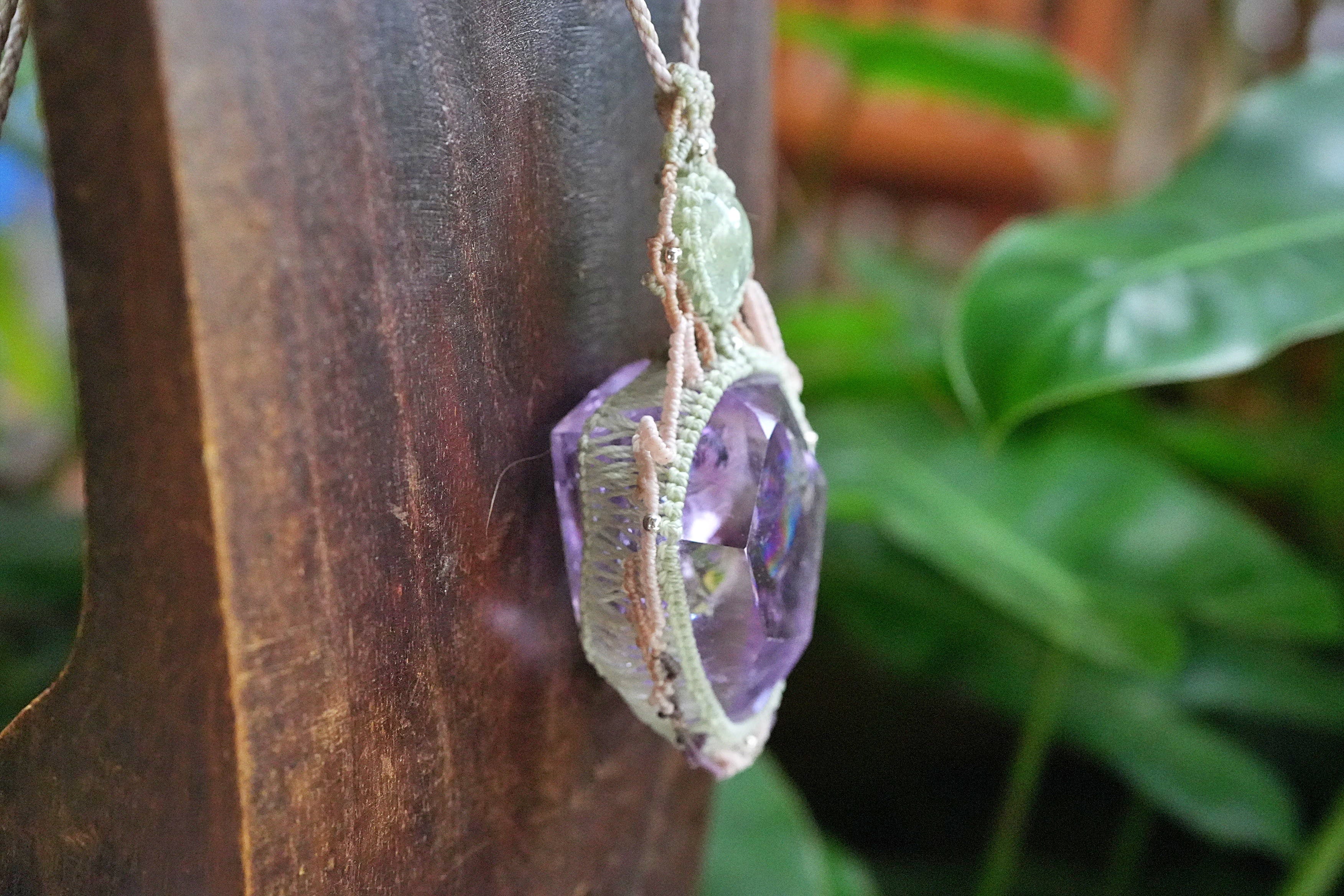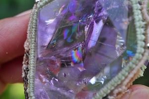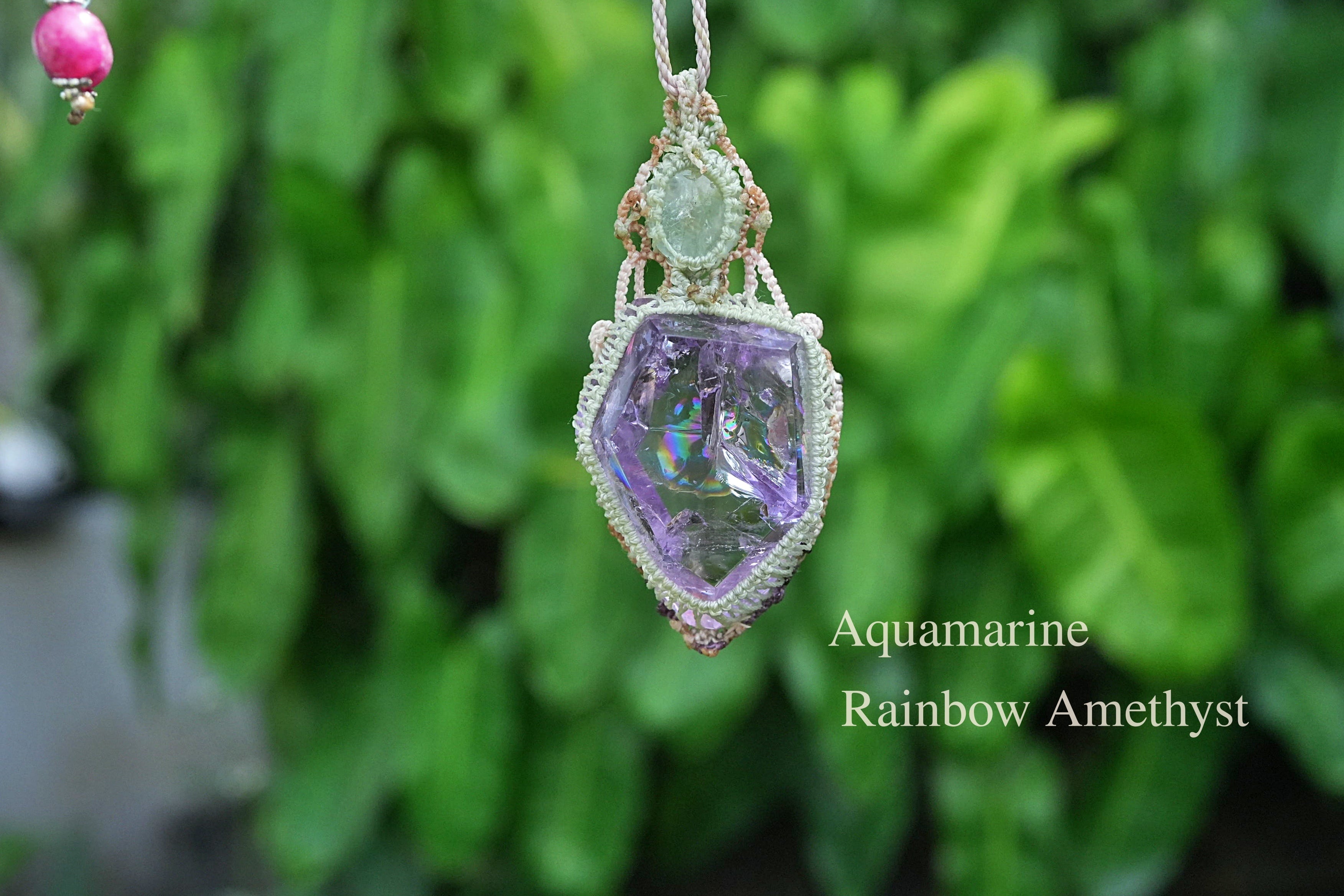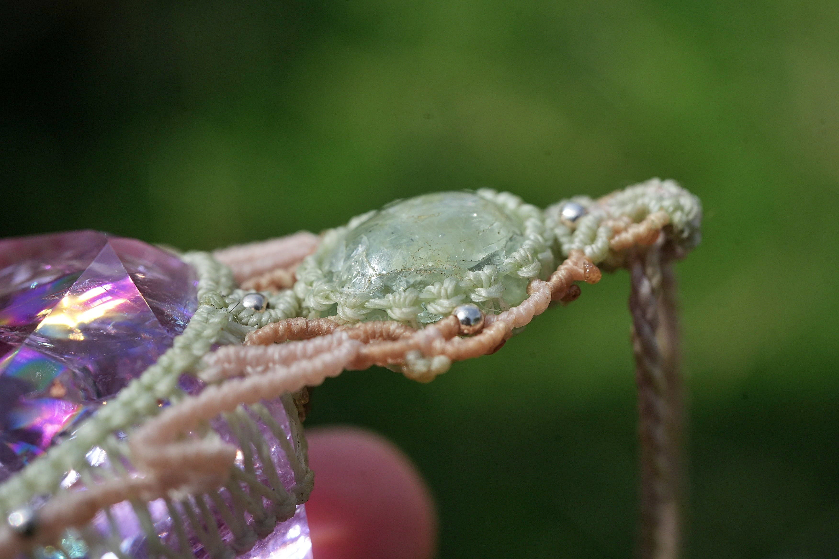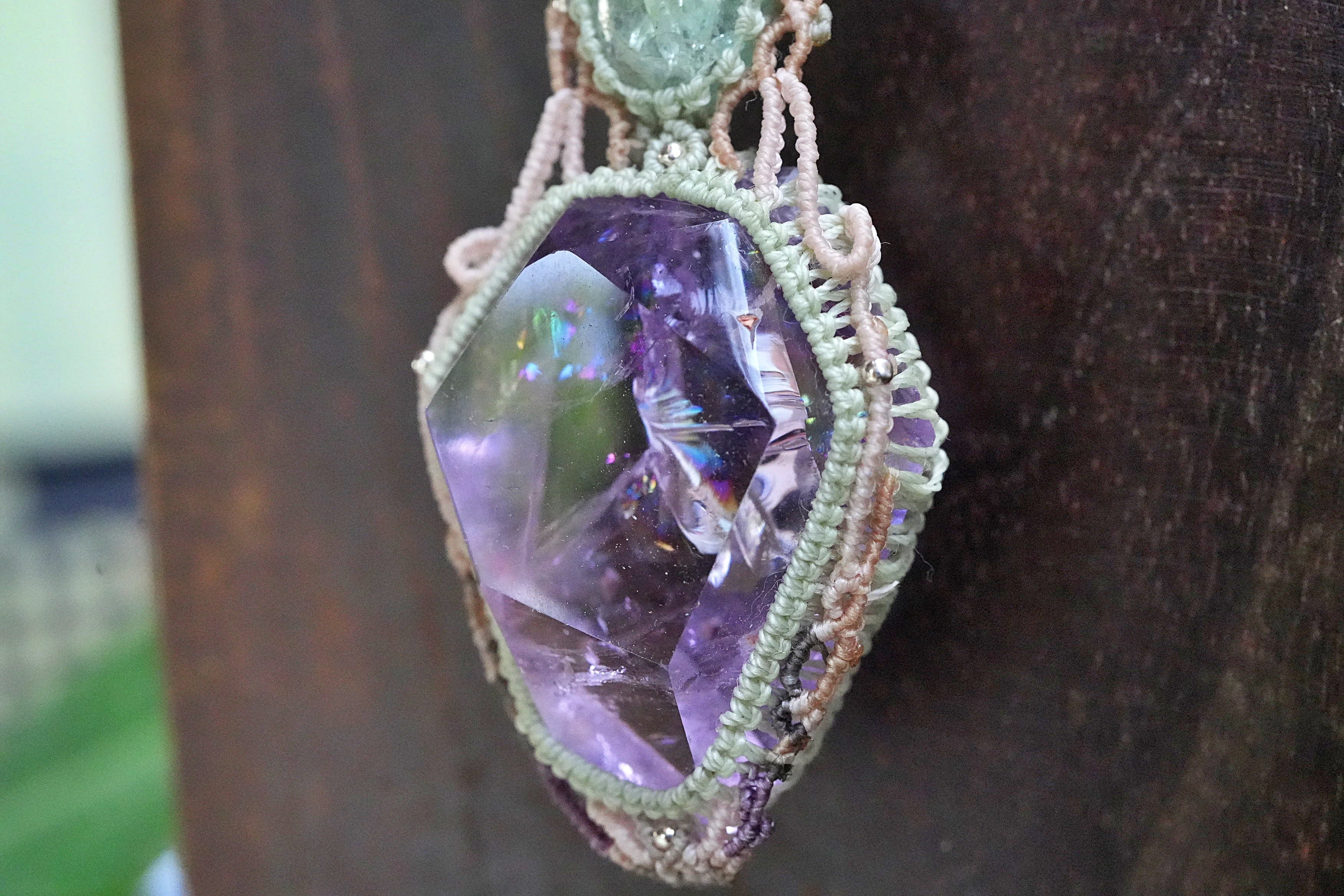 このたびは虹の見える2つの石をひとつにマクラメ編み装飾。