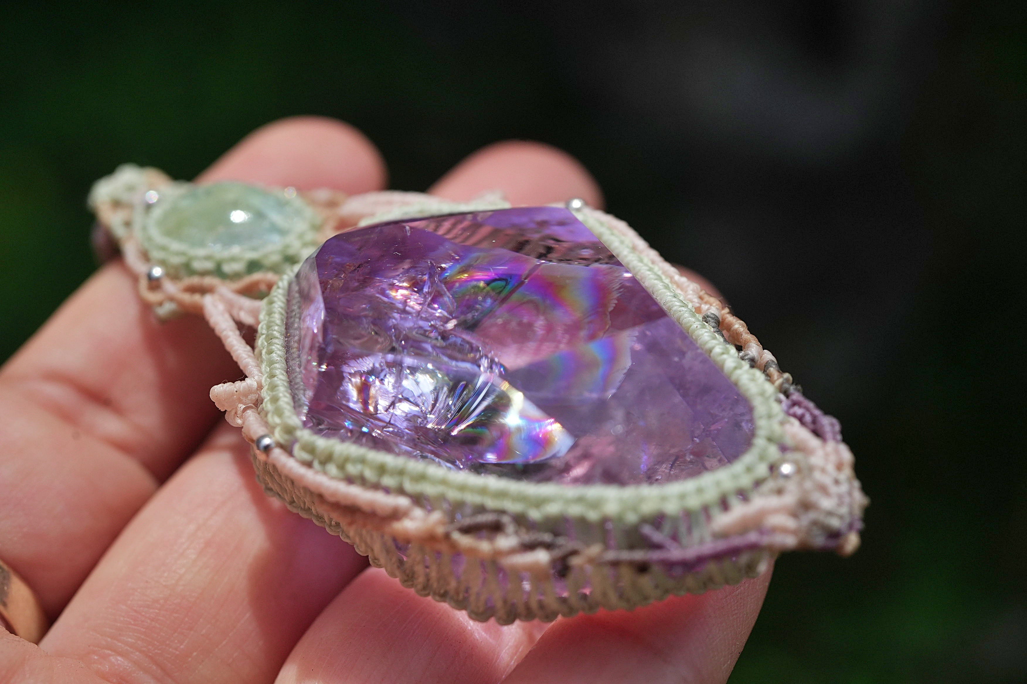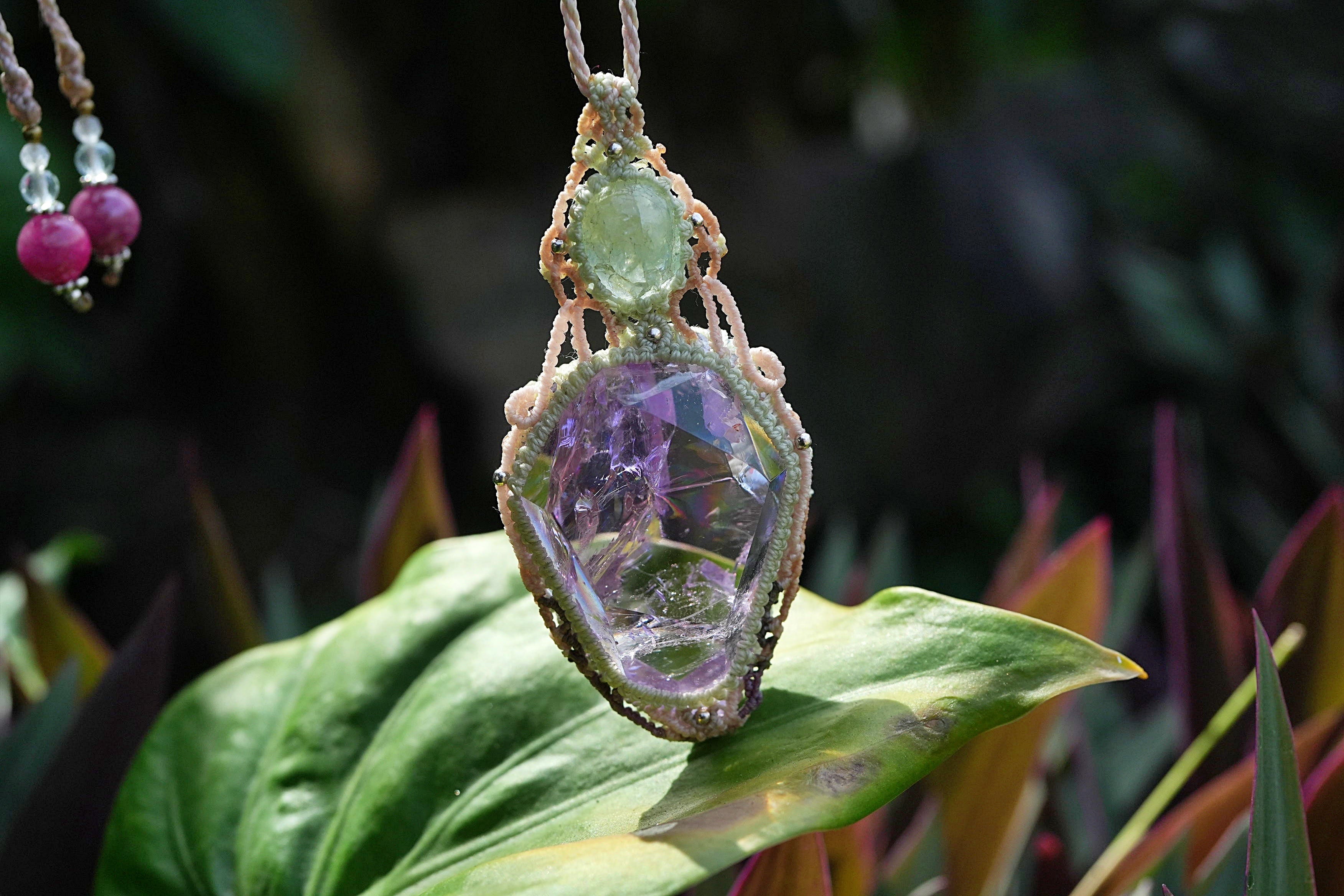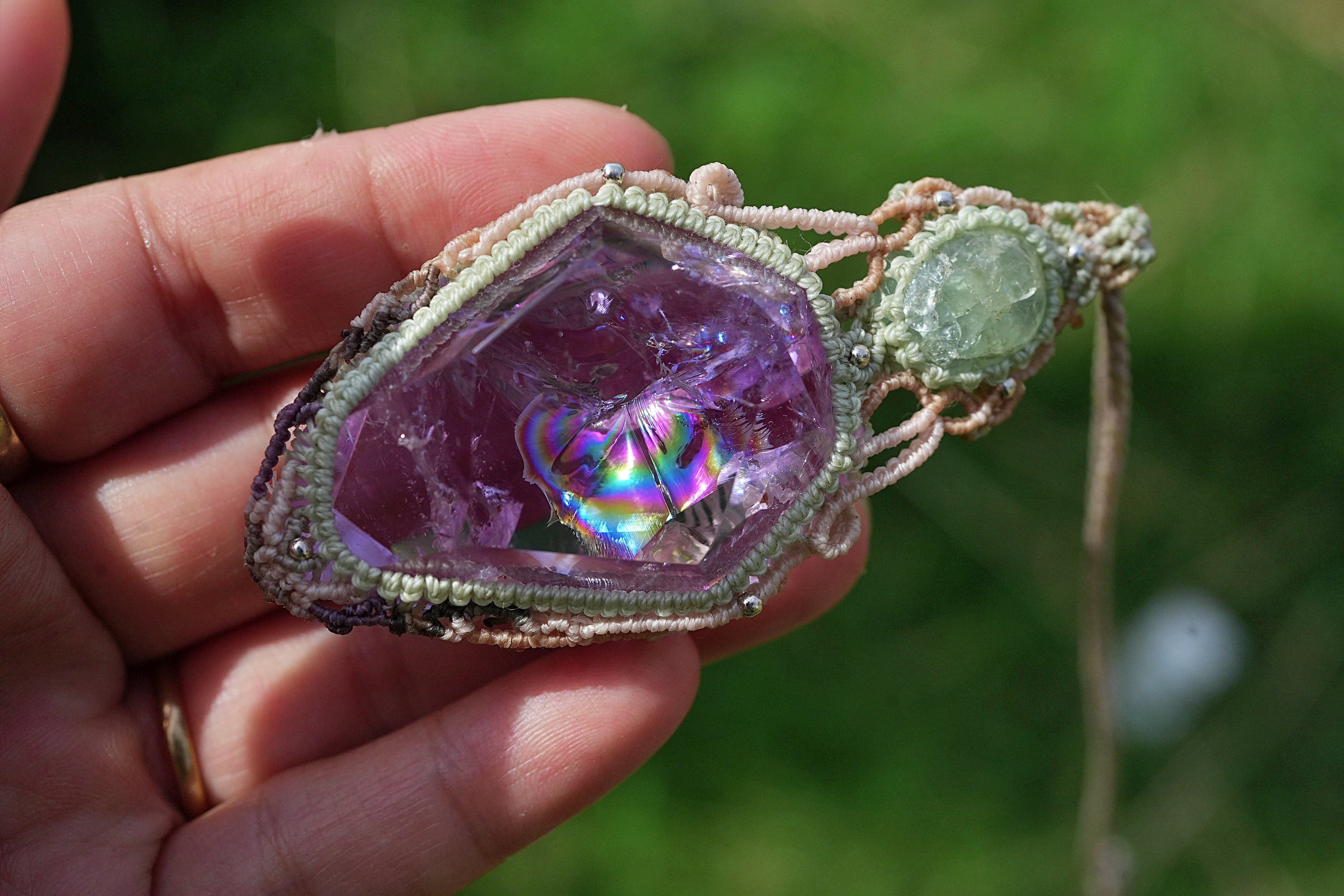 このたびは虹の見える2つの石をひとつにマクラメ編み装飾。