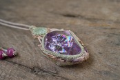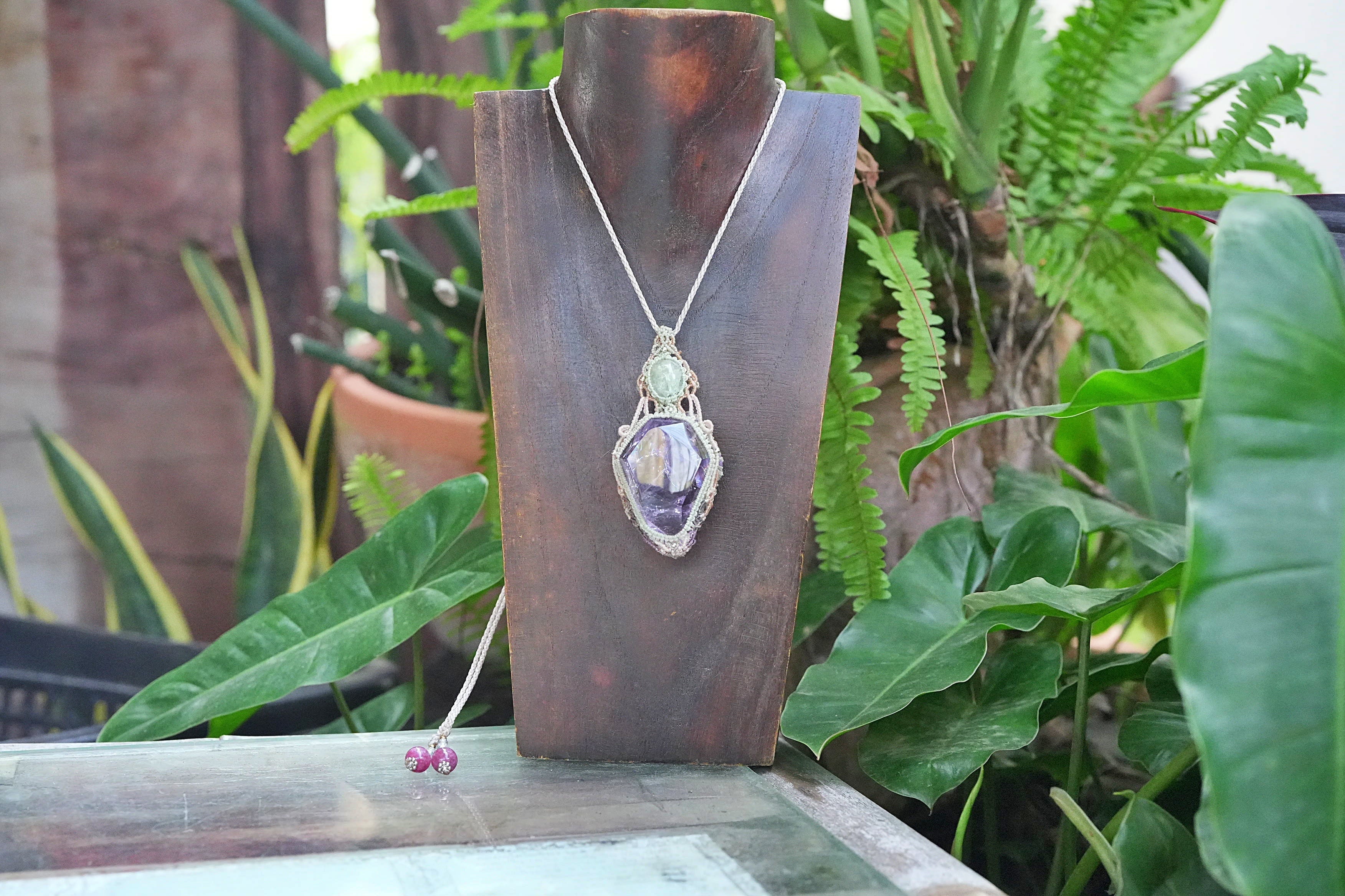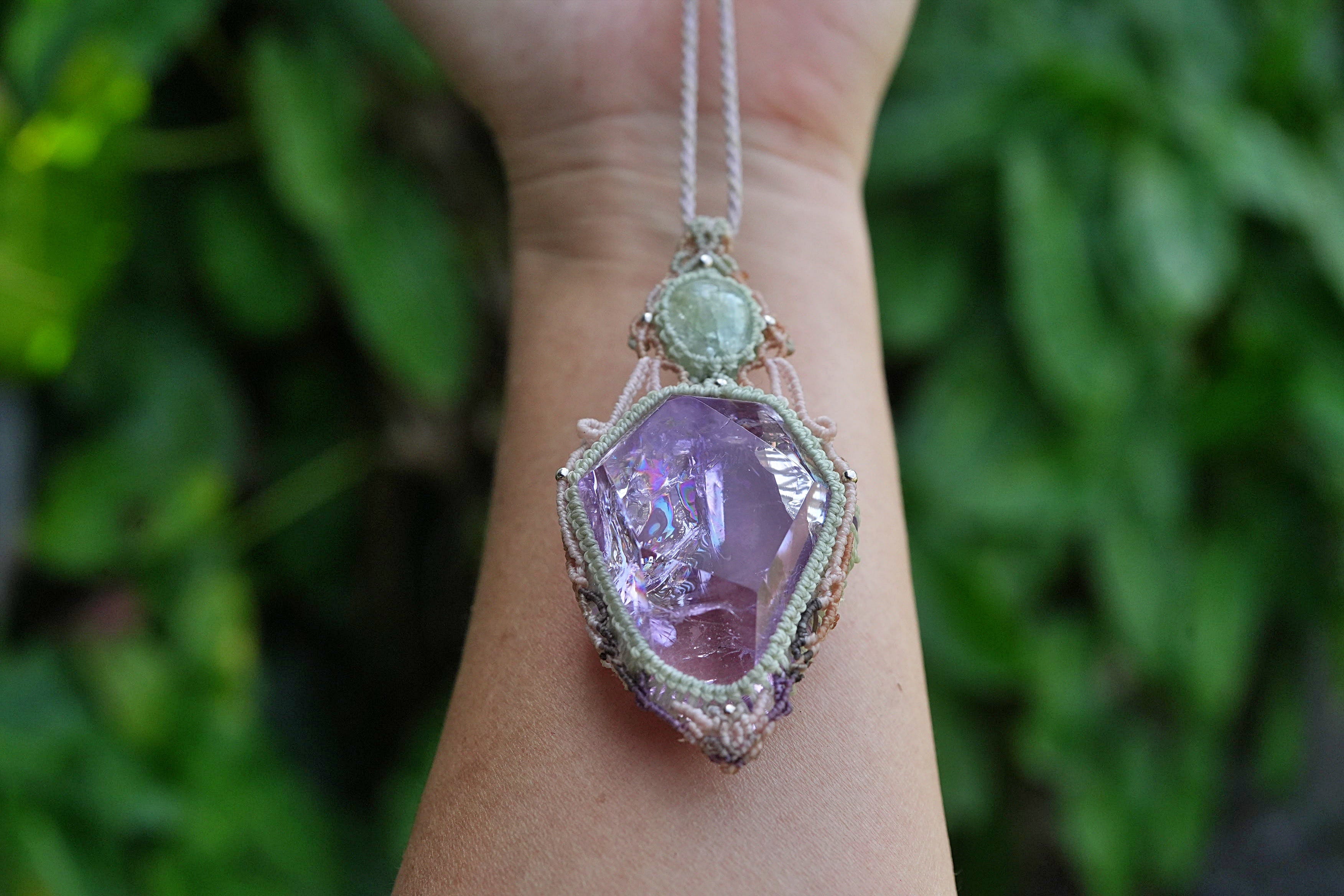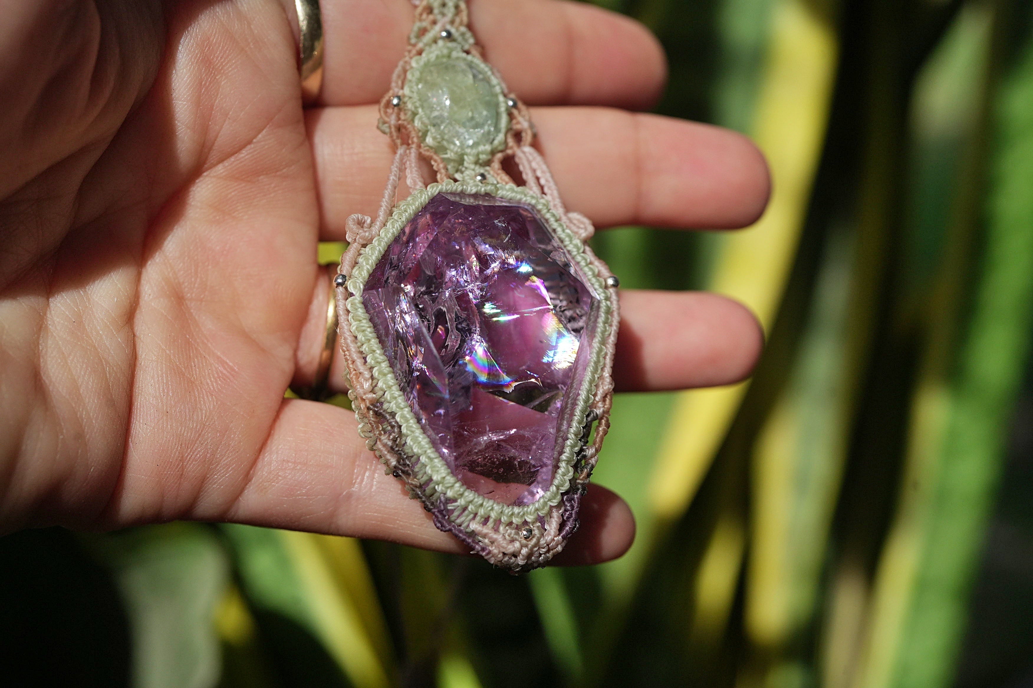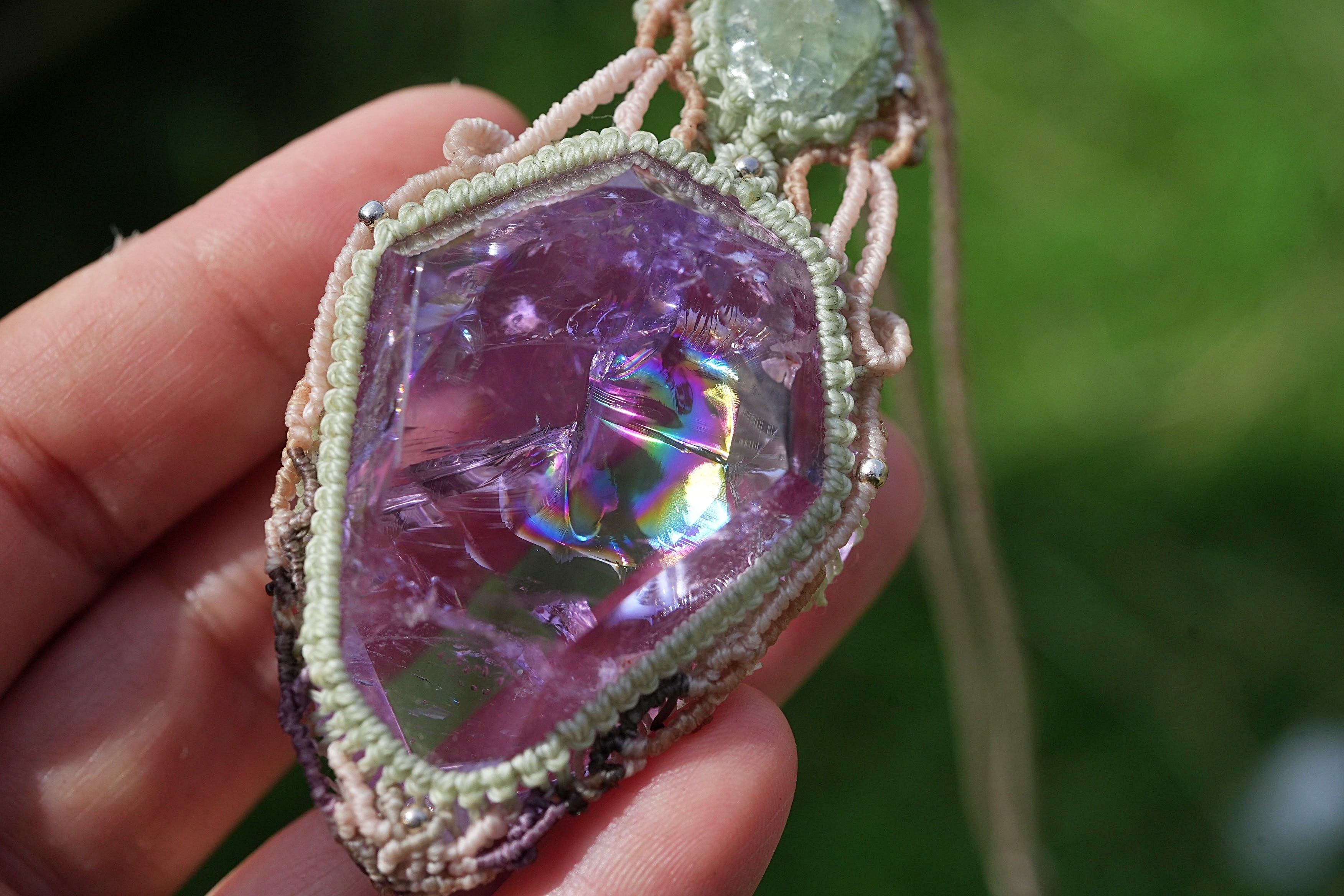 このたびは虹の見える2つの石をひとつにマクラメ編み装飾。