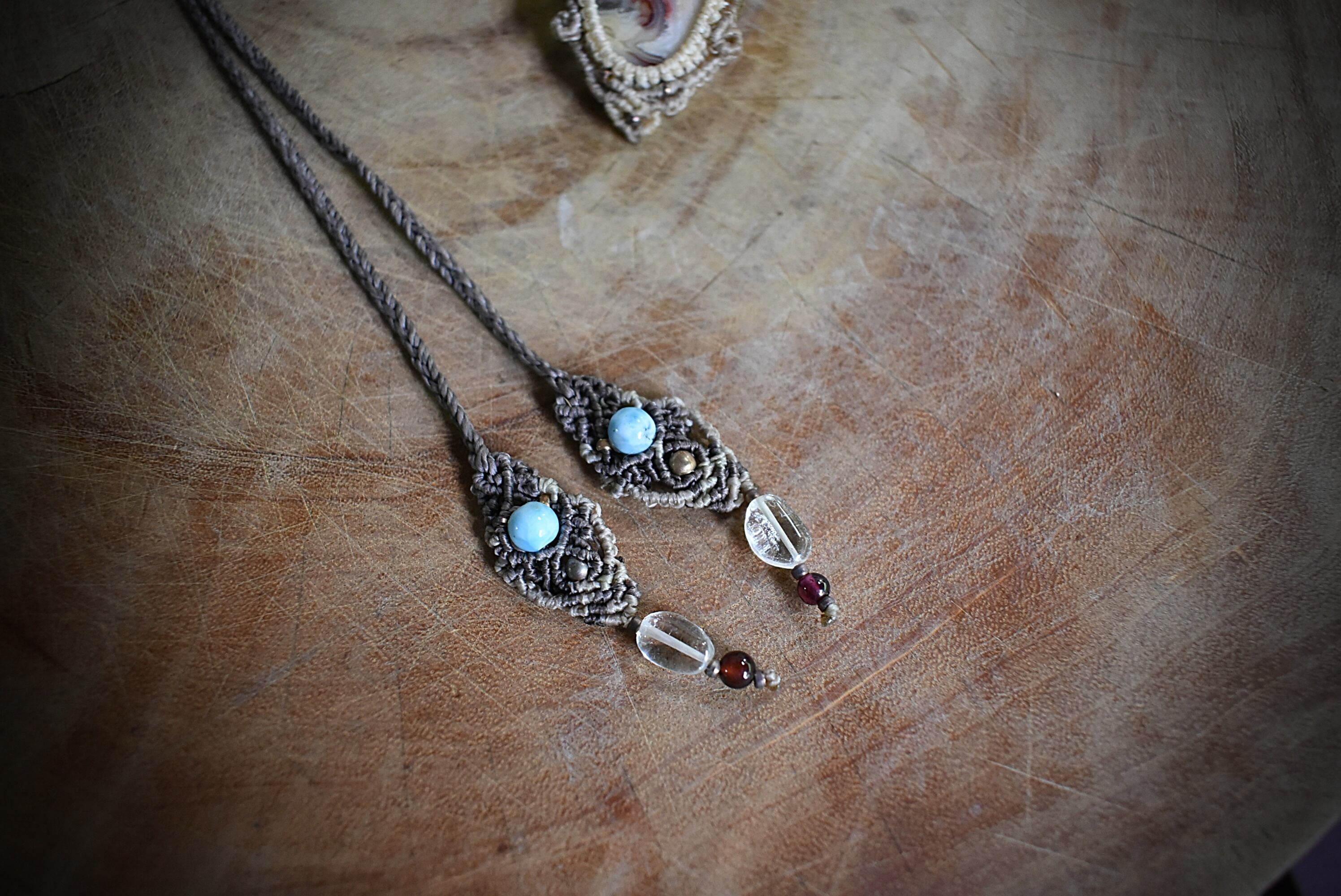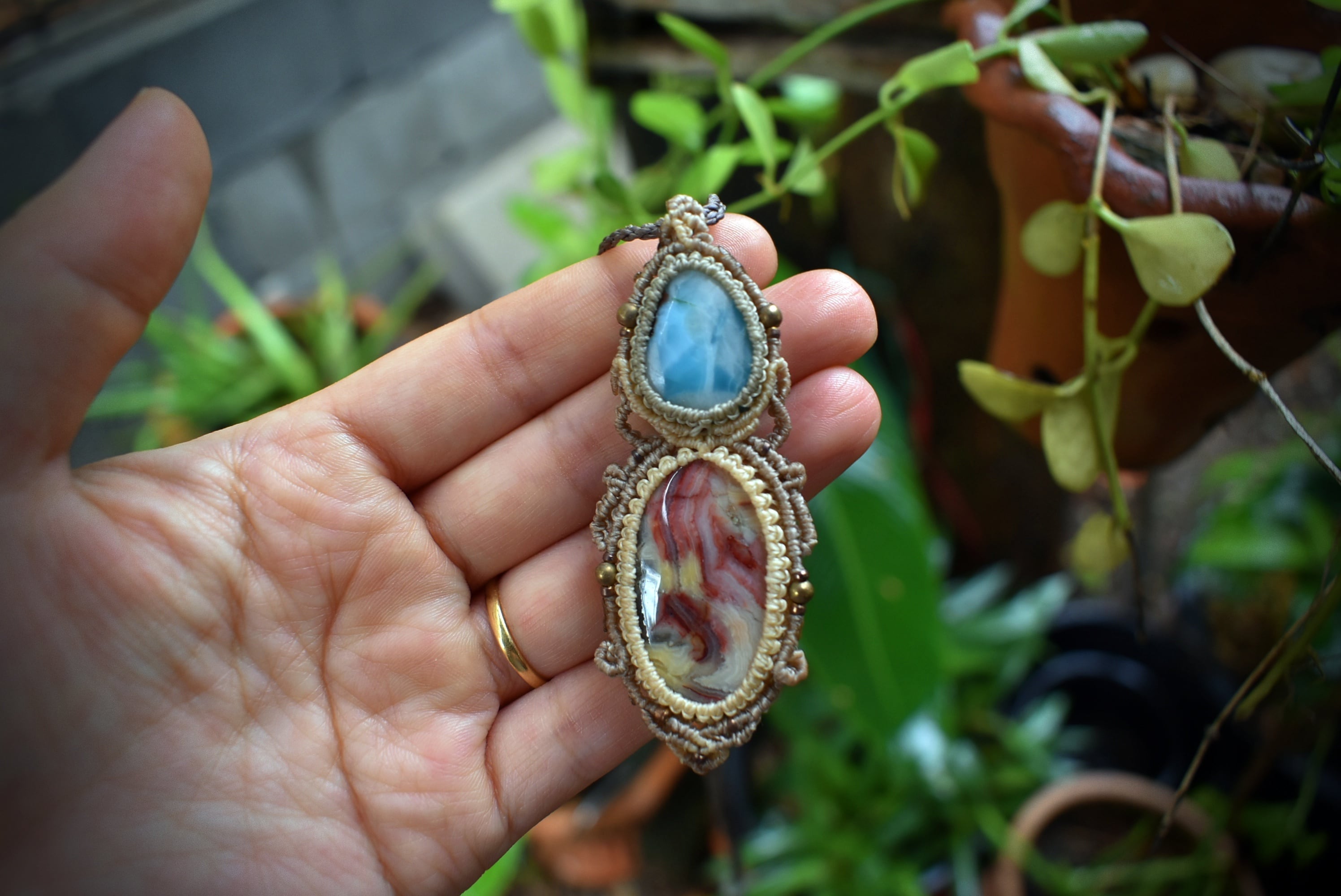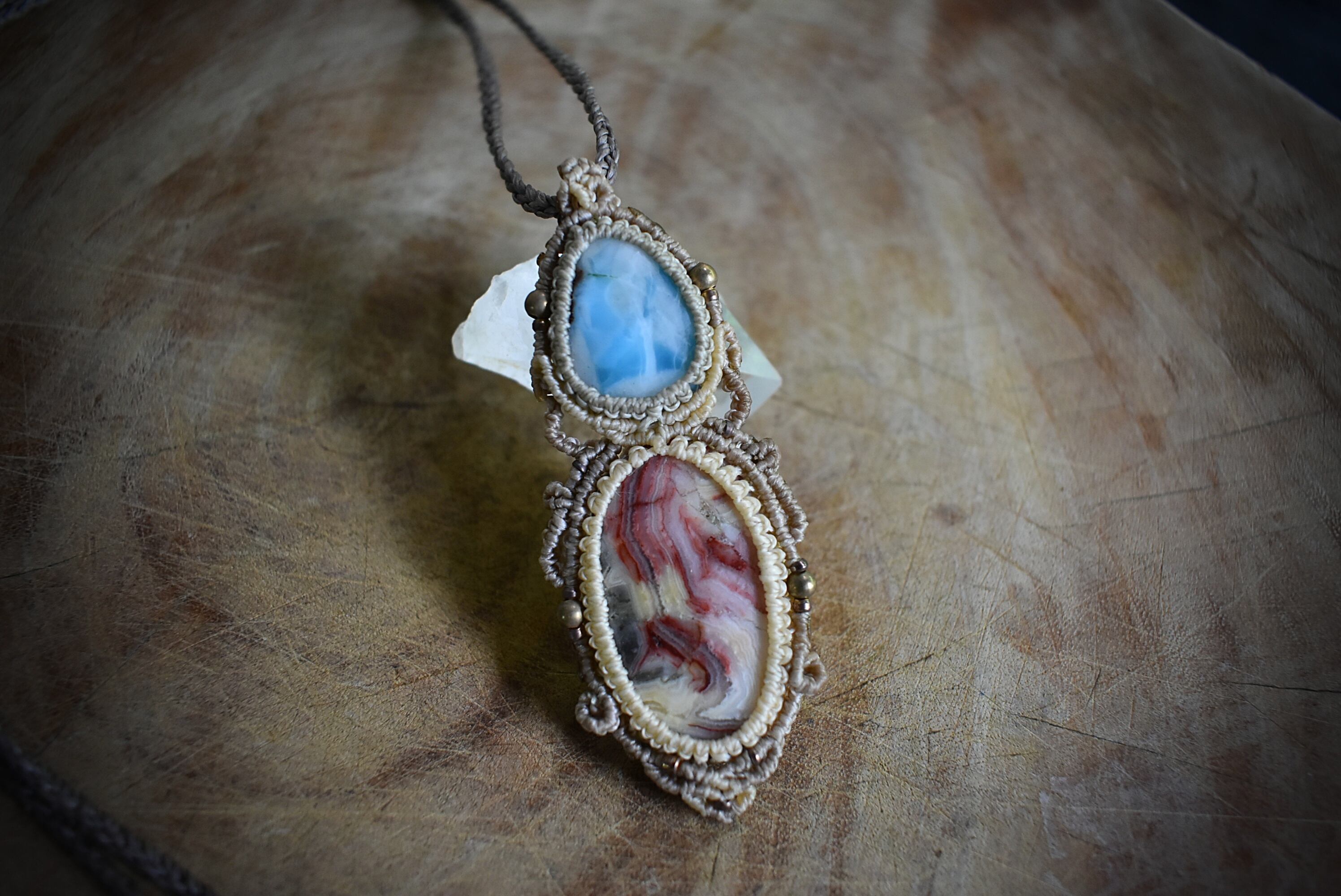 はっきりとした色味と模様が特徴的なラリマーとアーティスティックな柄が目に止まる赤い色味を持ち合わせたクレイジーレースアゲートを組み合わせて、この石の普遍的な動きに合わせてマクラメ編み装飾を施し、ペンダントに仕上げました。