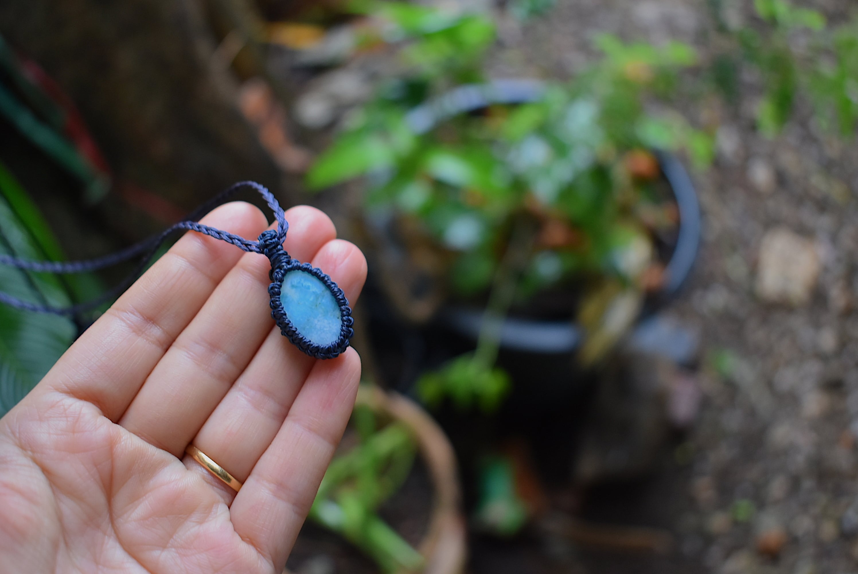 ◆このたびは紺色の蝋引き糸を使用しマクラメ編み装飾を施しました。