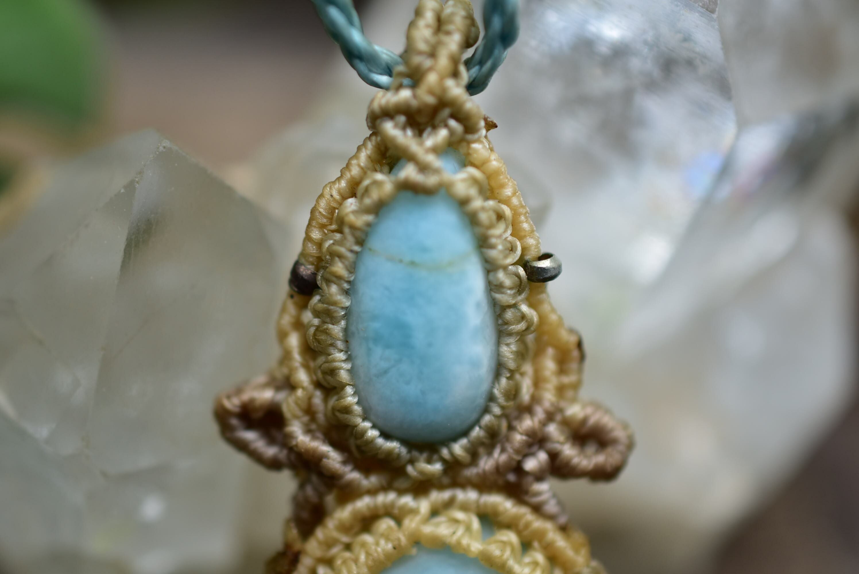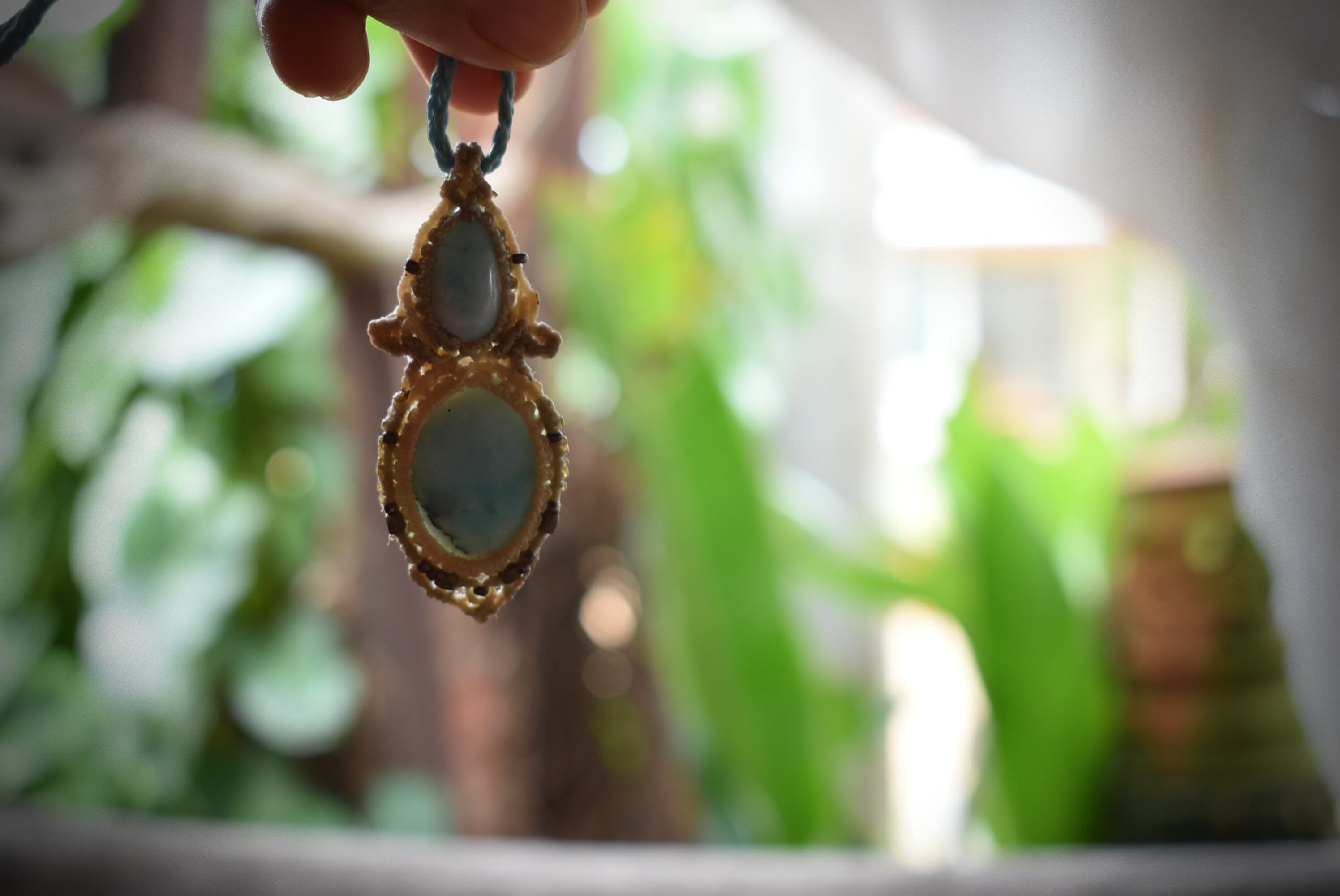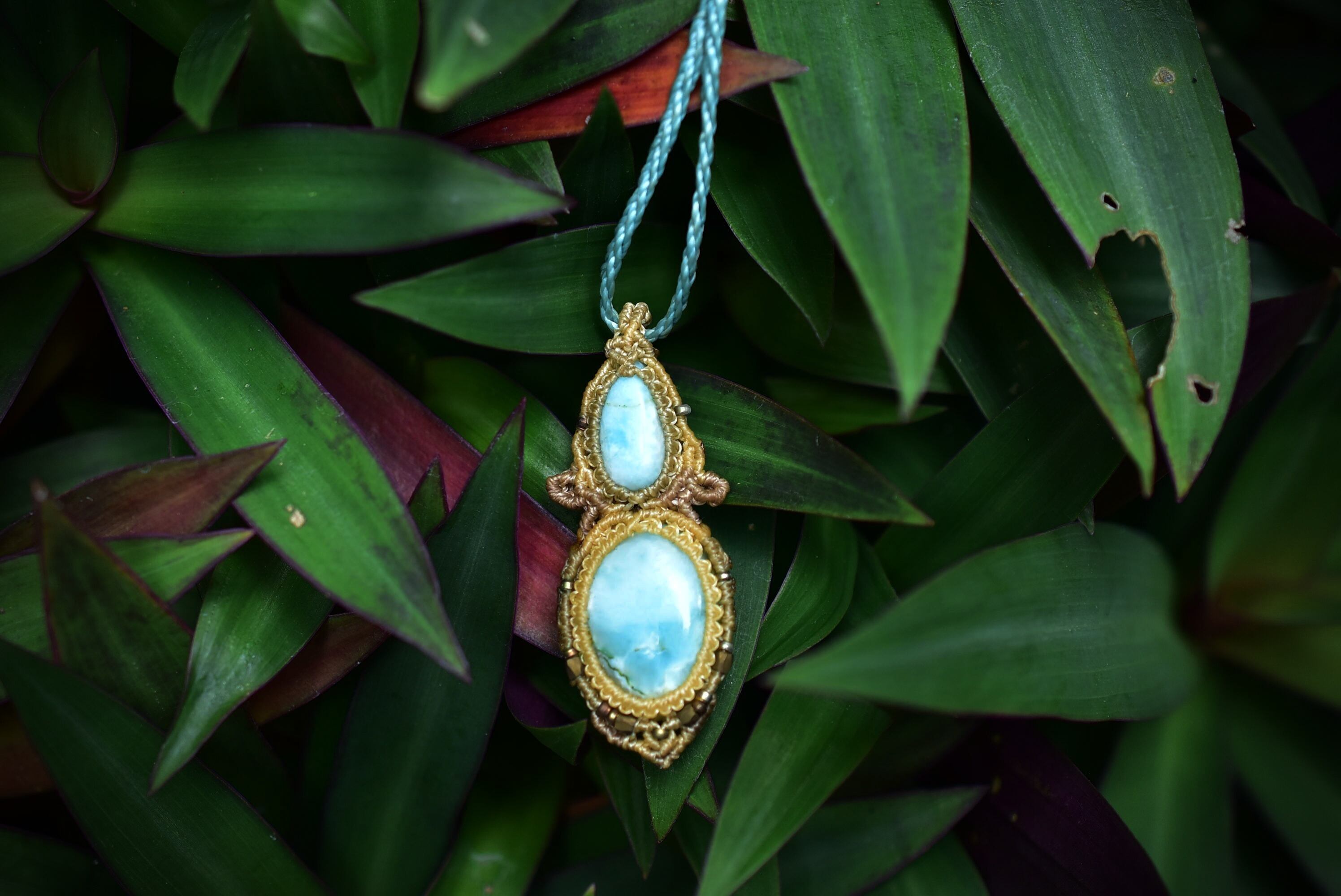 ほんわかした色味のラリマー2つをマクラメ編み装飾を施して仕上げました。女性の癒しにオススメするラリマーの色味は本当に爽やかで、自然界の優しい海の色を想像させてくれる石です。このたびはそんなラリマーふたつをベージュ系の糸を重ねて使用し、ペンダントに仕上げました。