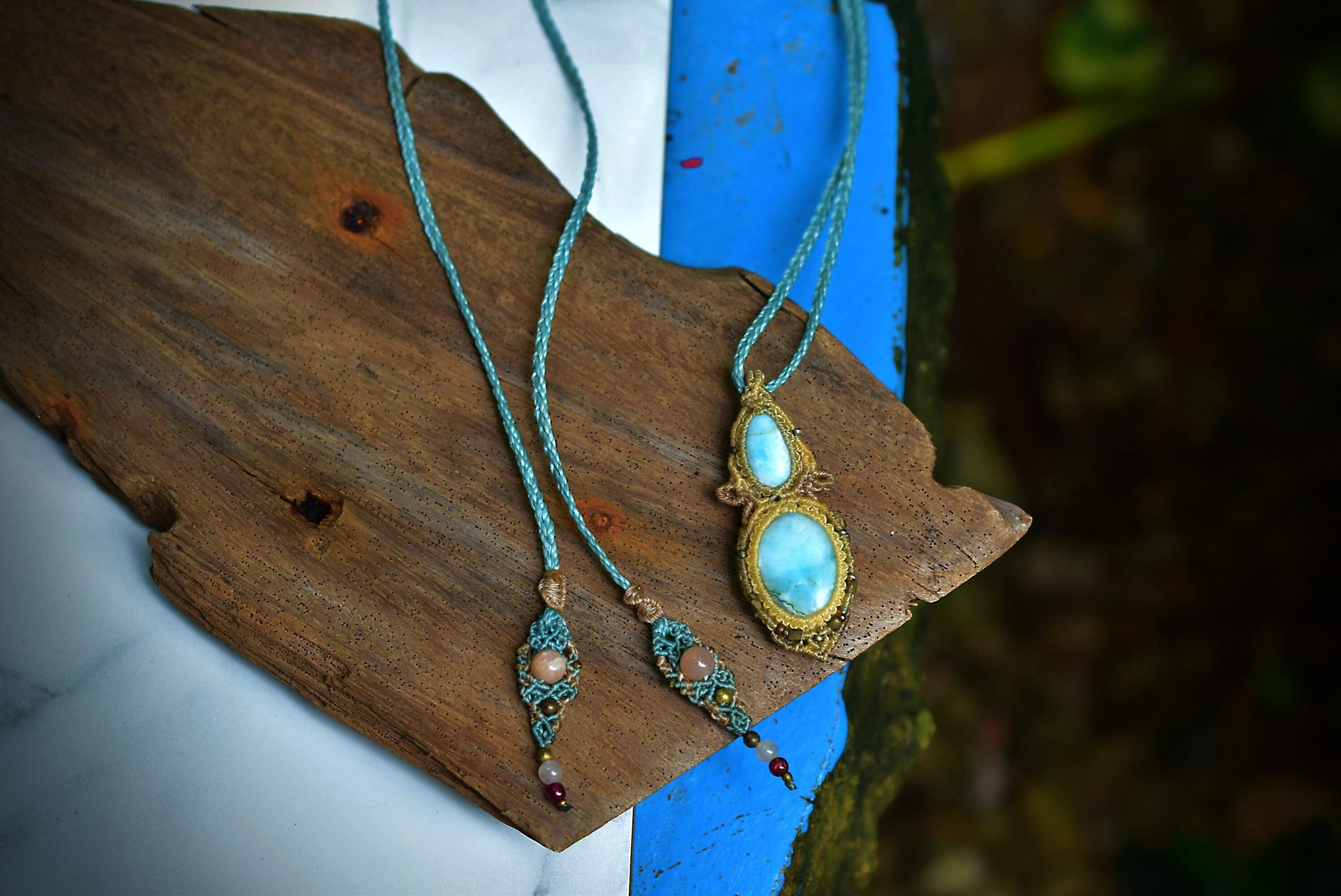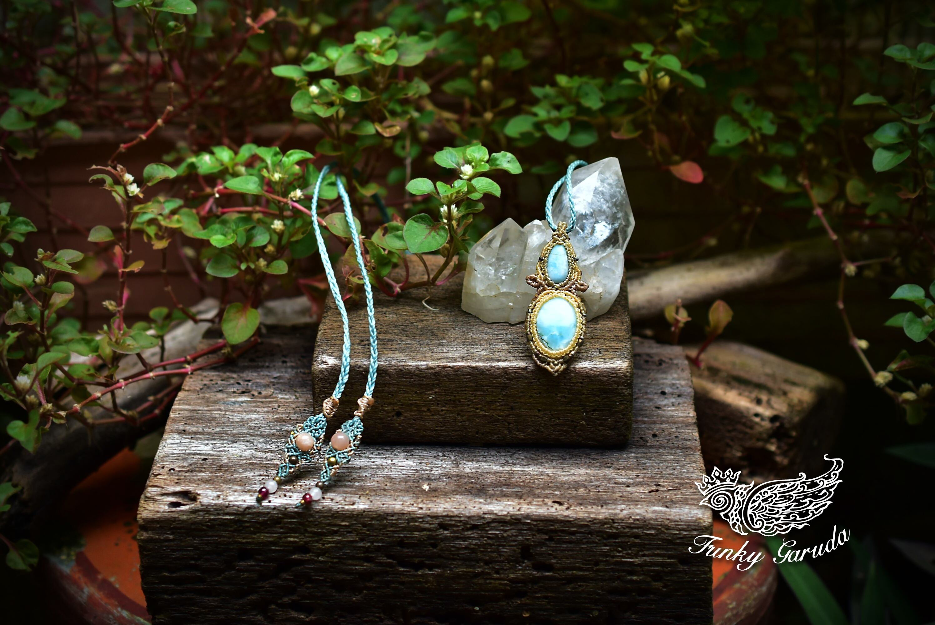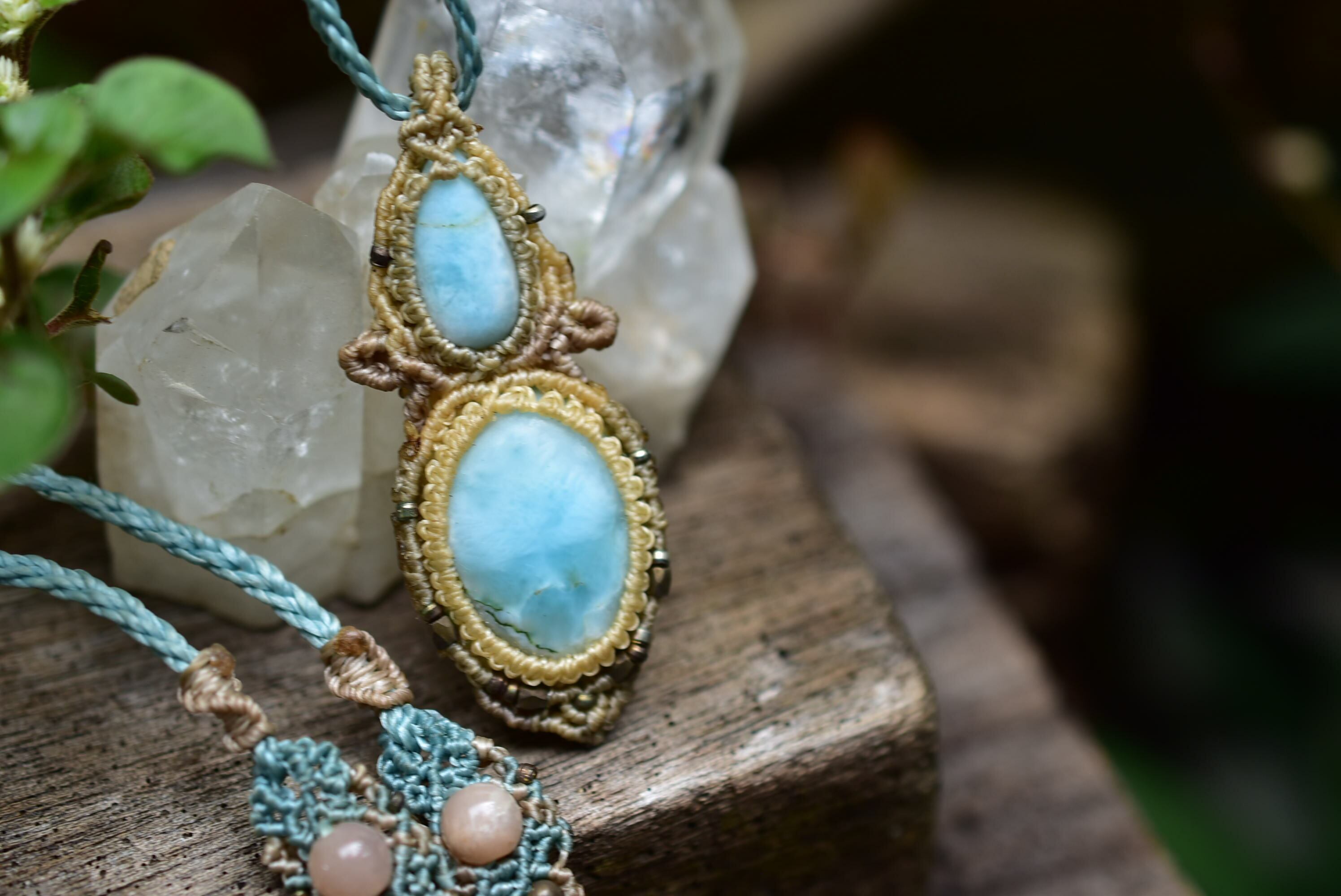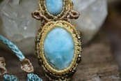 ほんわかした色味のラリマー2つをマクラメ編み装飾を施して仕上げました。女性の癒しにオススメするラリマーの色味は本当に爽やかで、自然界の優しい海の色を想像させてくれる石です。このたびはそんなラリマーふたつをベージュ系の糸を重ねて使用し、ペンダントに仕上げました。